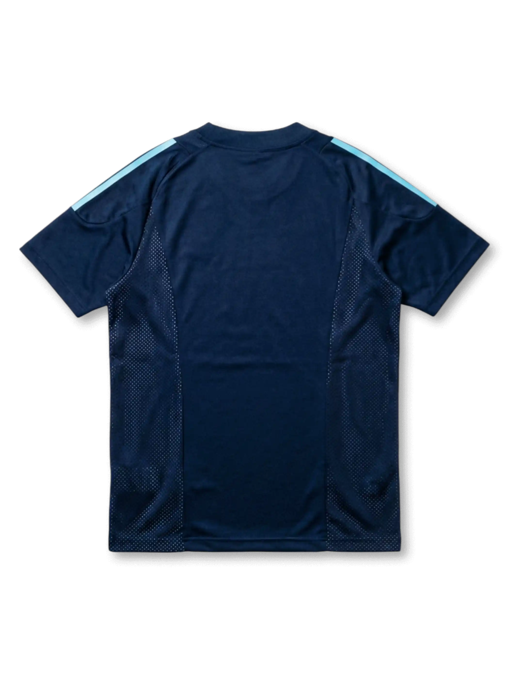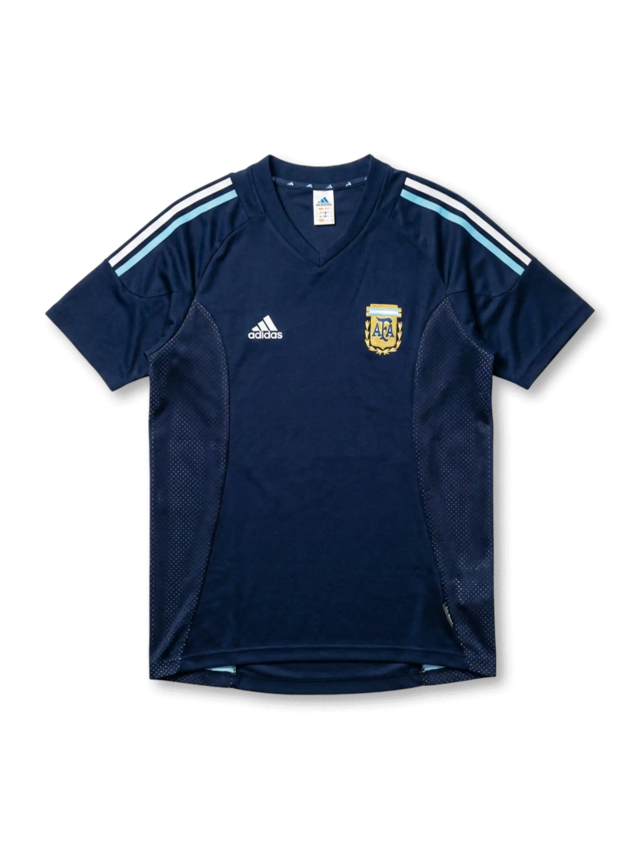 ネイビーのベース生地に脇腹から裾にかけてドット状メッシュパネルを左右対称に配置し、通気性と視覚的な構造美を両立した2002年大会特有のデザインを採用。肩部にスカイブルー×ホワイトのダブル3本ストライプ、Vネック、裾にスカイブルーのアクセントパイピング。左胸にadidasロゴ(白)、右胸にAFAゴールド月桂樹入りエンブレムを配したadidas Climacool素材採用の大会正規品復刻モデル。