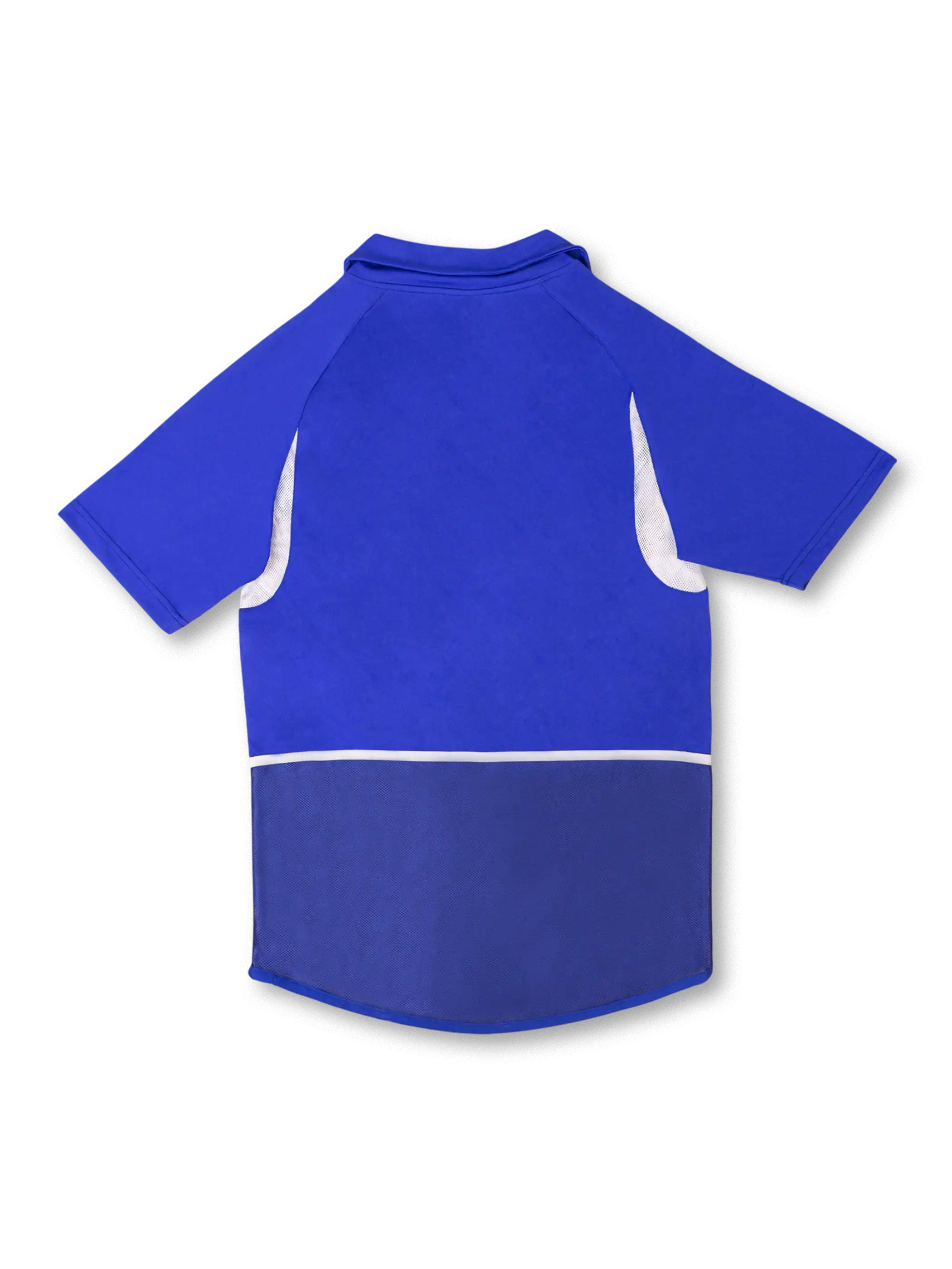 力強いブルーとホワイトパネルを組み合わせた2002年アウェイモデルで、Nikeの通気メッシュと立体カッティングにより試合用らしい運動性能を確保。左胸には五つ星のCBFエンブレムが配置され、02年W杯制覇期の象徴としてコレクション価値が高い一着。