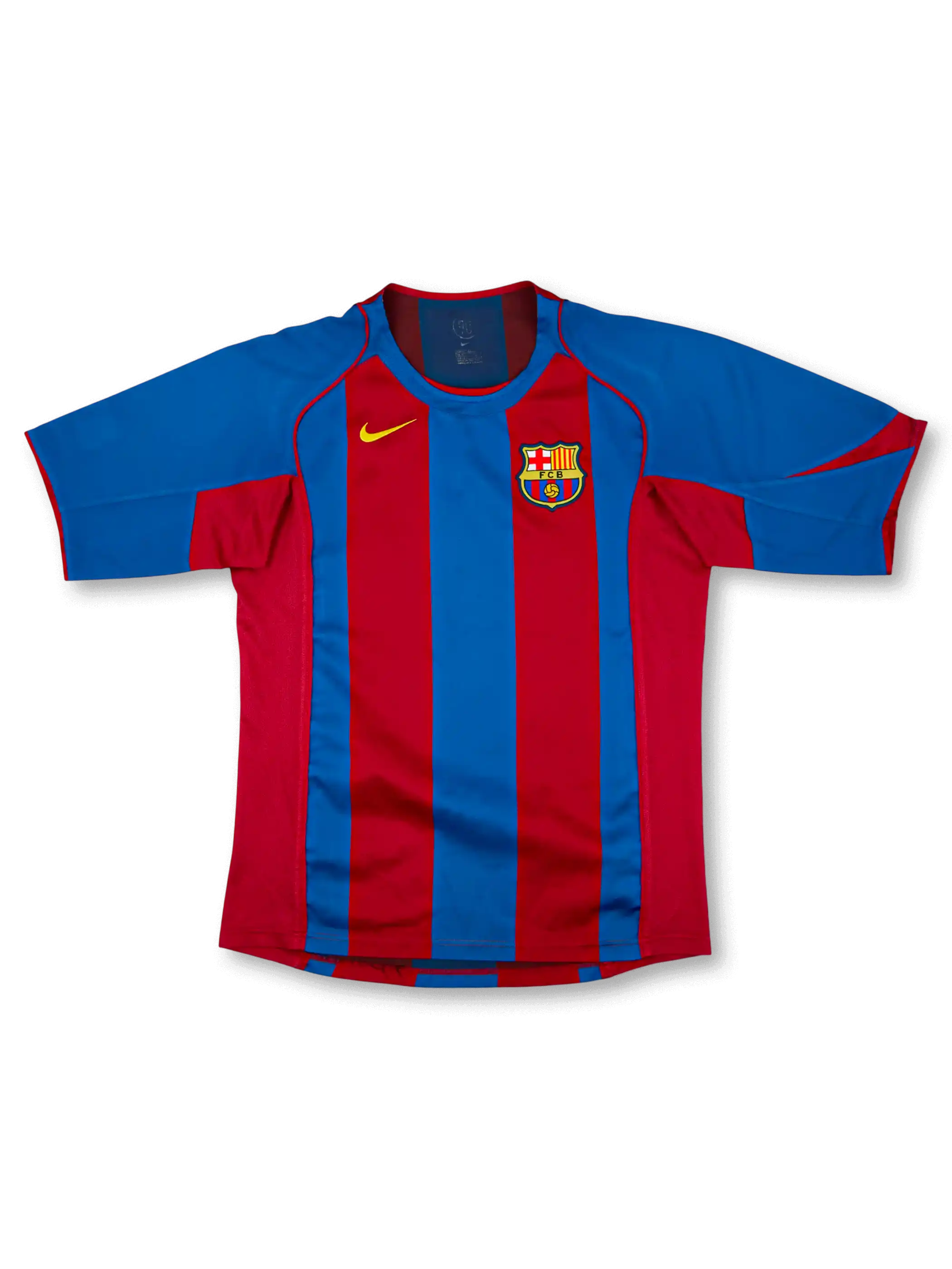 ブルー×レッドの均等縦ストライプにゴールドNikeスウッシュ・FCBエンブレム、スポンサーなし仕様のNike製2004-05シーズンホームモデル。