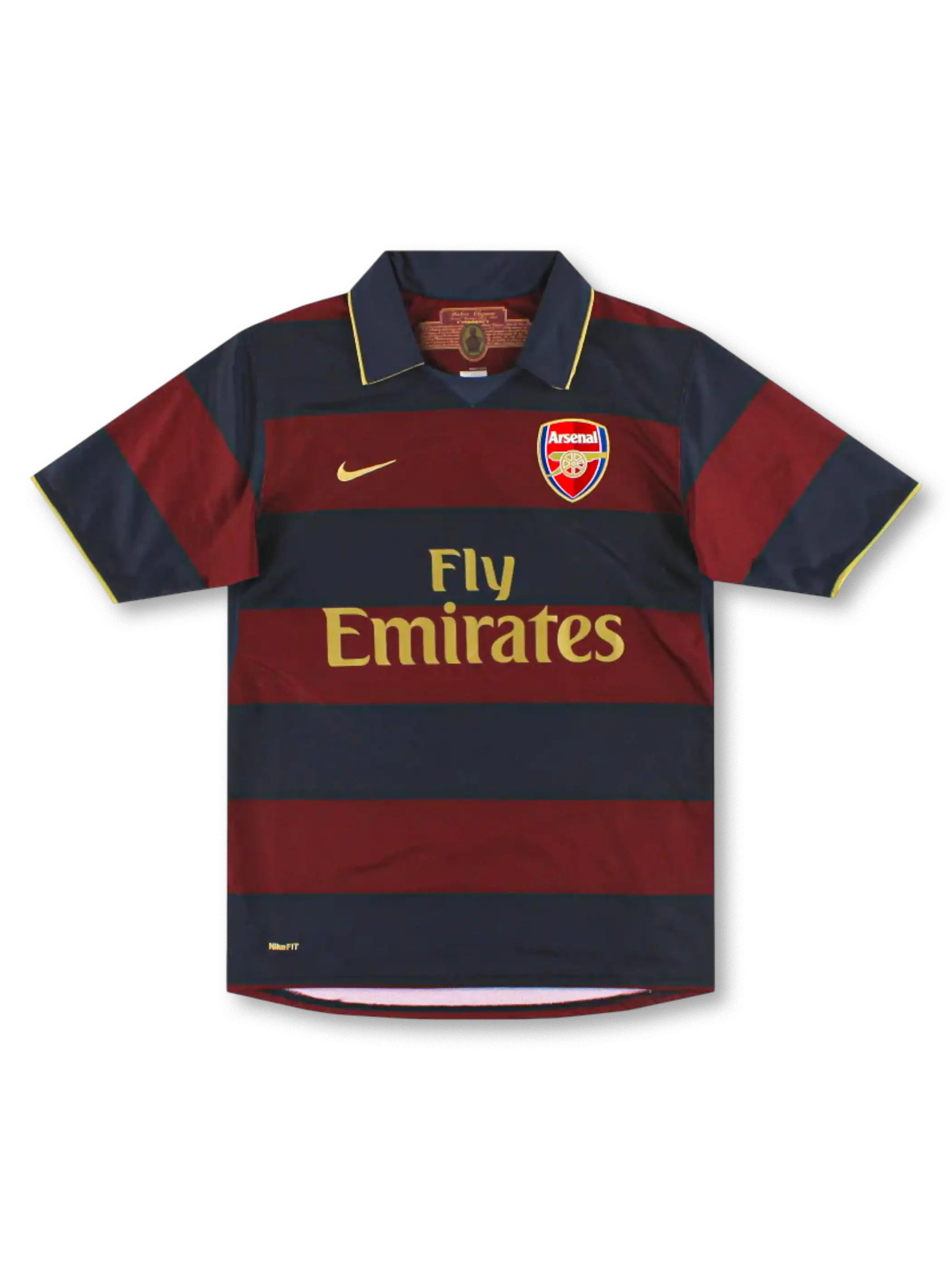 2007-08年アーセナルのサードモデルは、深紅とネイビーの太横ストライプを特徴とし、Nike製のクラシックなデザインが印象的な一着。