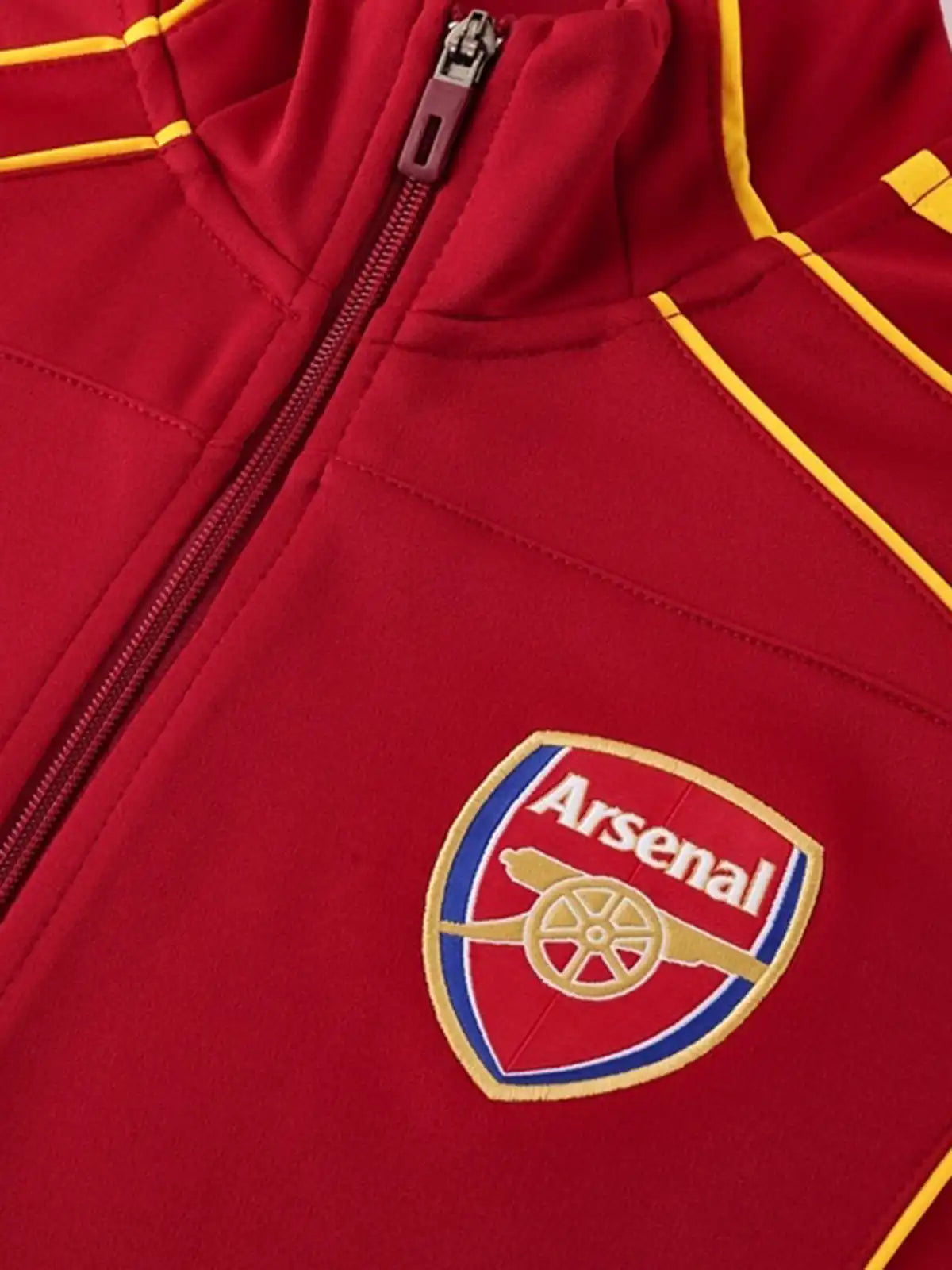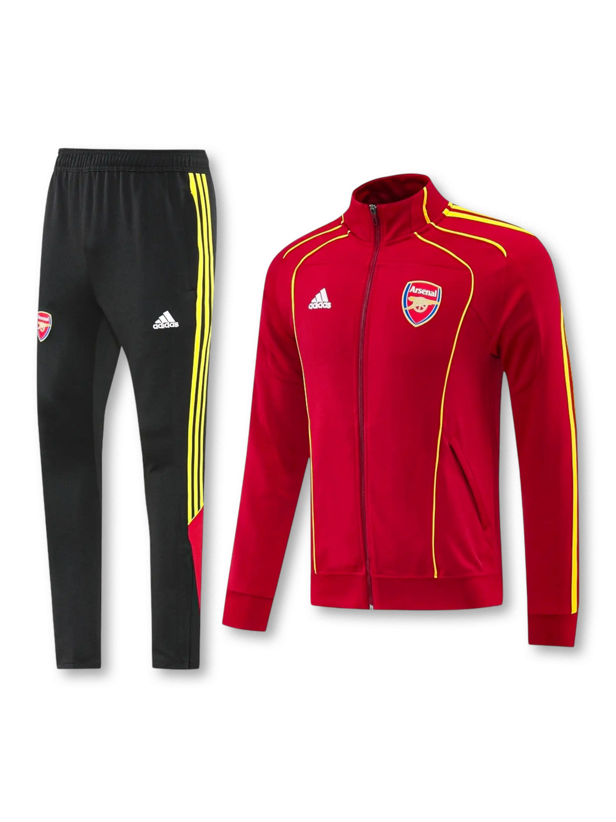 クラブを象徴するレッドを基調に、イエローのパイピングとブラックパンツを組み合わせた視認性の高い配色設計で、adidasロゴとクラブエンブレムをバランス良く配置し、トレーニング時の動きやすさと日常使用を想定した実用的なシルエットに仕上げられている。