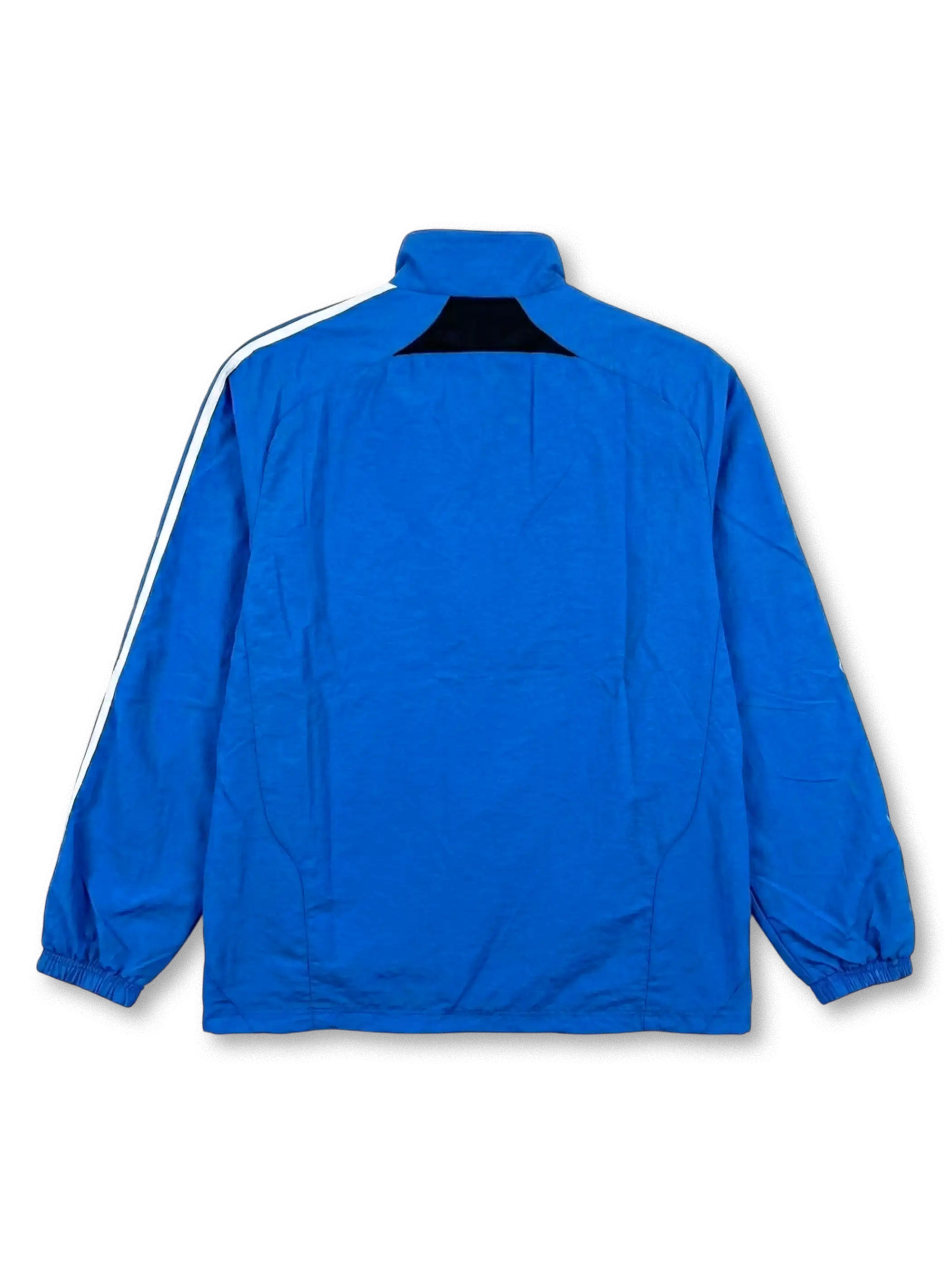 クラブカラーのブルーを基調とした防水ウインドブレーカージャケット。軽量シェル素材を採用し、肩のスリーストライプと胸元のクラブエンブレムが当時の公式トレーニング仕様を示す。フルジップ構造とスタンドカラーにより、移動時や雨天対応を想定した実用的な設計となっている。