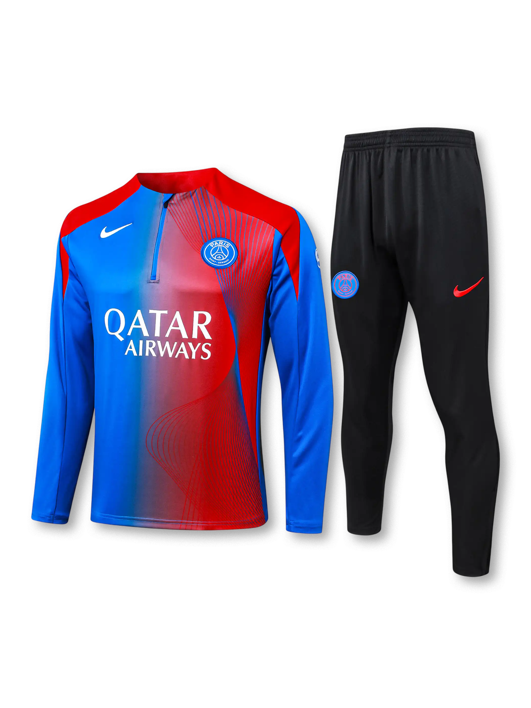 ブルーとレッドのコントラストが印象的な、パリ・サンジェルマン仕様のハーフジップトレーニングセット。