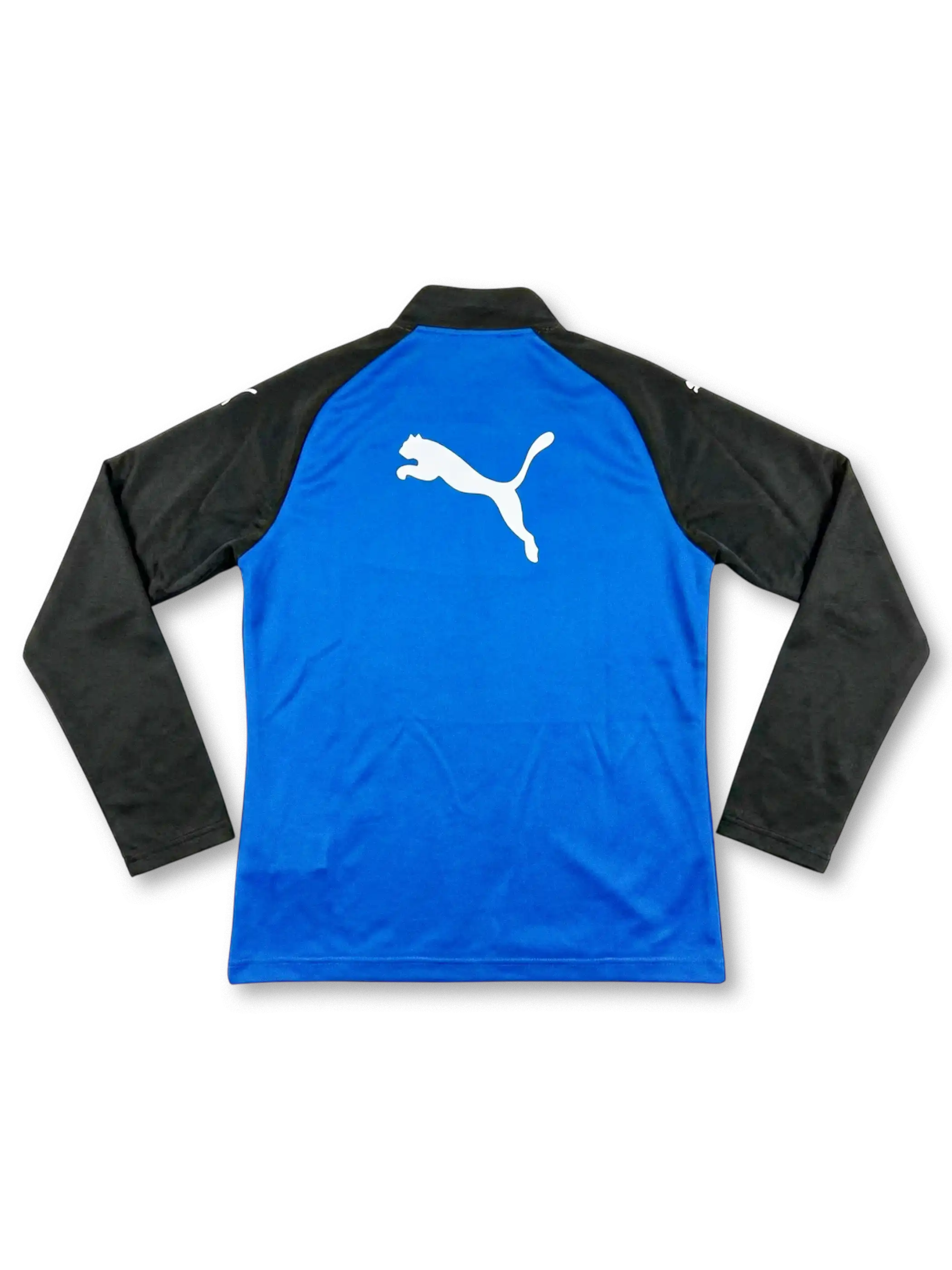 クラブカラーであるブルーを主体に、ブラックスリーブを組み合わせたトレーニング用ジャケット。フルジップ構造とスタンドカラーを採用し、胸部にはクラブエンブレムとスポンサーロゴ、背面にはPumaロゴを配置。軽量素材による動きやすさを重視した実用的な設計となっている。