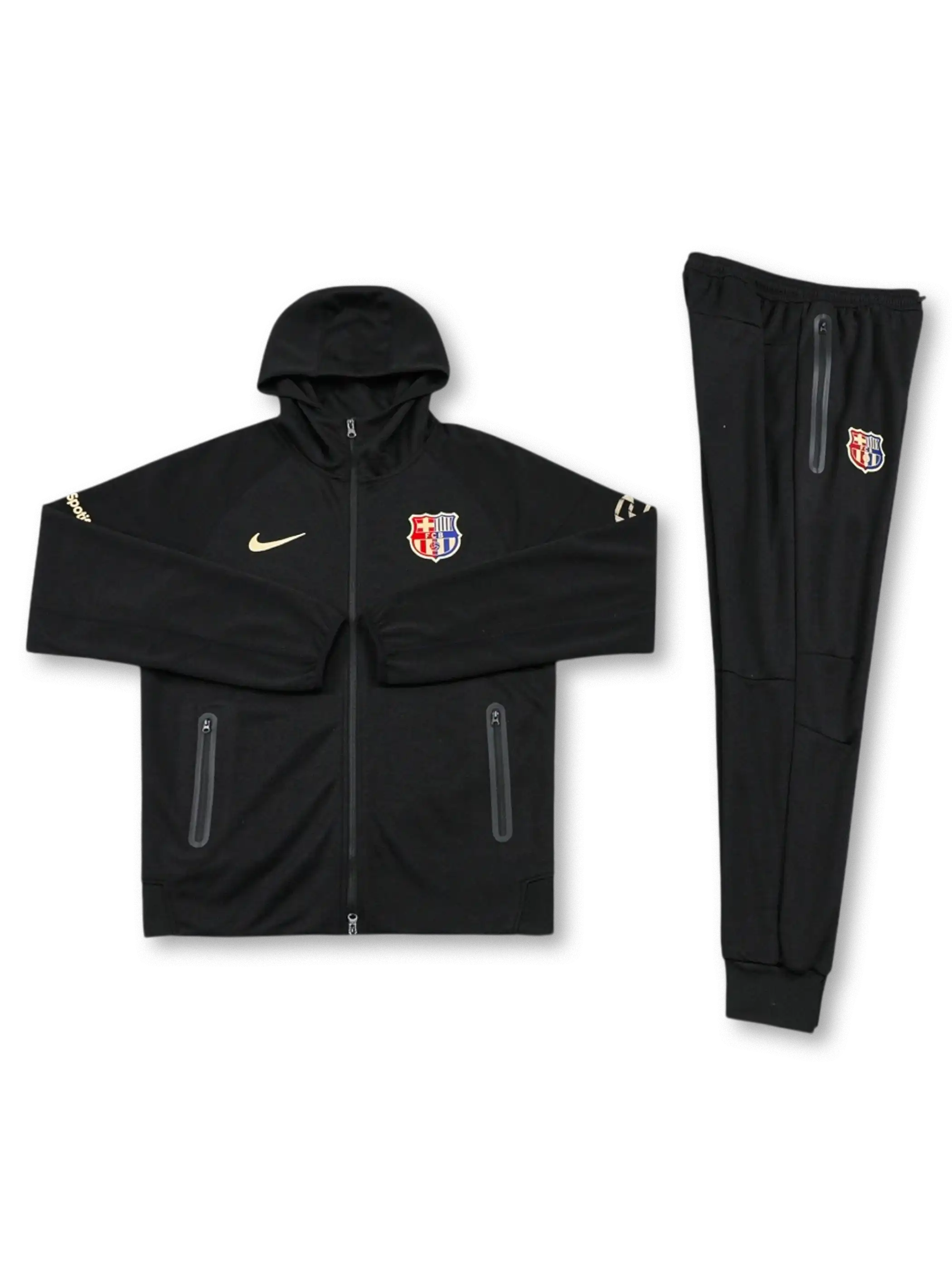 マットなブラックカラーをベースに、胸元のスウッシュとクラブエンブレムが明確なコントラストを形成。トップスはフルジップ+フード仕様で、フロントには止水風ジップポケットを配置。パンツはスリムなテーパードシルエットで、トレーニングから移動時まで幅広く対応する機能的なセット。