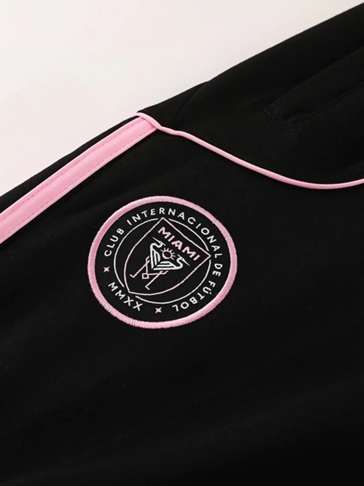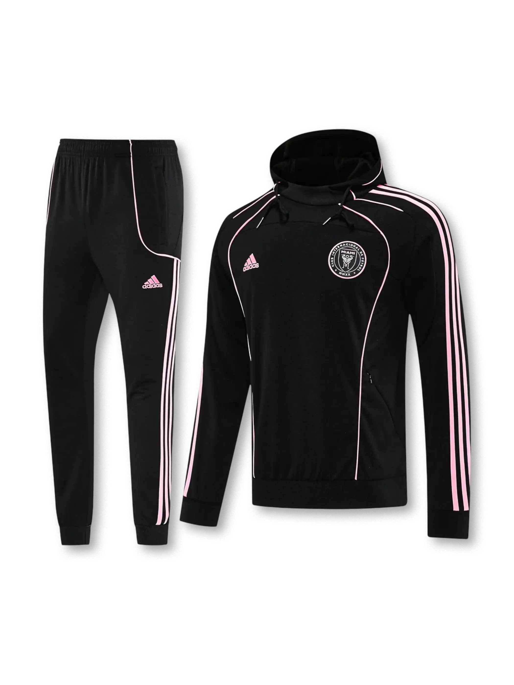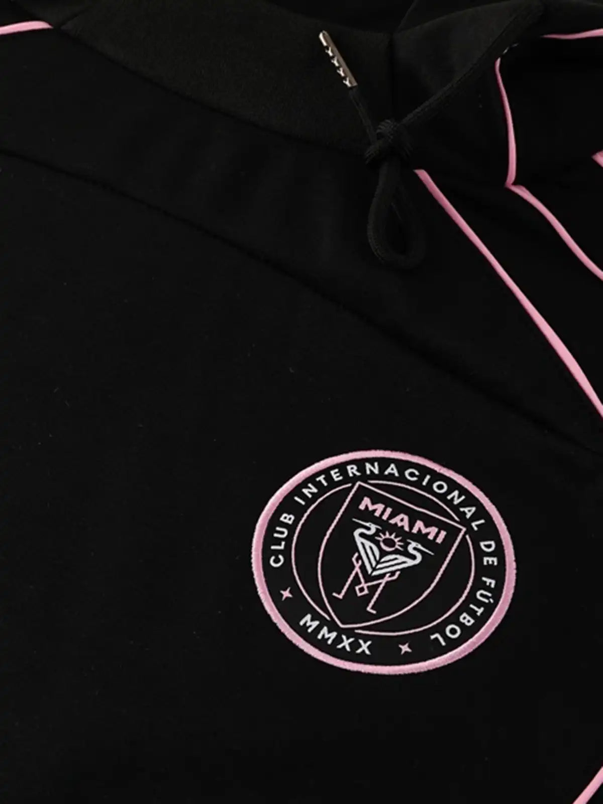 ブラックボディにピンクのスリーストライプとパイピングを配したコントラスト設計。フーディーとパンツ双方にクラブエンブレムを配置し、統一感のあるビジュアルを構成。程よい厚みのスウェット素材を用い、移動着や日常使用に適した快適性とシルエットを両立している。