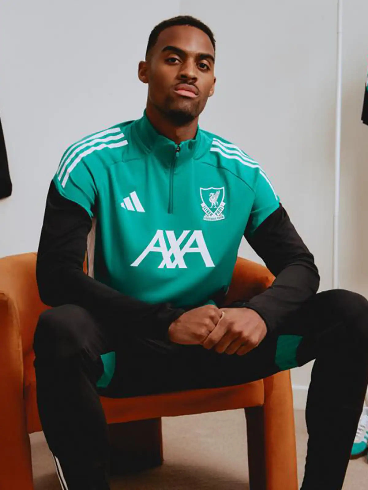 グリーン×ブラック配色を基調としたハーフジップ仕様のトレーニングセット。動きやすさと実用性を重視した現代的なトレーニングデザイン。