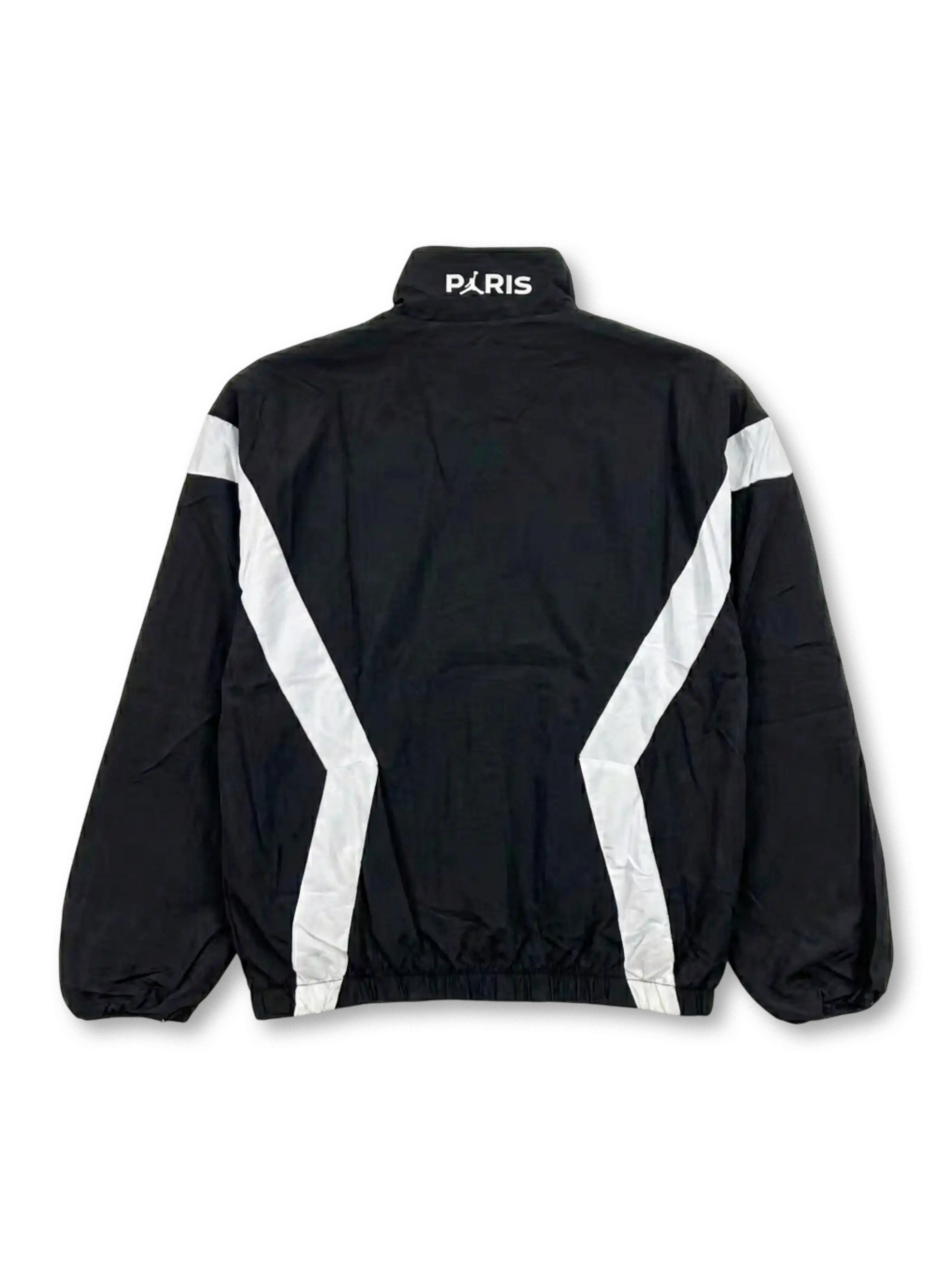 ブラックを基調にホワイトの切替ラインを配置したスポーティな配色で、胸元のジャンプマンロゴとPSGエンブレムがバランス良く配置されたデザイン。軽量ナイロン素材を使用し、ジップポケット付きで実用性も高く、タウンユースとトレーニング両方に対応する現代的なシルエットが特徴。