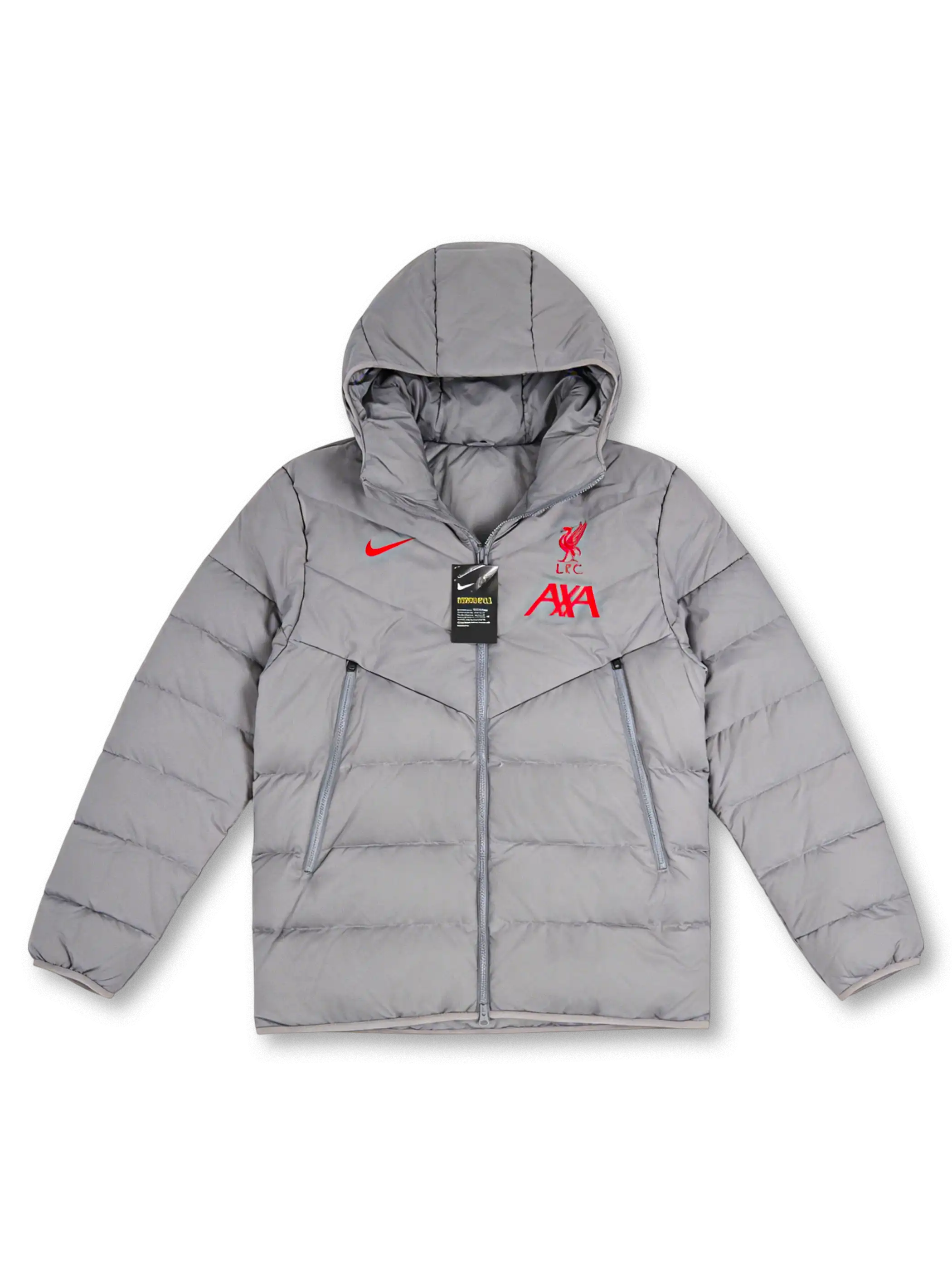 グレーカラーのナイロンボディに、胸元のLFCクレストとNikeスウッシュ、AXAロゴを配置した中綿ジャケット。フード一体型の立体構造とフロントジップ仕様により、防寒性と着脱性を両立し、トレーニング移動時や日常着用にも対応する実用的な設計。