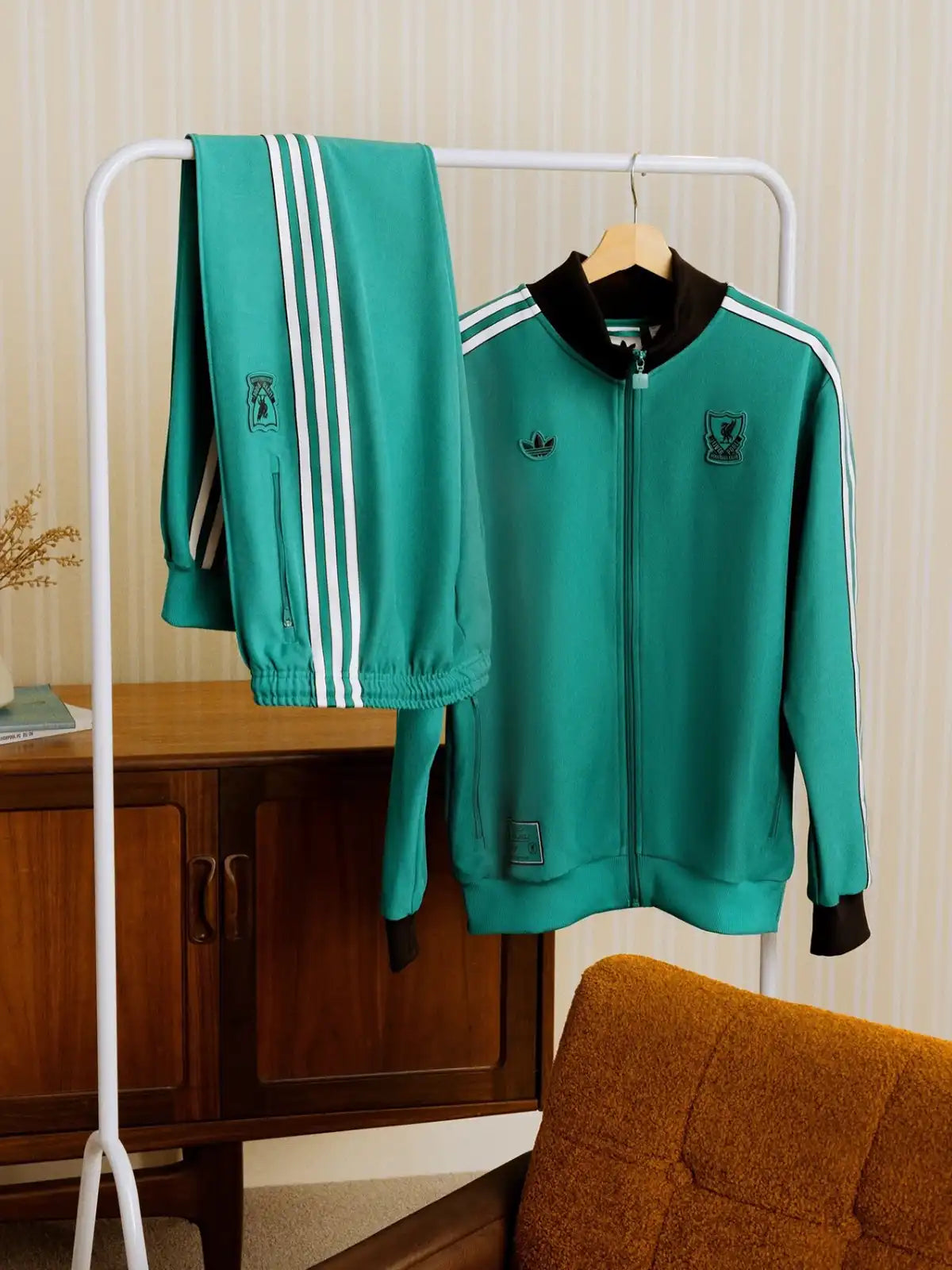 クラブアーカイブのトラックトップを基調に、オリジナルス仕様のエンブレムと3ストライプで再構成した2025-26シーズンのセットアップモデル。