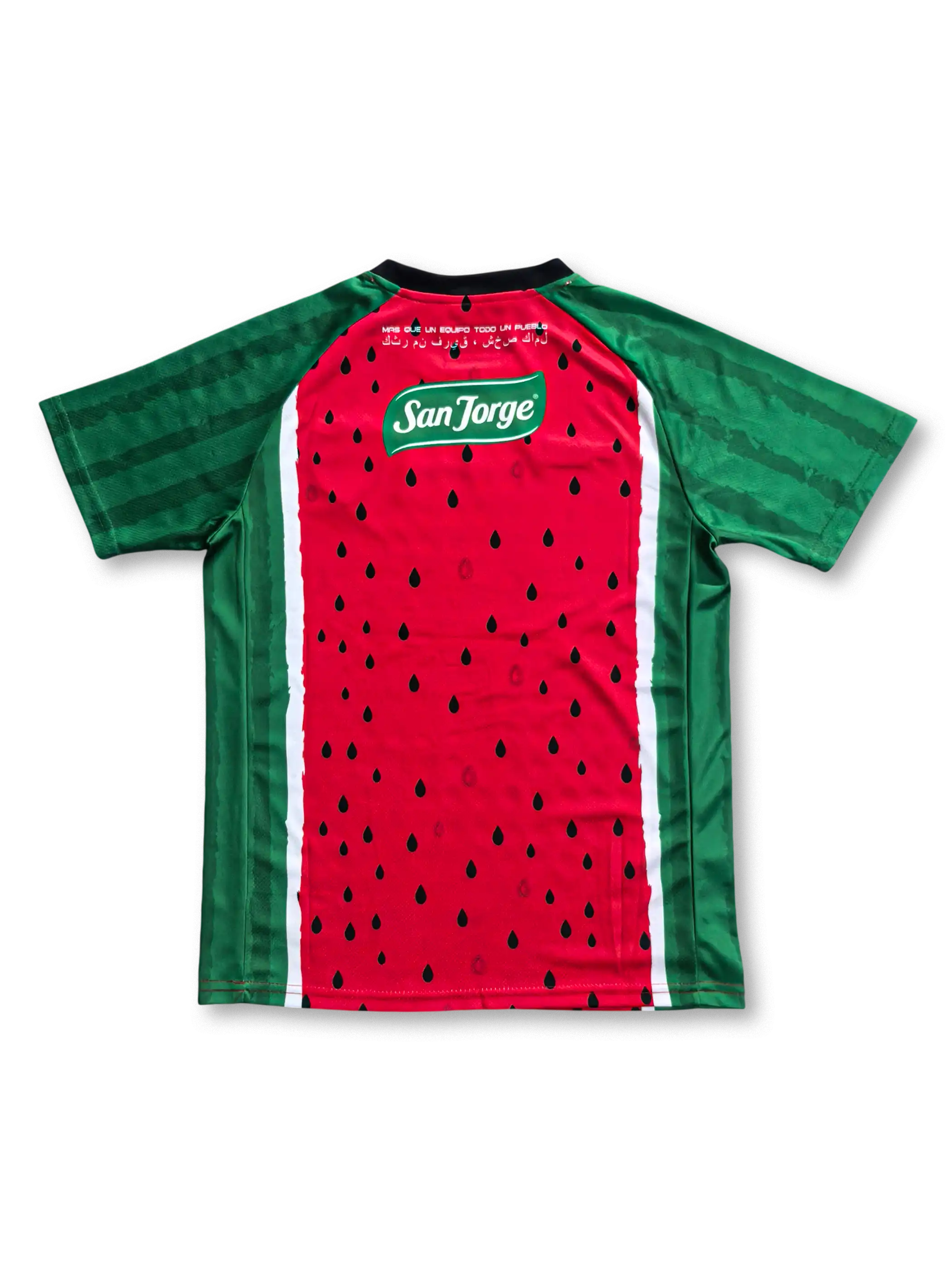 赤と緑のスイカ柄を大胆に配した、2025年パレスティーノの限定セカンドユニフォーム。自由と連帯を象徴するデザイン。