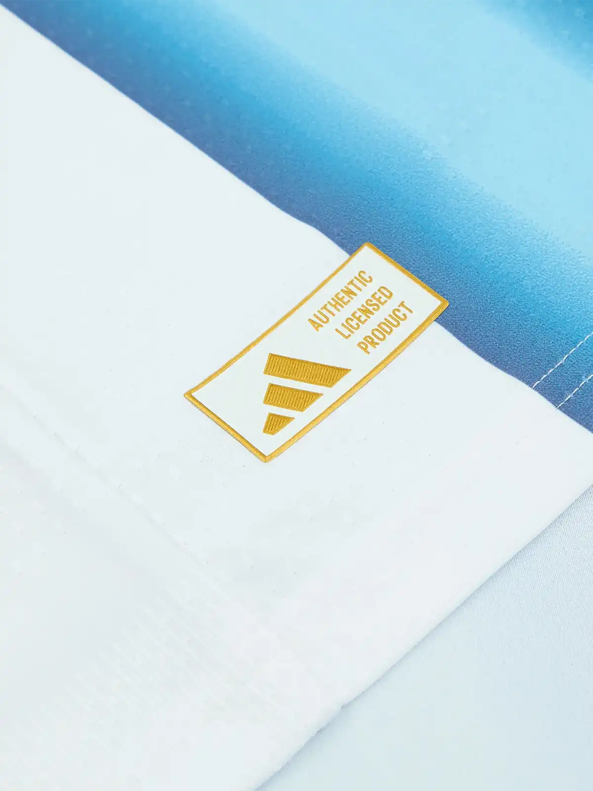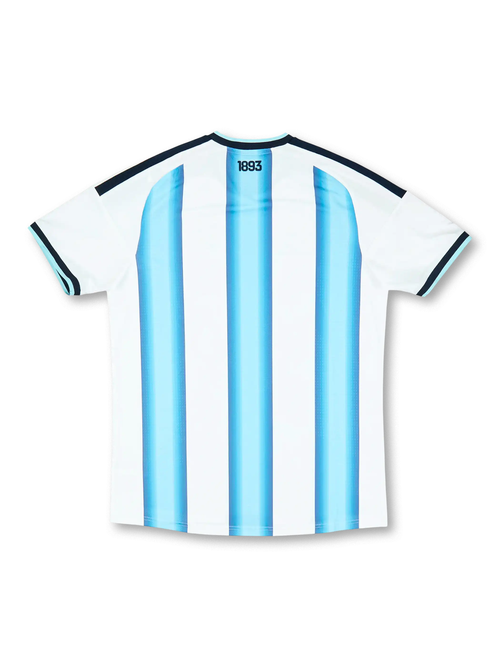 淡いグラデーションを効かせた白青ストライプを採用し、胸元に三つ星エンブレムとFIFAチャンピオンパッチを配したデザイン。軽量パフォーマンス向けのオーセンティック仕様で、通気性に優れるポリエステル素材と細部のメッシュ構造が特徴。肩のスリーストライプスや1893の記念要素がミニマルにまとめられた現行モデル。