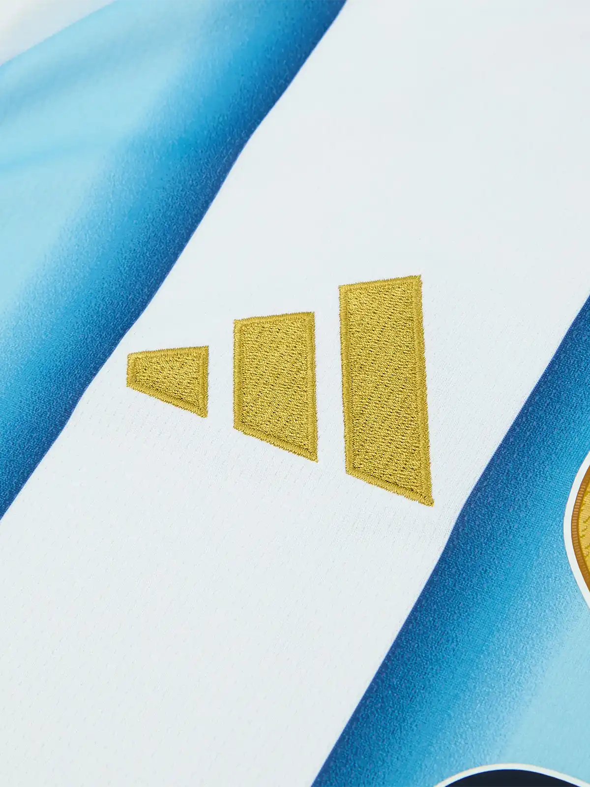 クラシックな白×空色ストライプを現代的なグラデーションで再構成したデザインで、三冠エンブレムとFIFAチャンピオンパッチが象徴的に配置される。黒基調の襟とスリーストライプスが全体を引き締め、9番の公式ナンバーが前後に施された選手仕様。軽量ポリエステル素材を用い、通気性と快適性を両立する一着。