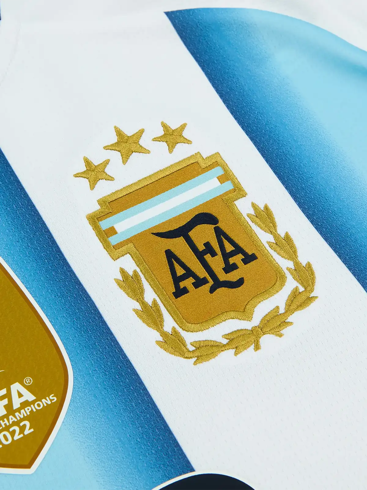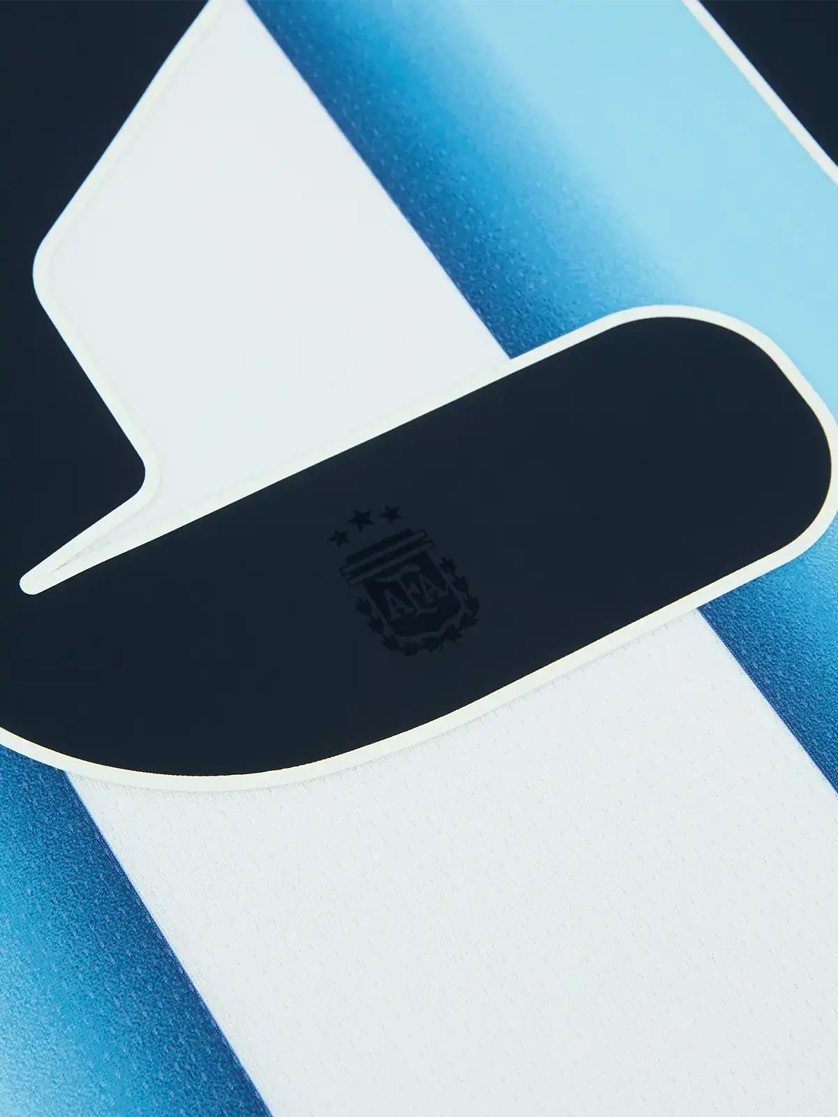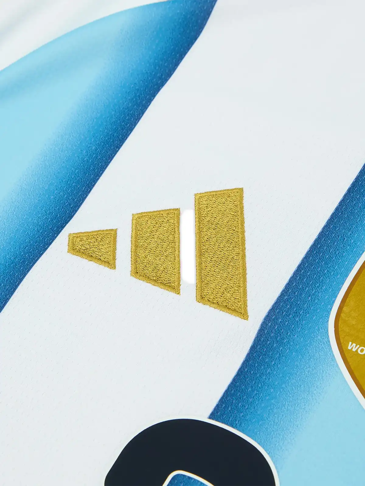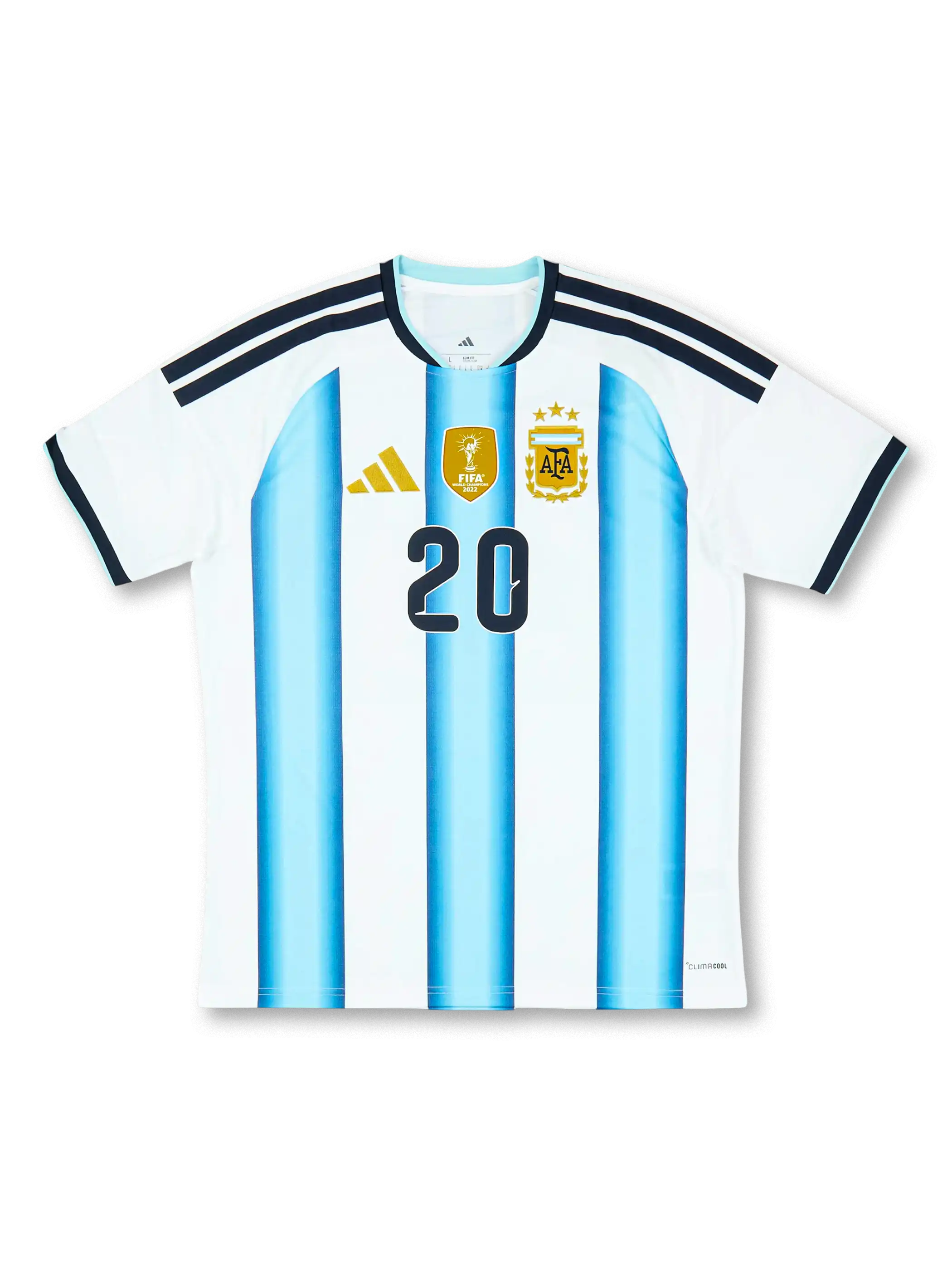 クラシックな淡青縦ストライプを現代的に再構成し、胸中央には三冠を示すFIFAチャンピオンバッジとAFAエンブレムをゴールド仕様で配置。背面には Mac Allister の20番マーキングを採用し、襟元の「1893」やスリーストライプスなど細部も精緻に仕上げられている。軽量なポリエステル素材を用い、通気性に優れる設計で快適な着用感を提供する。