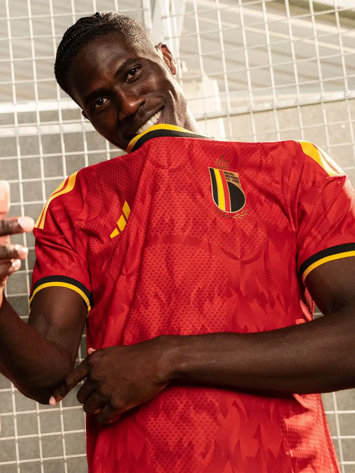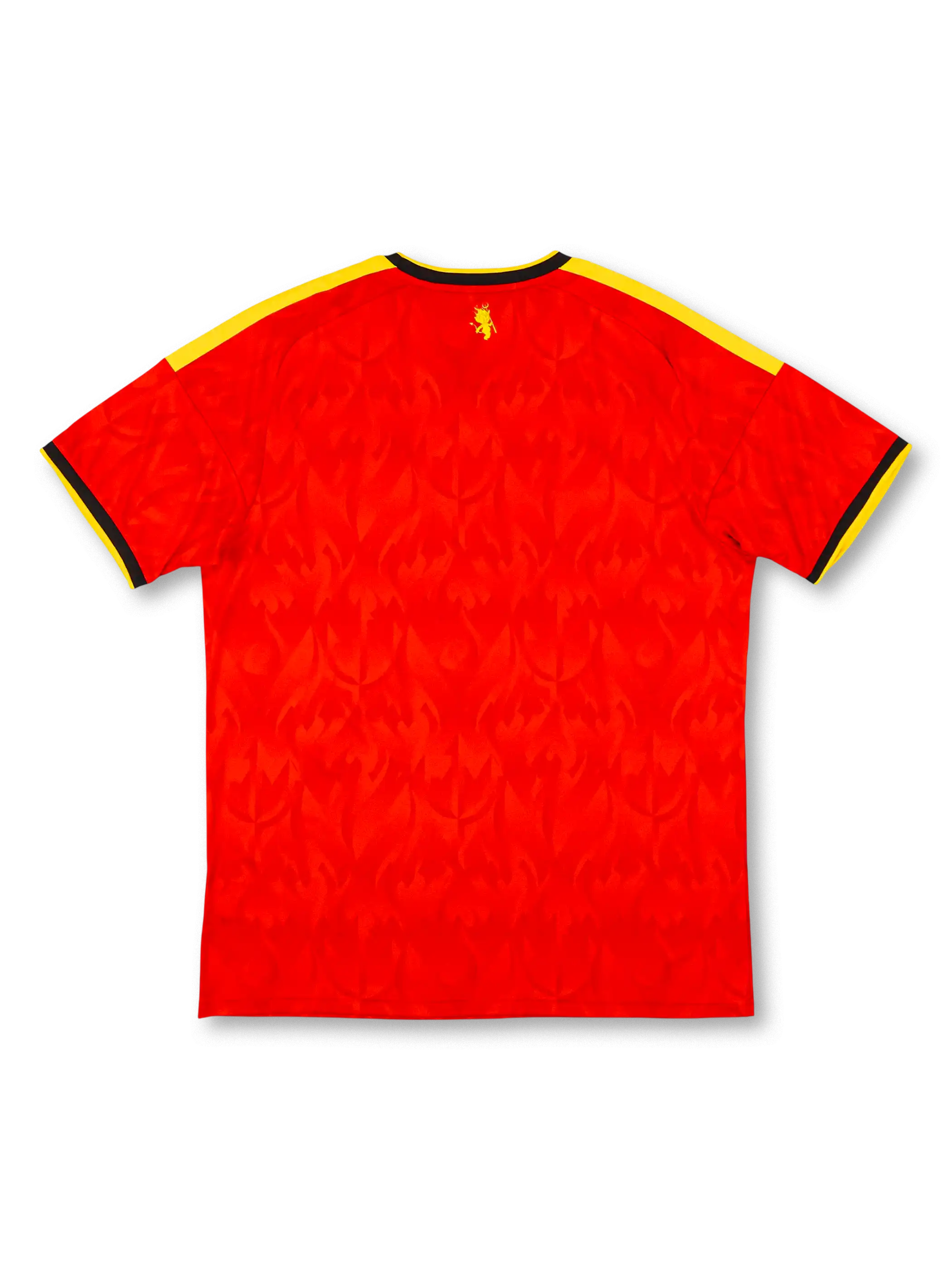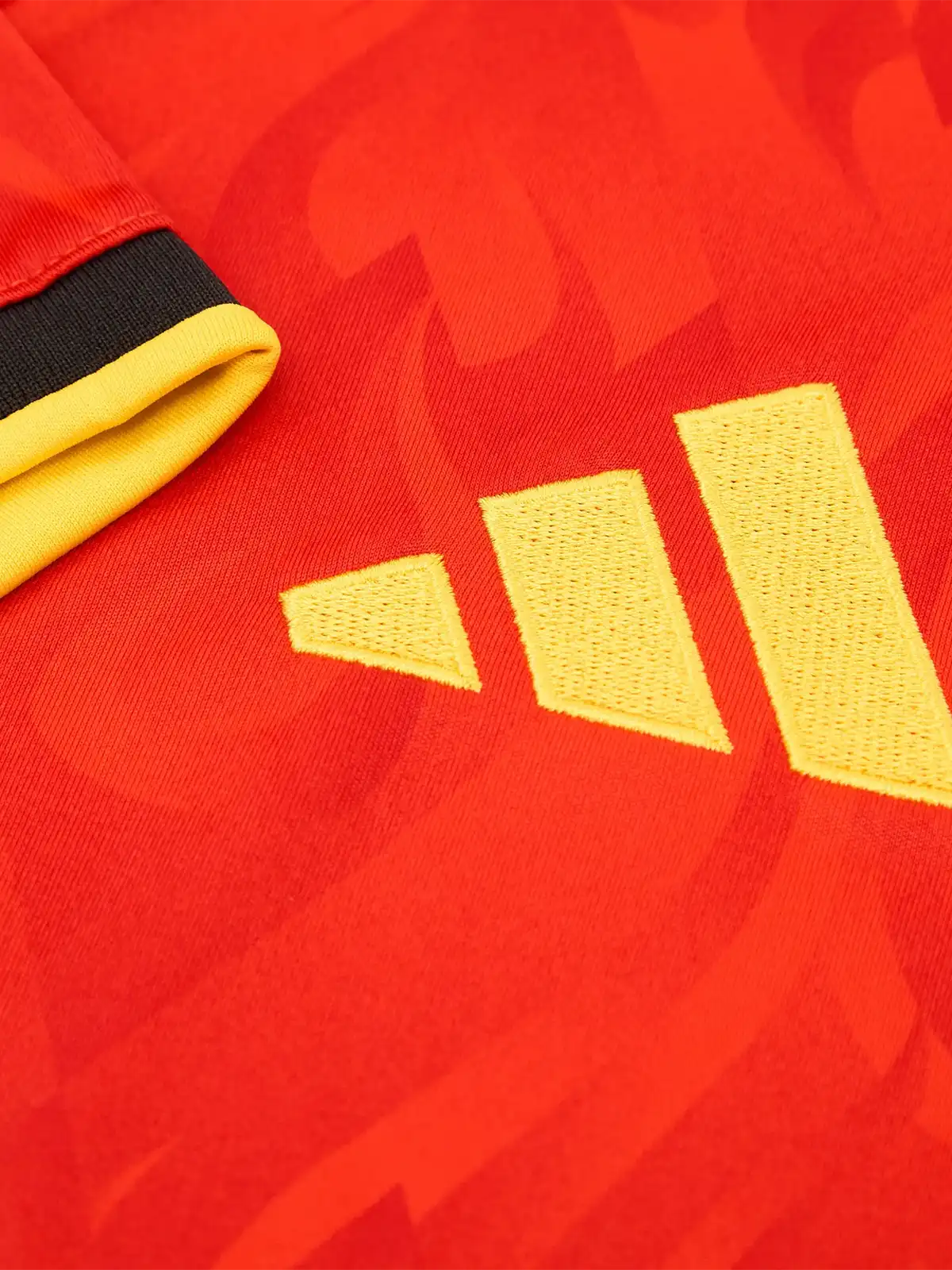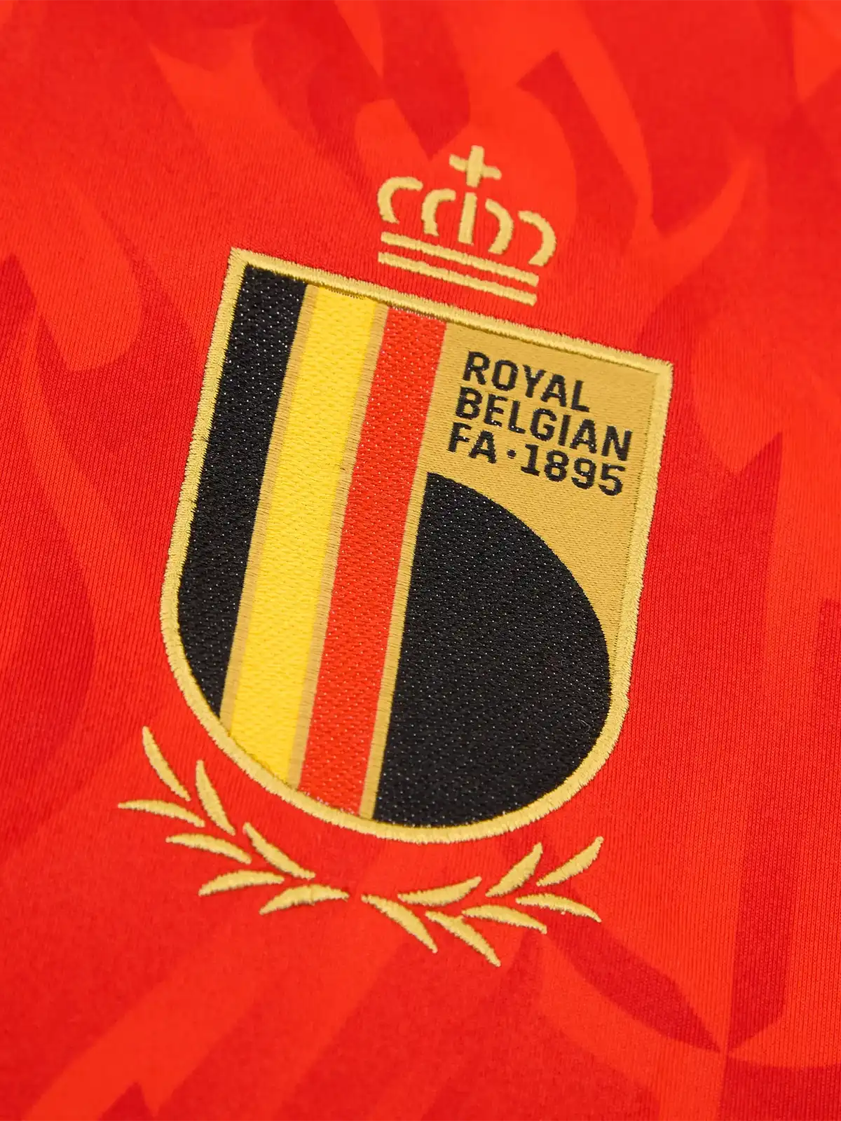 ベルギー伝統のレッドを基調に、炎を思わせる抽象的なフレイムパターンを全面に配したデザインが最大の特徴。肩のイエロースリーストライプスと袖口のアクセントカラーがコントラストを生み、胸の新エンブレムがモダンさを強調する。軽量ポリエステル素材を採用し、通気性に優れた着心地で試合から日常まで幅広く活躍する構成となっている。