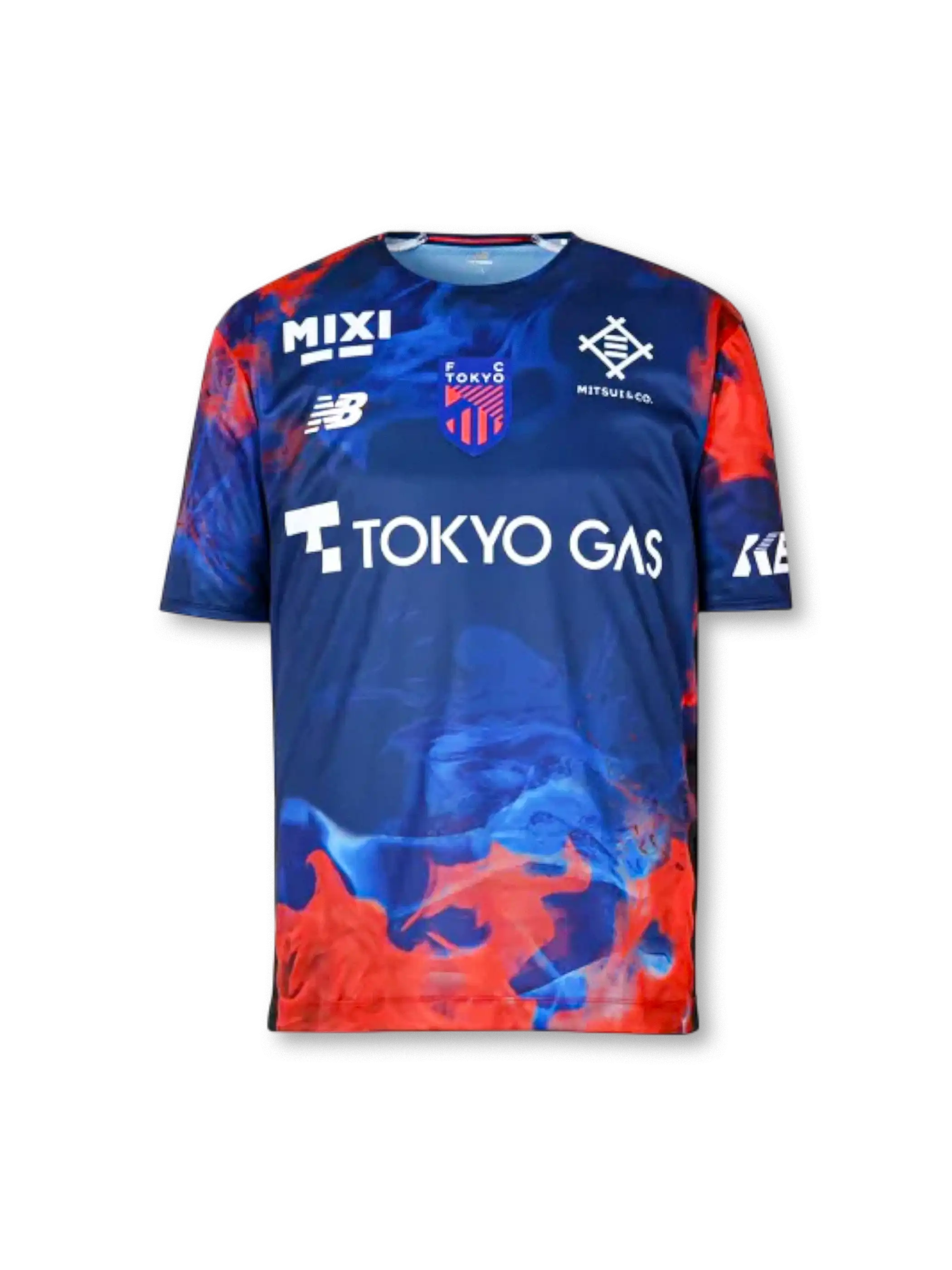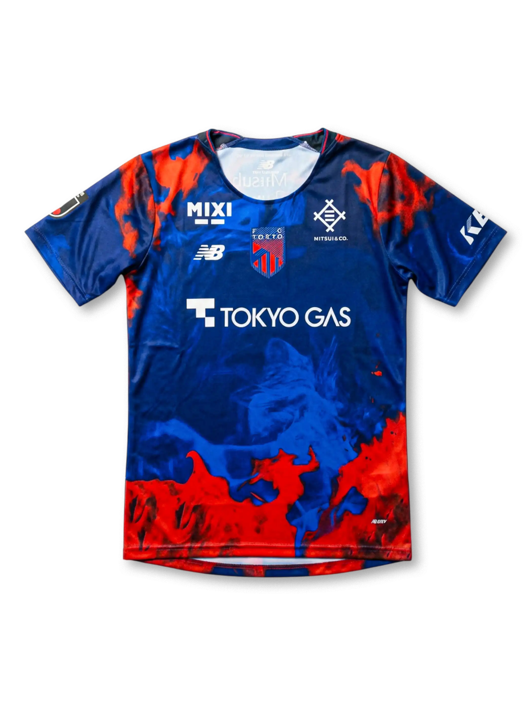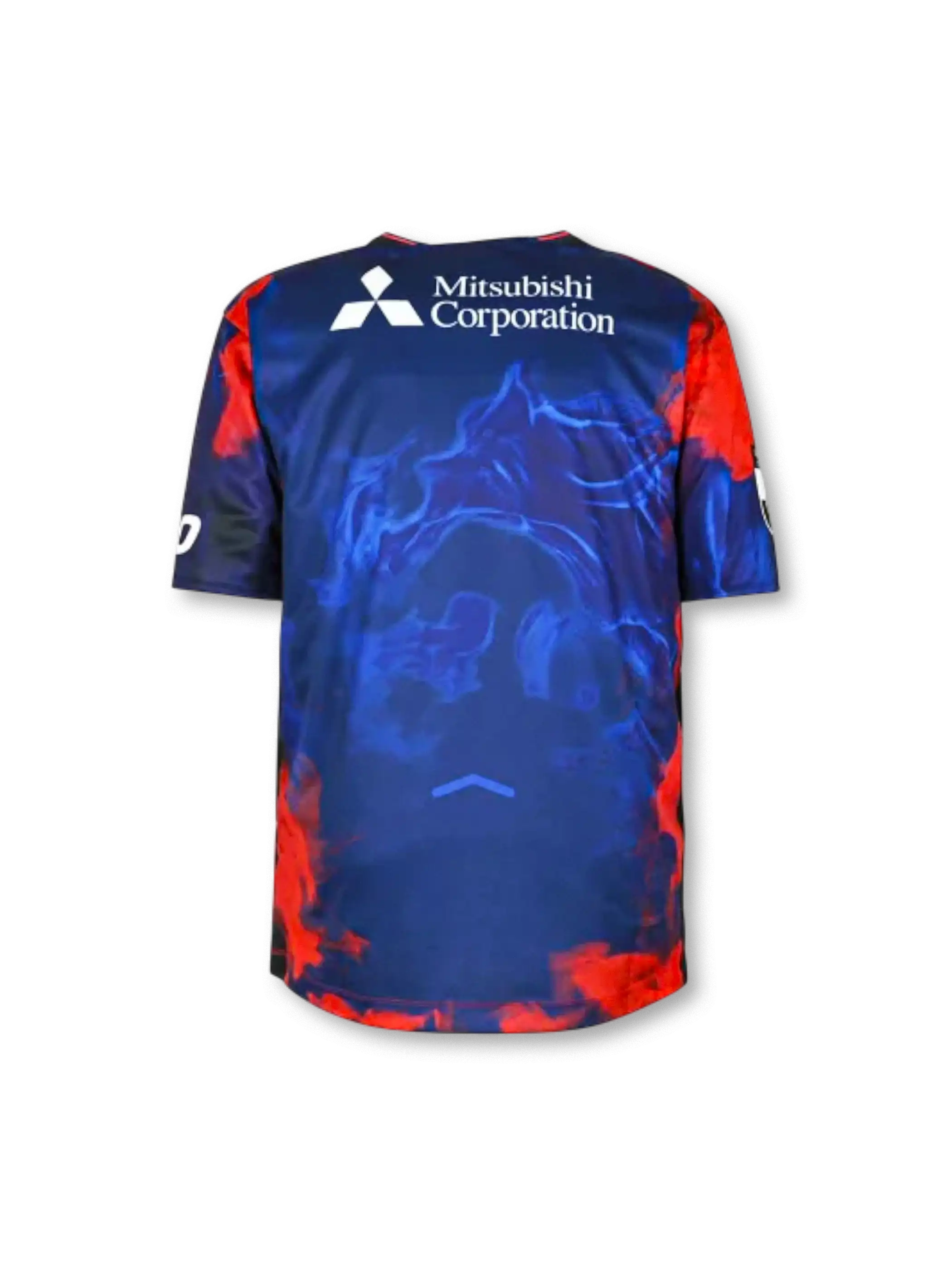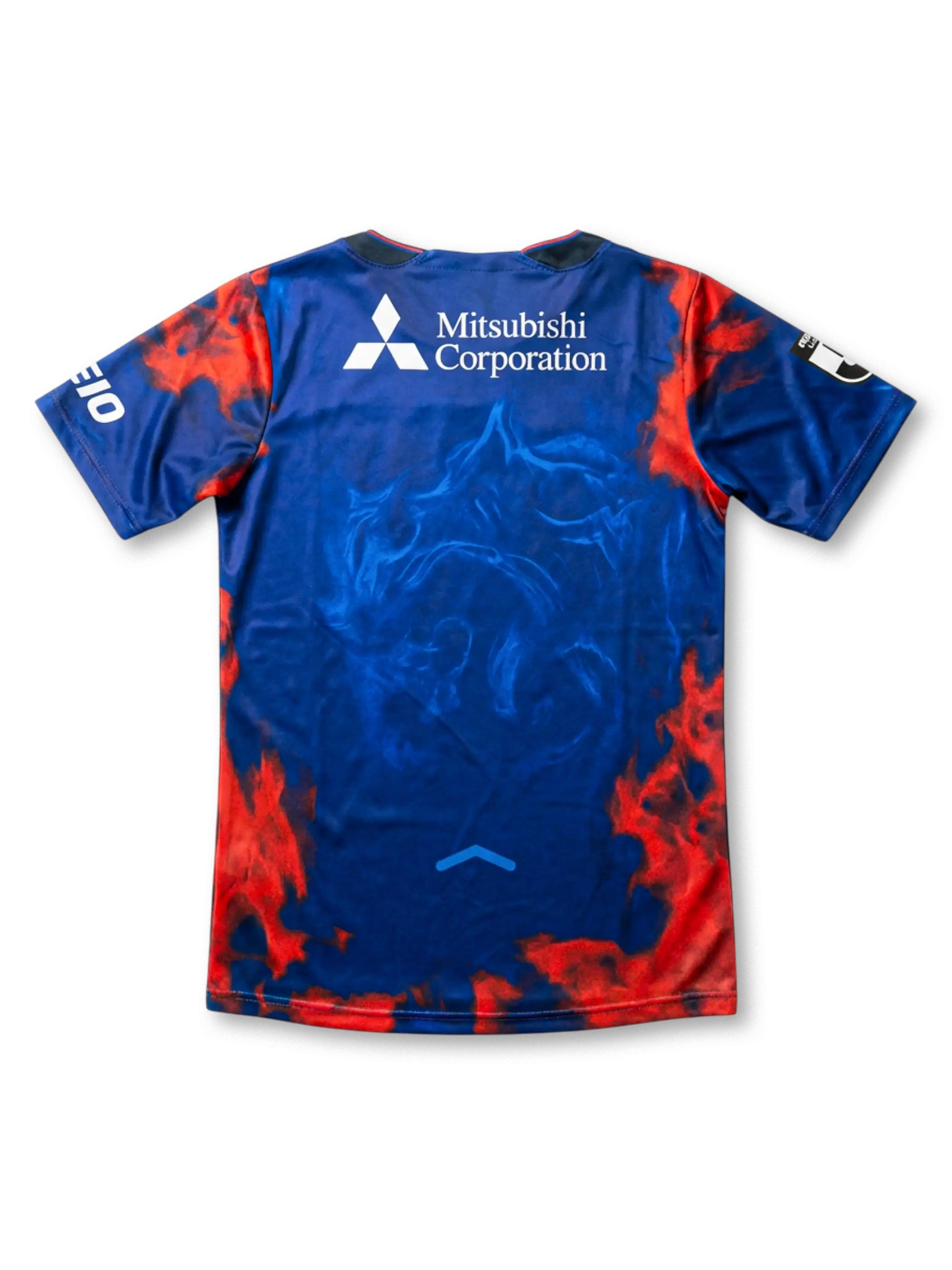 ブルーベースに赤の炎を思わせるグラフィックを大胆に配し、フロントの「TOKYO GAS」や「MIXI」などのスポンサーロゴが視認性高く配置されたデザインです。クルーネックの半袖仕様で、胸にクラブエンブレム/ブランドロゴをレイアウトし、背面には「Mitsubishi Corporation」ロゴを採用。素材はポリエステル系の機能素材を前提としたレプリカユニフォーム仕様として、軽量性と通気性を重視した着用感を想定できます。