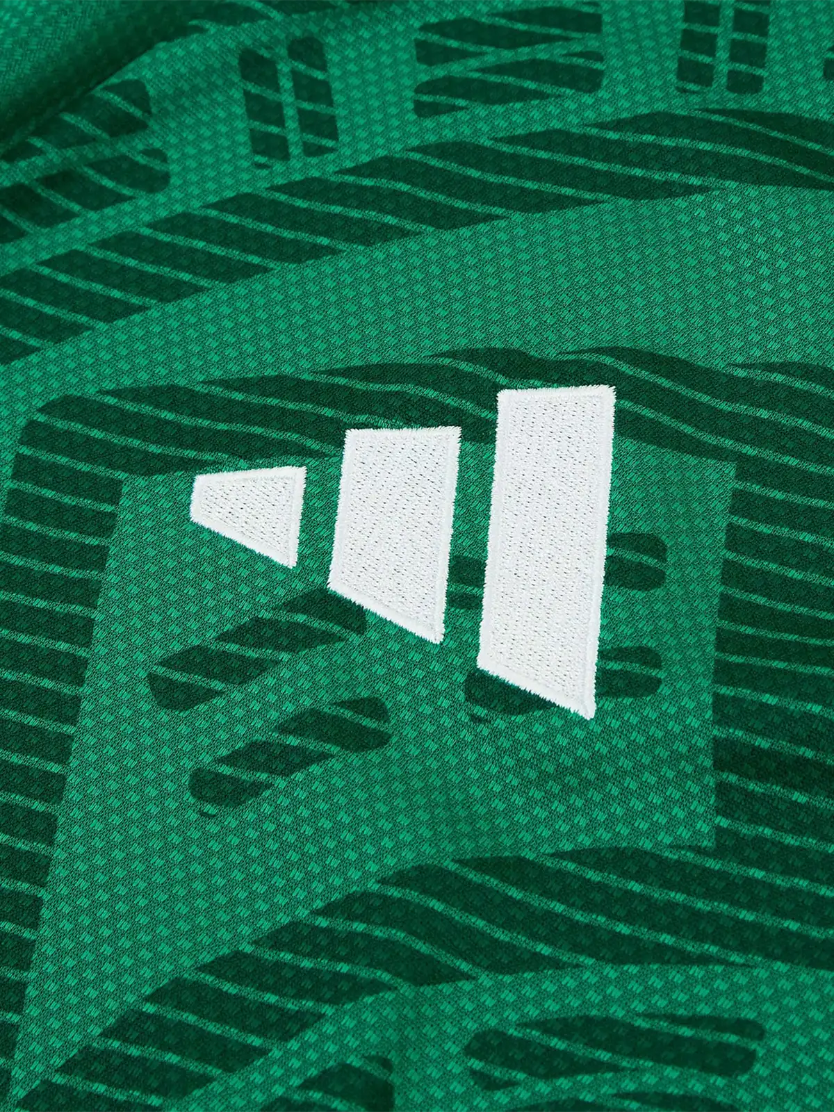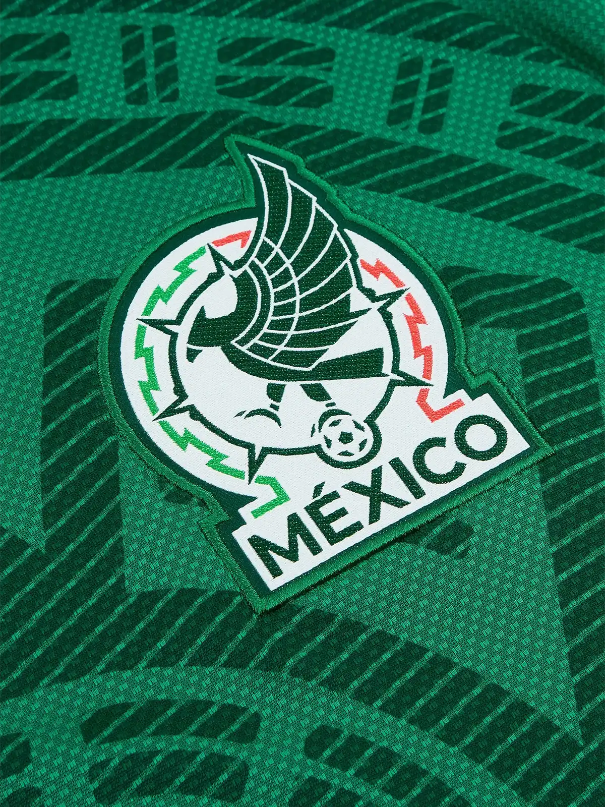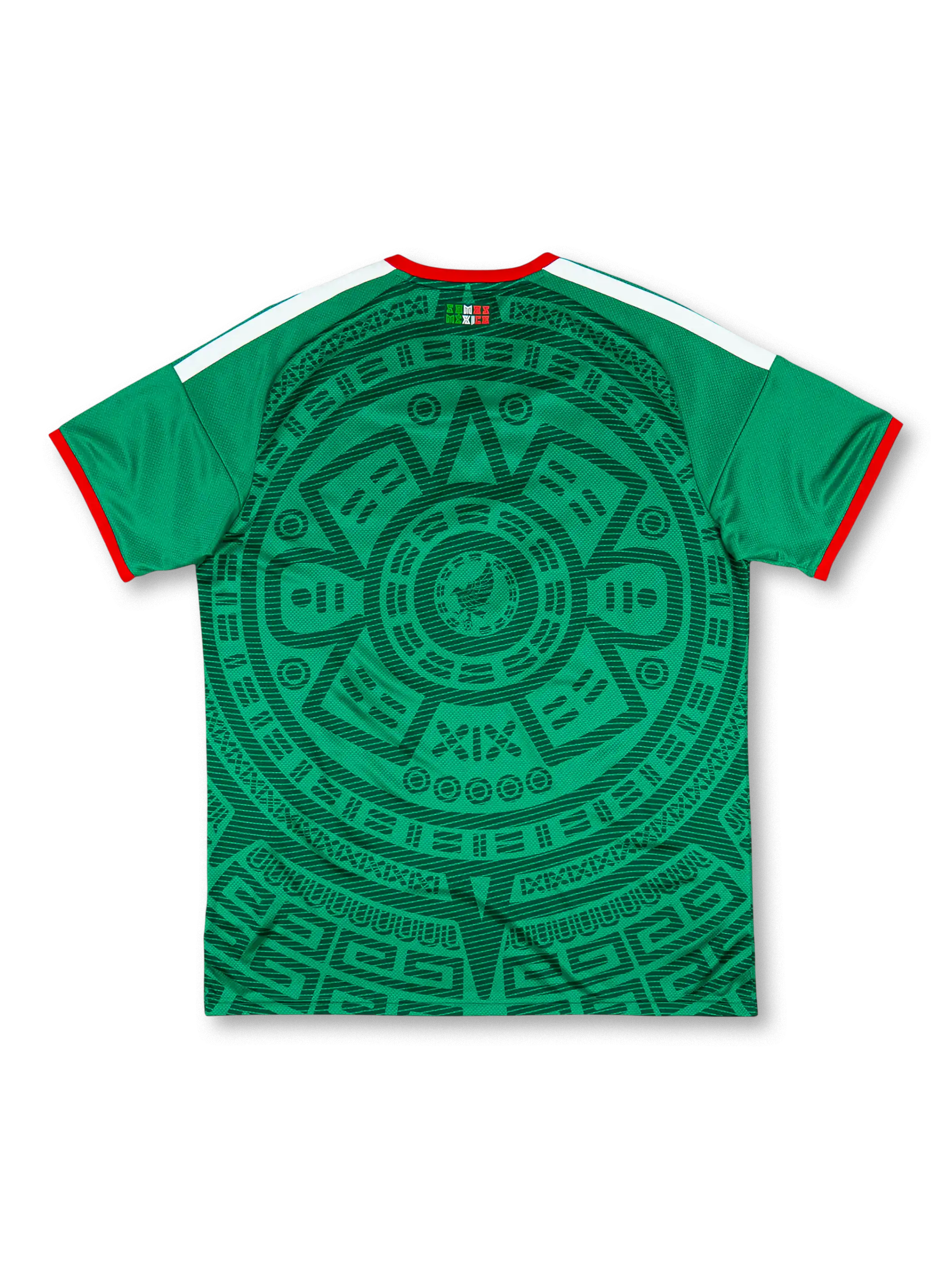 象徴的なグリーンを基調に、アステカ文明を象徴する“サンストーン”を全面グラフィックとして配置したデザインが最大の特徴。襟・袖口のレッドとホワイトが国旗カラーを想起させ、肩のスリーストライプスがスポーティさを強調する。高通気性ポリエステル素材を採用し、試合・日常どちらにも適した快適な着用感を実現している。
