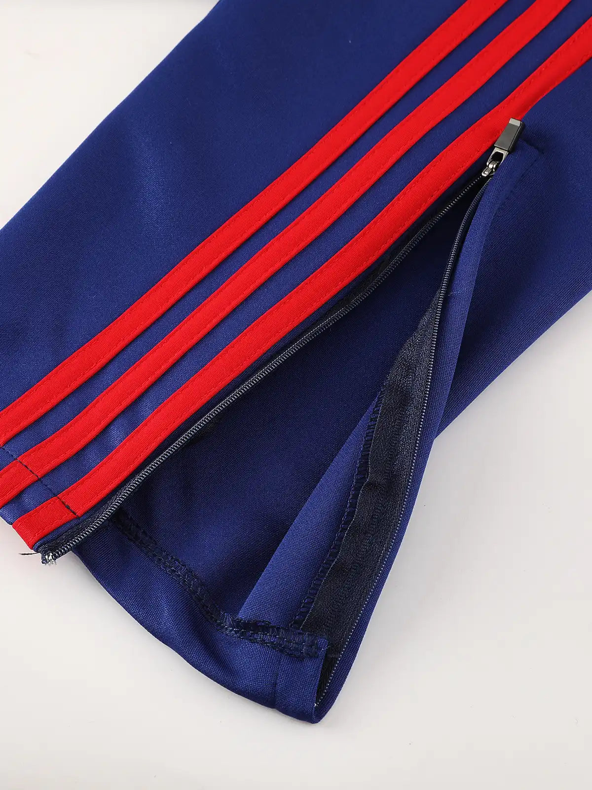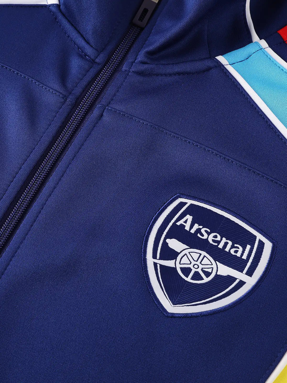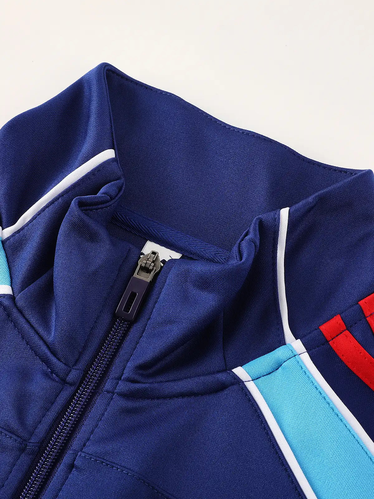 トップスはフルジップ仕様で、肩から脇にかけてイエローとライトブルーのパネル切替を配置。袖とパンツにはレッドラインを走らせ、視覚的なスピード感を強調。全体はネイビーベースで統一され、トレーニングから移動着まで対応する実用的な構成。