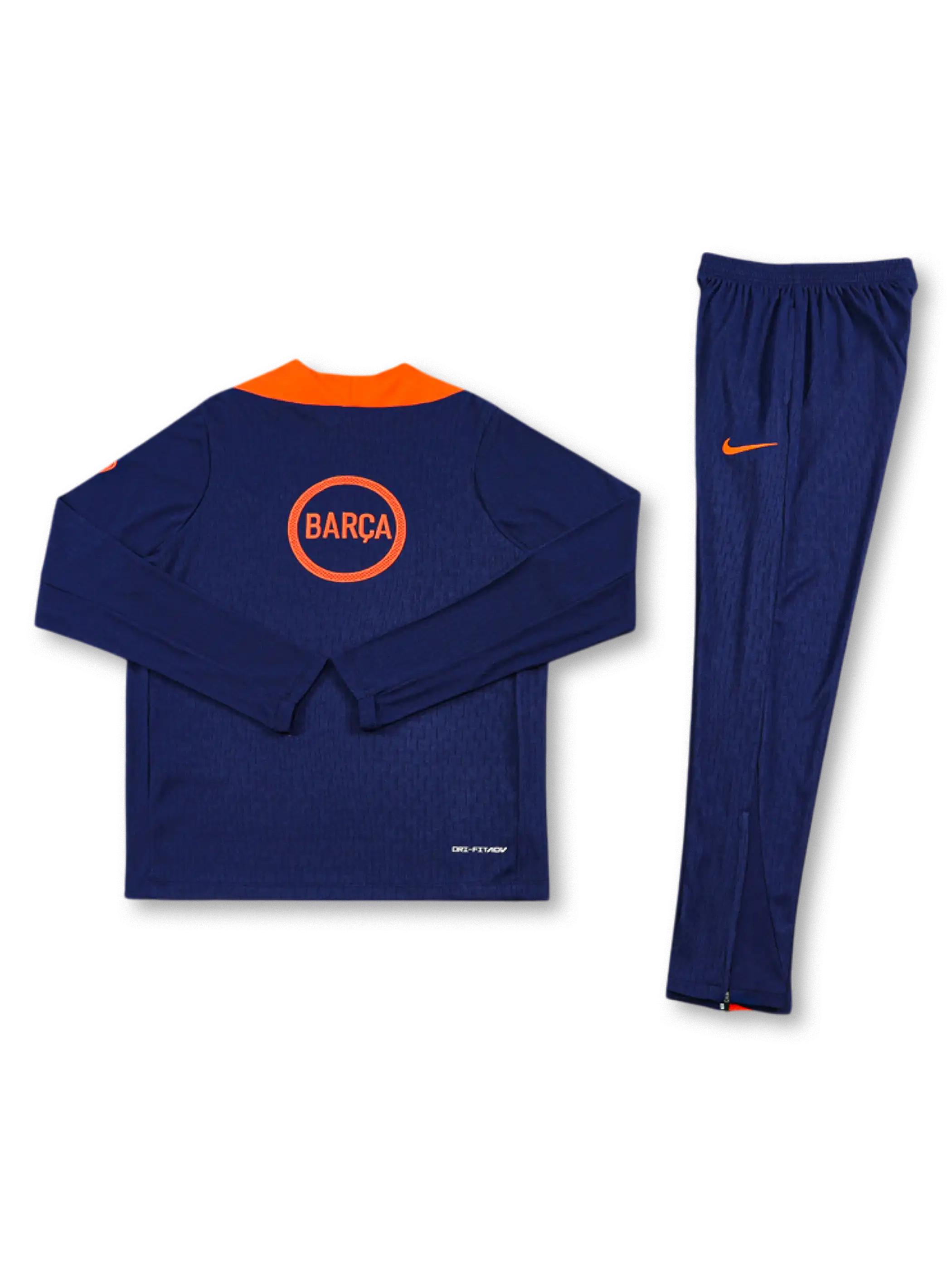 胸元に流動的なグラフィックを配し、肩から袖にかけてのオレンジパネルが視認性を高める構成で、軽量ストレッチ素材によるスリムフィットがトレーニング時の可動性を確保し、ハーフジップ仕様により温度調節と着脱性を両立させている。パンツは細身設計で、クラブカラーを最小限に落とし込んだミニマルなデザインが特徴。