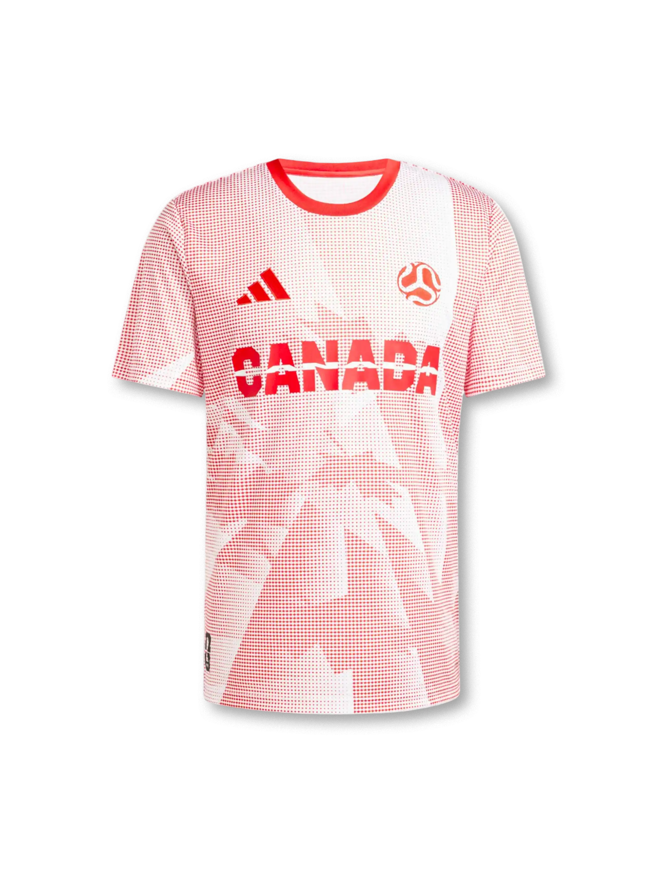 胸の「CANADA」ロゴと、国旗を象徴するメープルリーフ(楓葉)をモチーフにしたドットグラフィックが鮮烈な印象を与える。