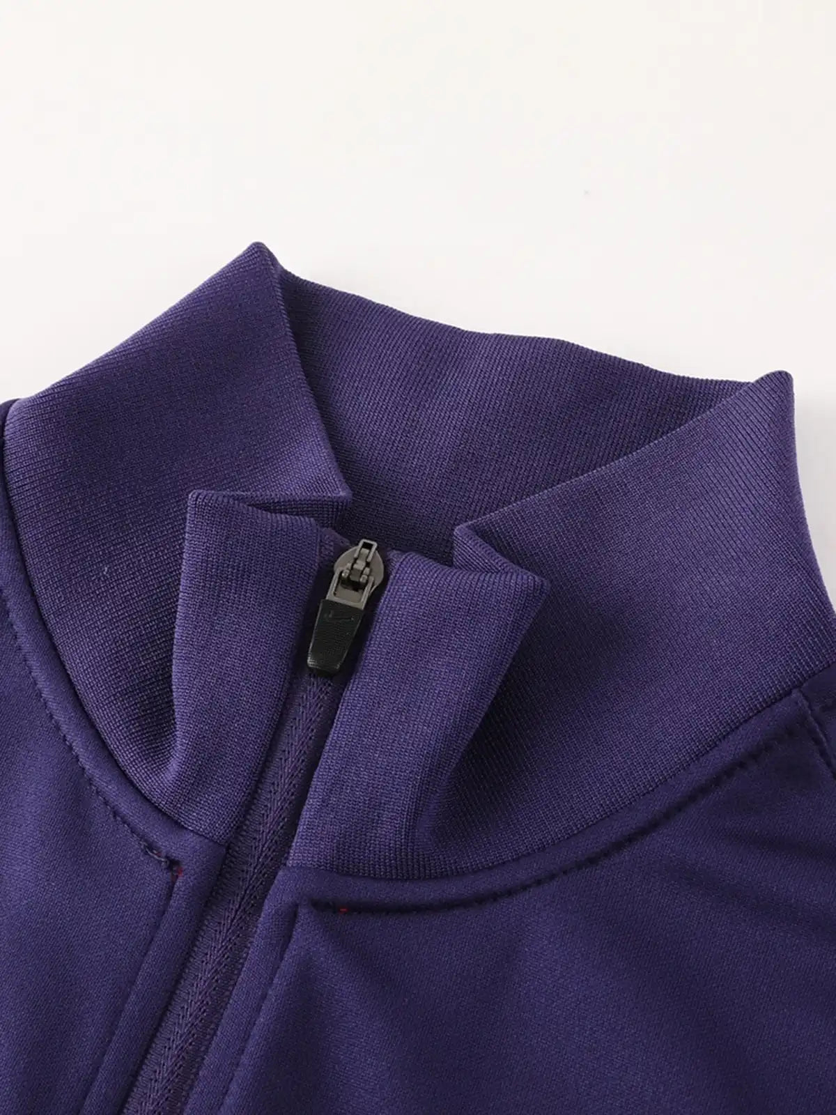 トップスはネイビーベースにアーム部分へレッド切替を配置し、視認性と伝統色を強調。フロントジップ仕様で着脱しやすく、胸元には代表エンブレムを配置。パンツは同系色で統一し、セットアップとして安定感のある構成。