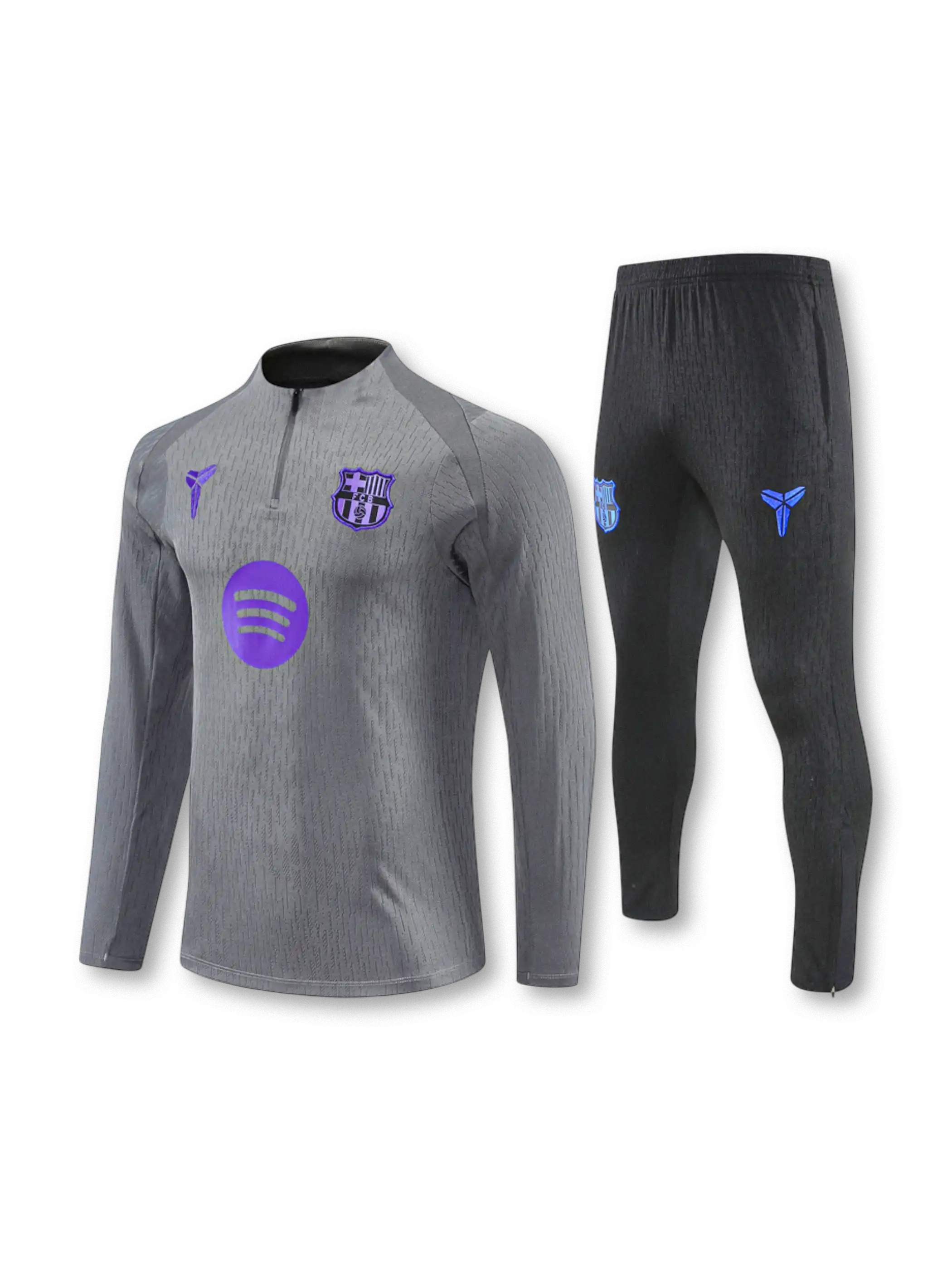 2026シーズンに展開されたFCバルセロナのコラボレーション仕様トレーニングセット。グレーベースに独自配色を組み合わせた現代的デザイン。