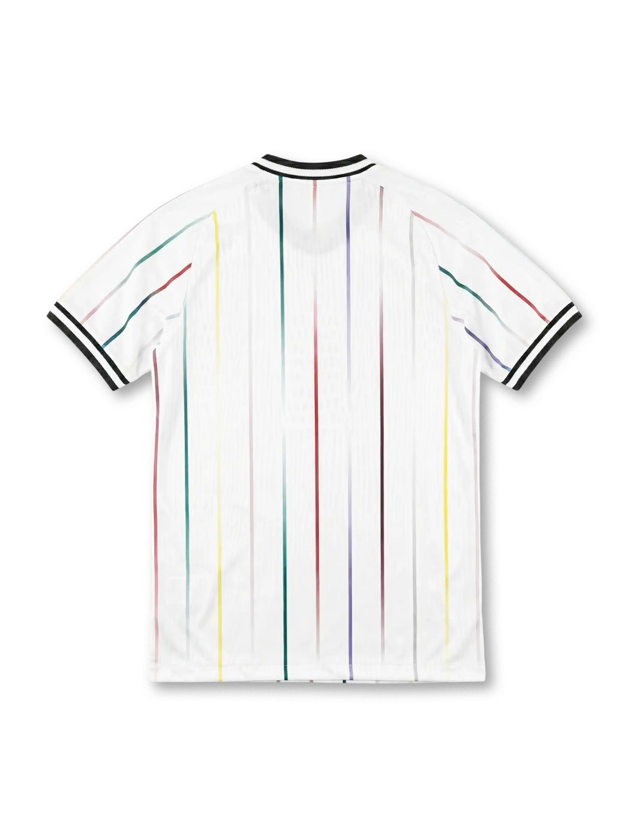 白基調に複数色の極細ストライプを整列させたデザインが特徴で、胸にはモノクロエンブレムとトレフォイルロゴを配置し、通気性の高い生地構造と軽量仕立てにより競技環境での快適性を確保しつつ現代的なシャープさを表現している。