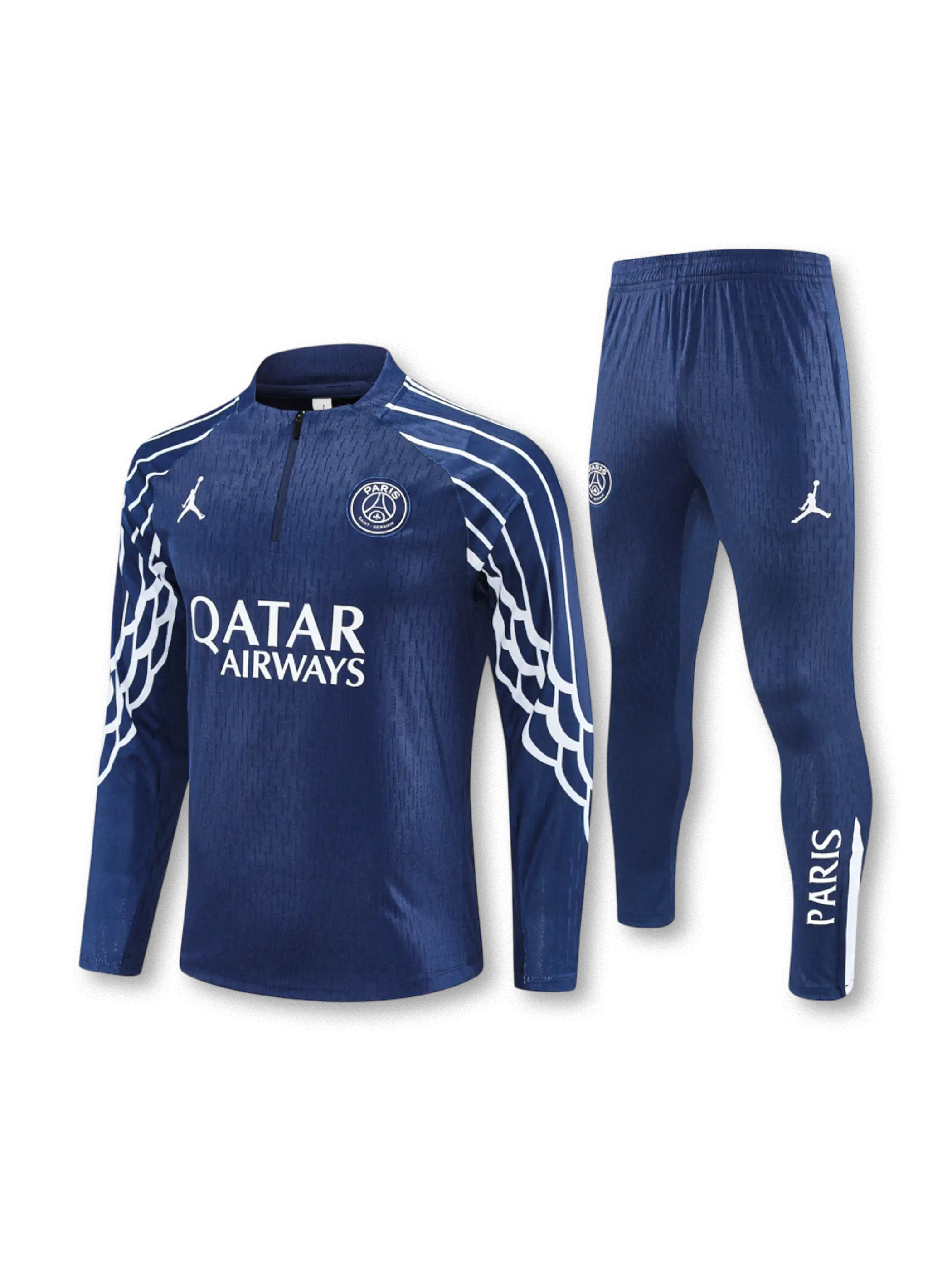 トップス肩部から袖にかけて白線で描かれたウィンググラフィックを配置し、欧冠仕様らしい象徴性を強調。Jordanロゴとクラブエンブレムを左右に分けた配置で視認性を確保し、全体はネイビー基調で統一。パンツは同系色でまとめ、裾のホワイト切替が動作時のアクセントとして機能する。