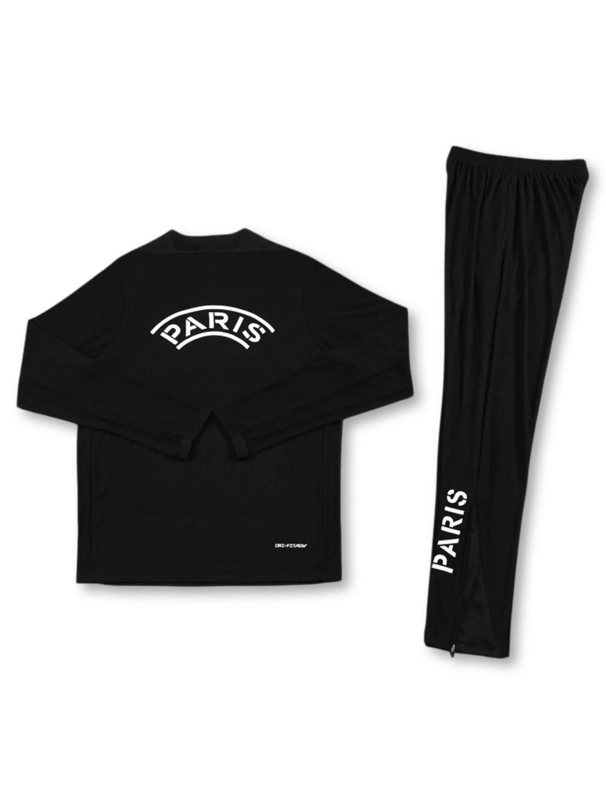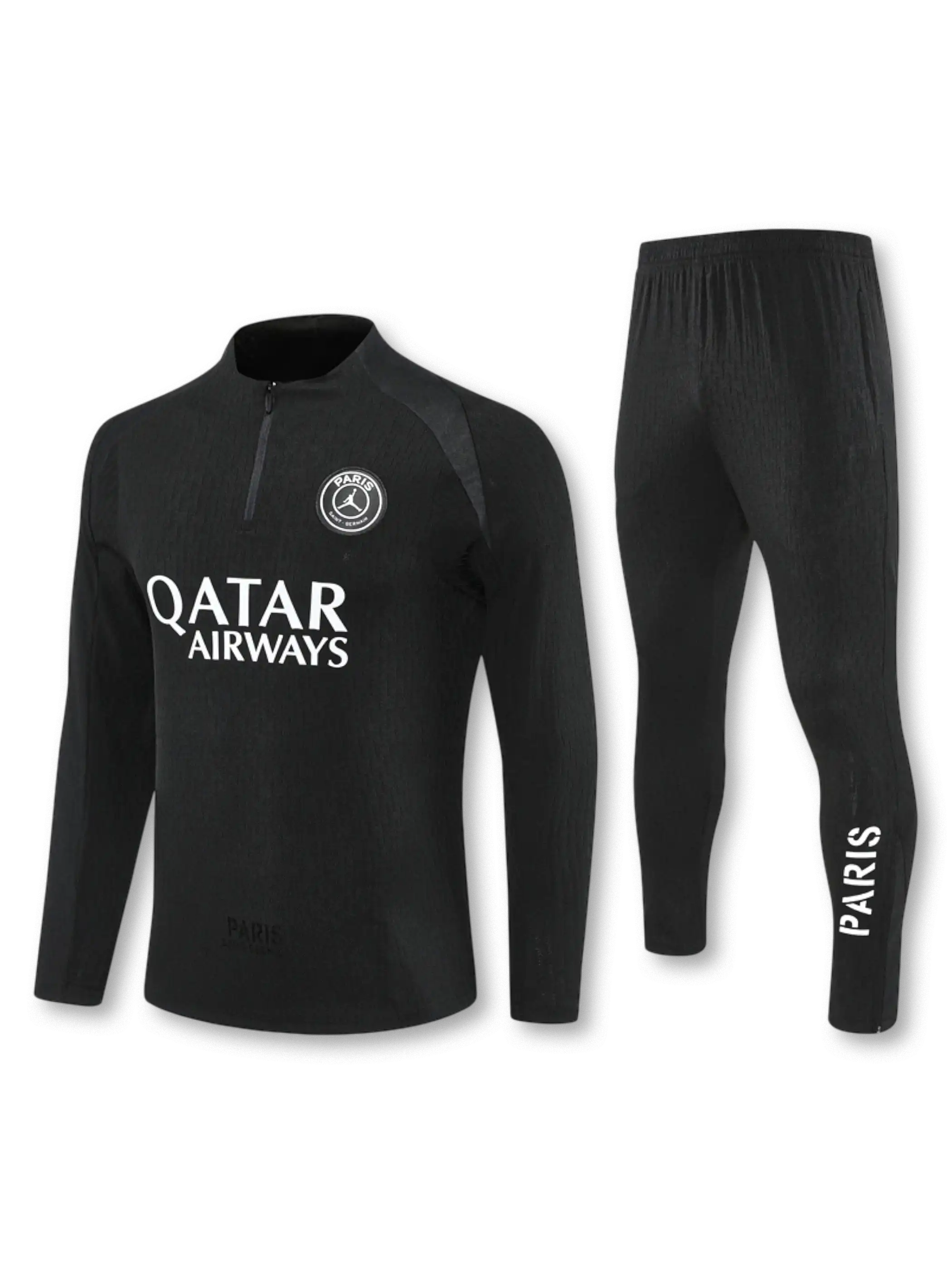 ブラックを基調にホワイトのクラブロゴと“PARIS”プリントを配置し、ジョーダンブランドの象徴的ミニマルデザインを採用。1/4ジップとスリムテーパードパンツの組み合わせにより可動性を高め、軽量ストレッチ素材がトレーニング時の快適性を確保し、選手仕様に近いフィット感を実現。
