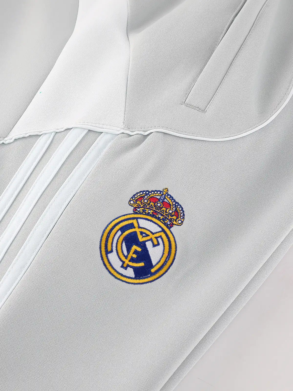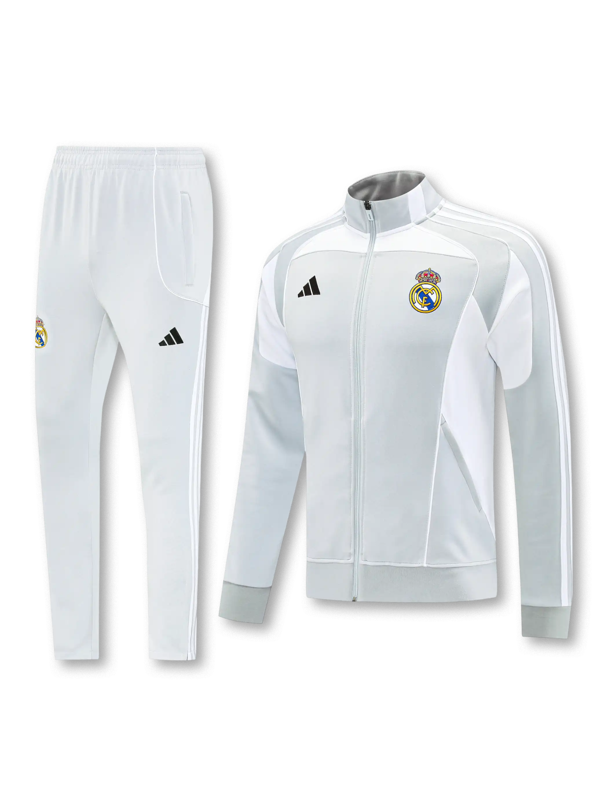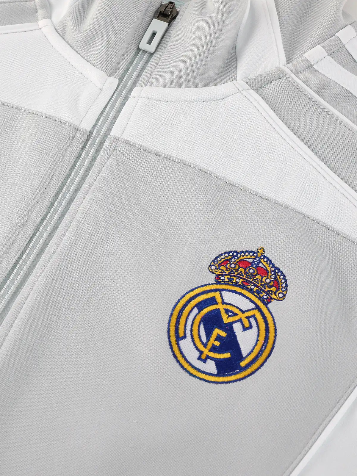 ライトグレーを基調とした統一感のある配色に、クラブエンブレムとadidasロゴをバランスよく配置し、トレーニング用途に適した動きやすいシルエットで構成されている。ジャケットとパンツのセットアップ仕様により、日常使いから移動着まで幅広く対応し、実用性とクラブアイデンティティを両立している。