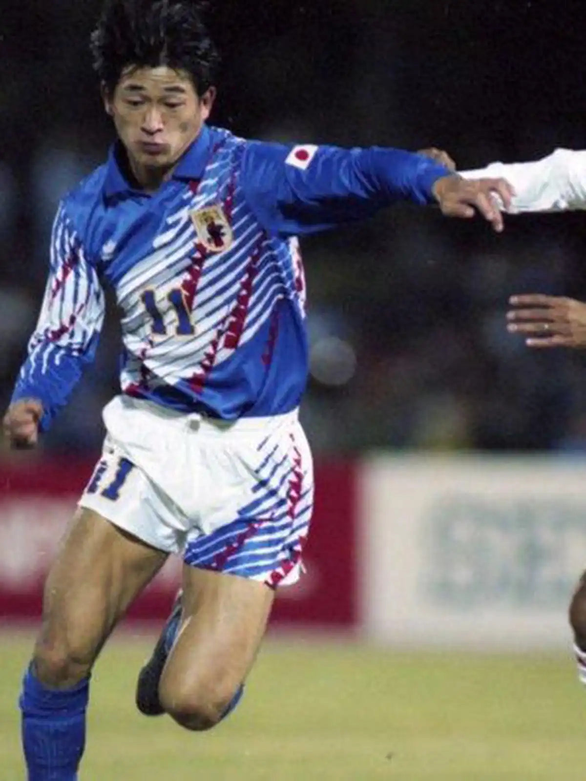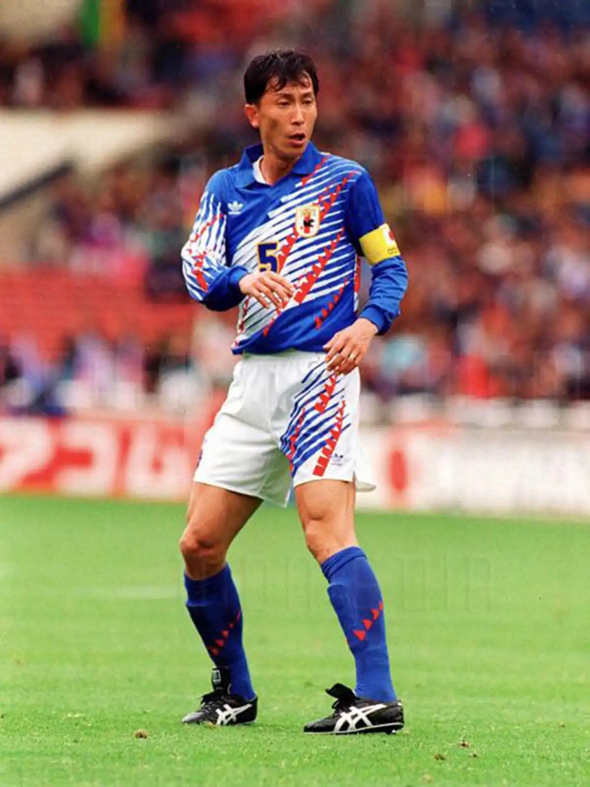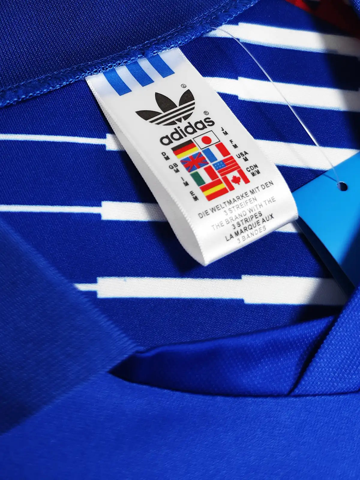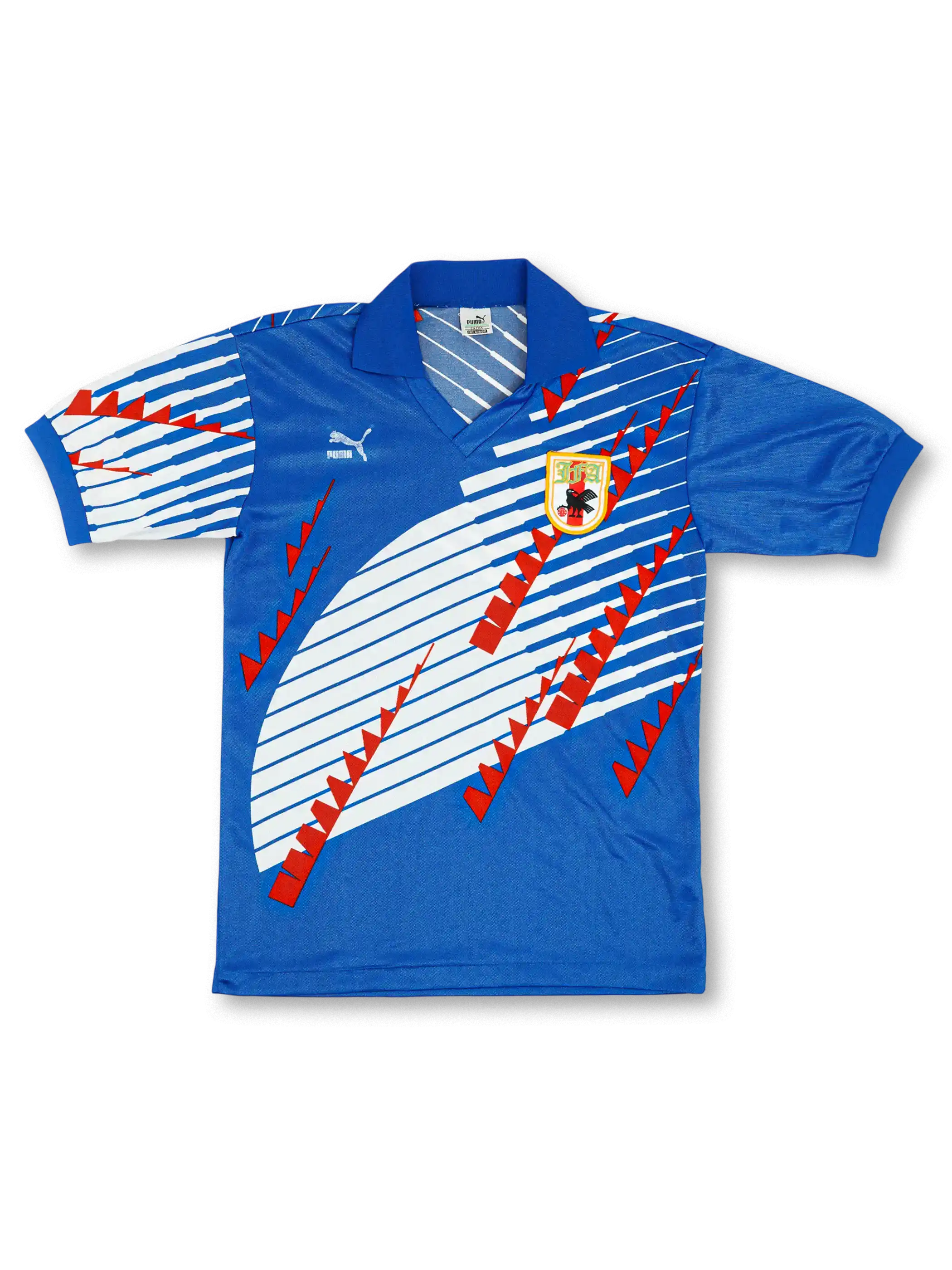 ロイヤルブルー基調に斜線グラフィックを配した、90年代意匠の半袖モデル。