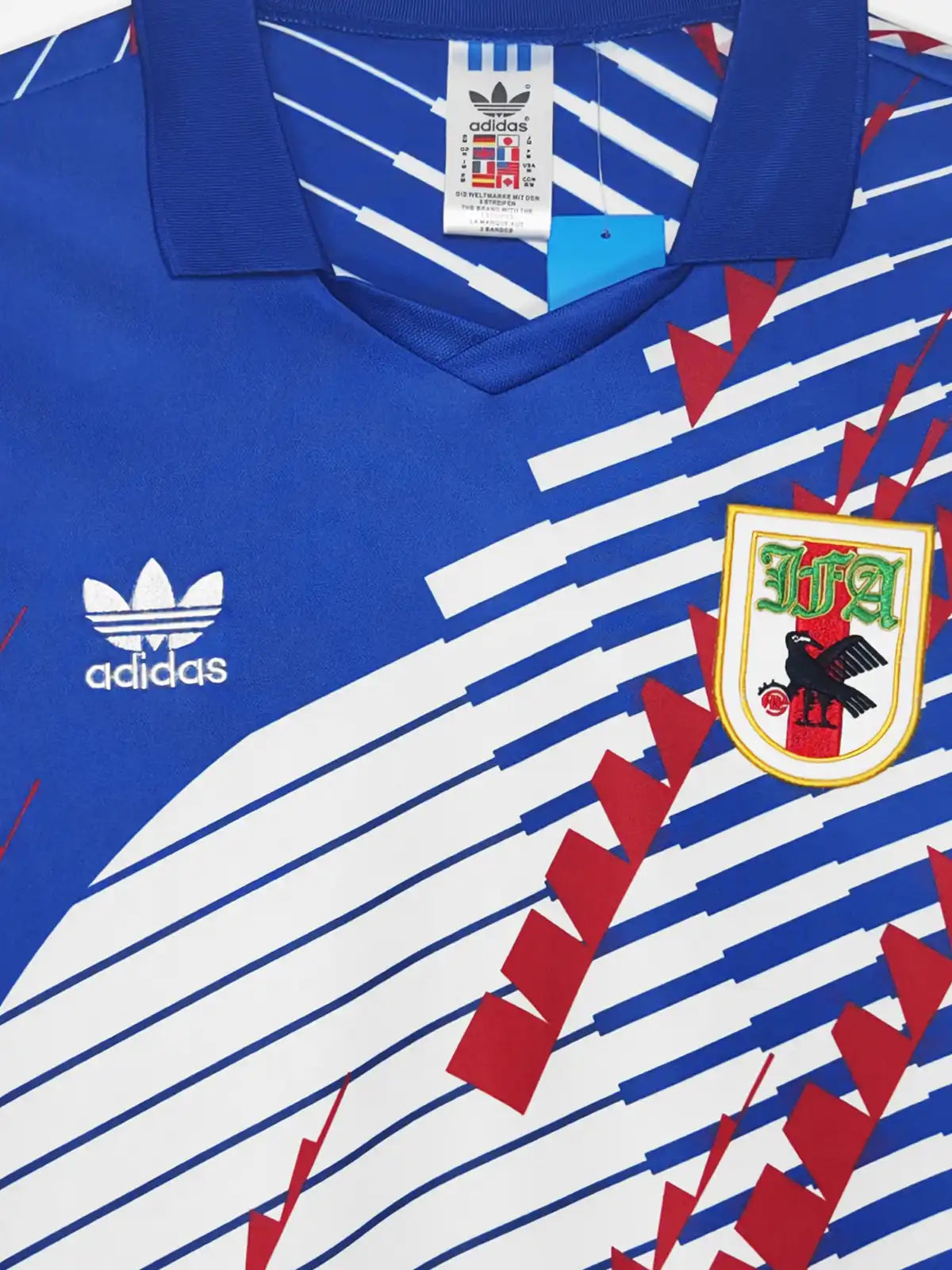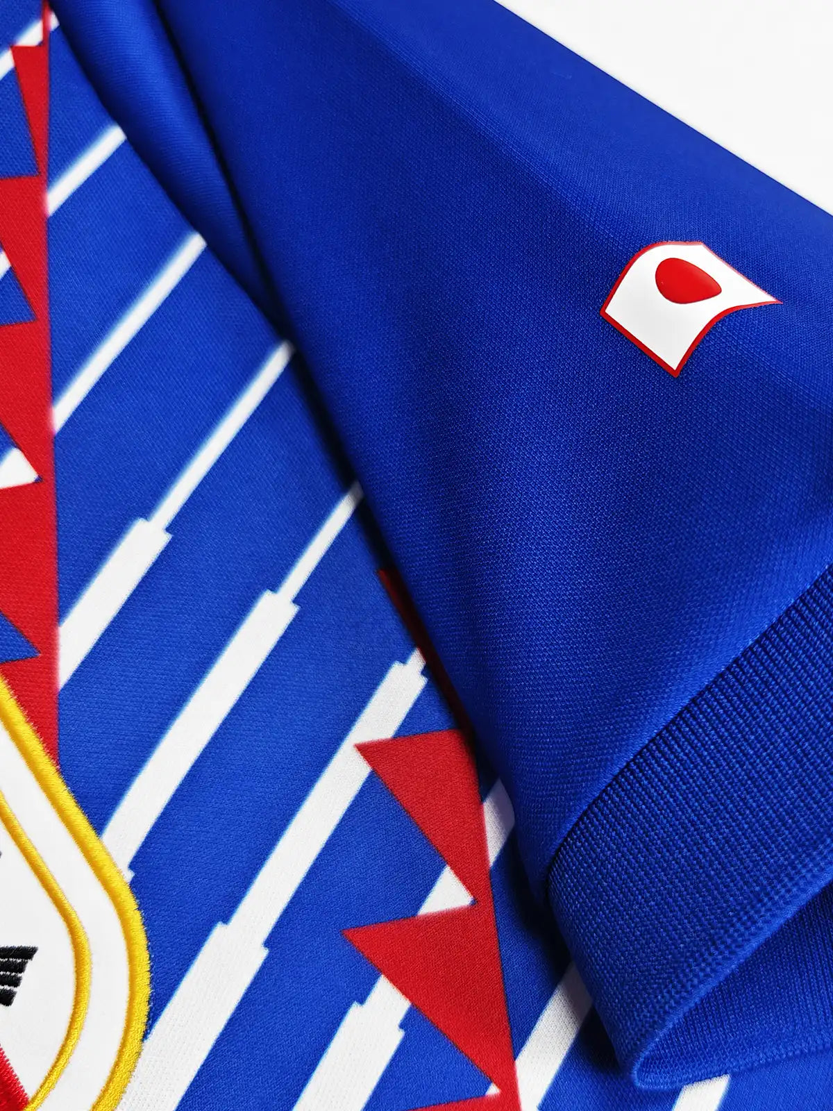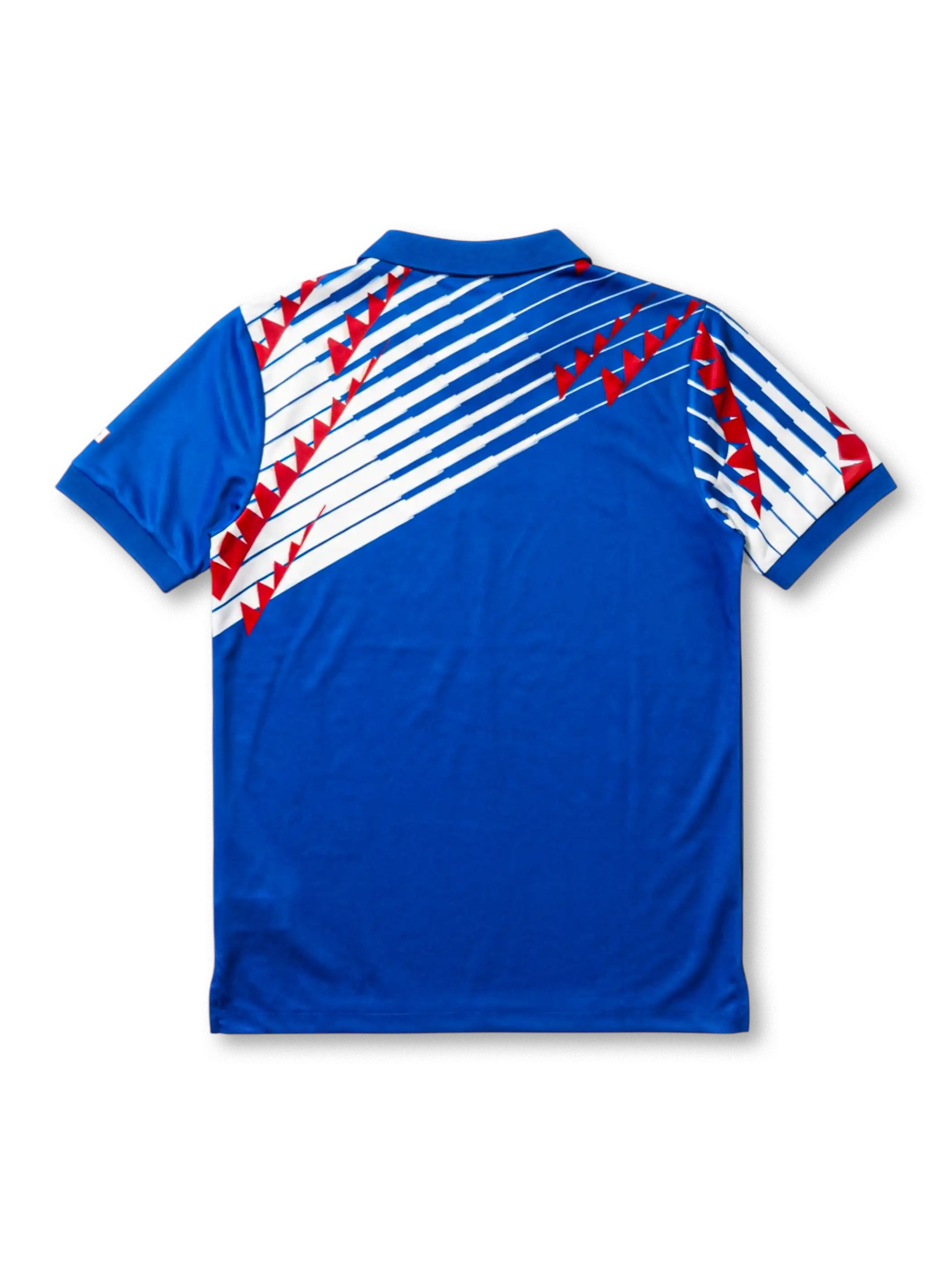 ロイヤルブルーを基調に、白の斜線と赤のジグザグモチーフを重ねたグラフィック配置。左胸にトレフォイル、右胸に日本代表エンブレムを配置し、襟付き(ポロカラー)の半袖仕様。背面は無地ベースで、肩付近に前身頃と連動する斜線パターンが入ります(画像はネーム・背番号なし)。