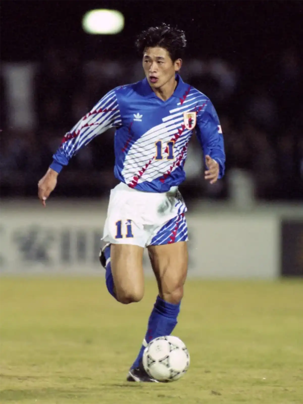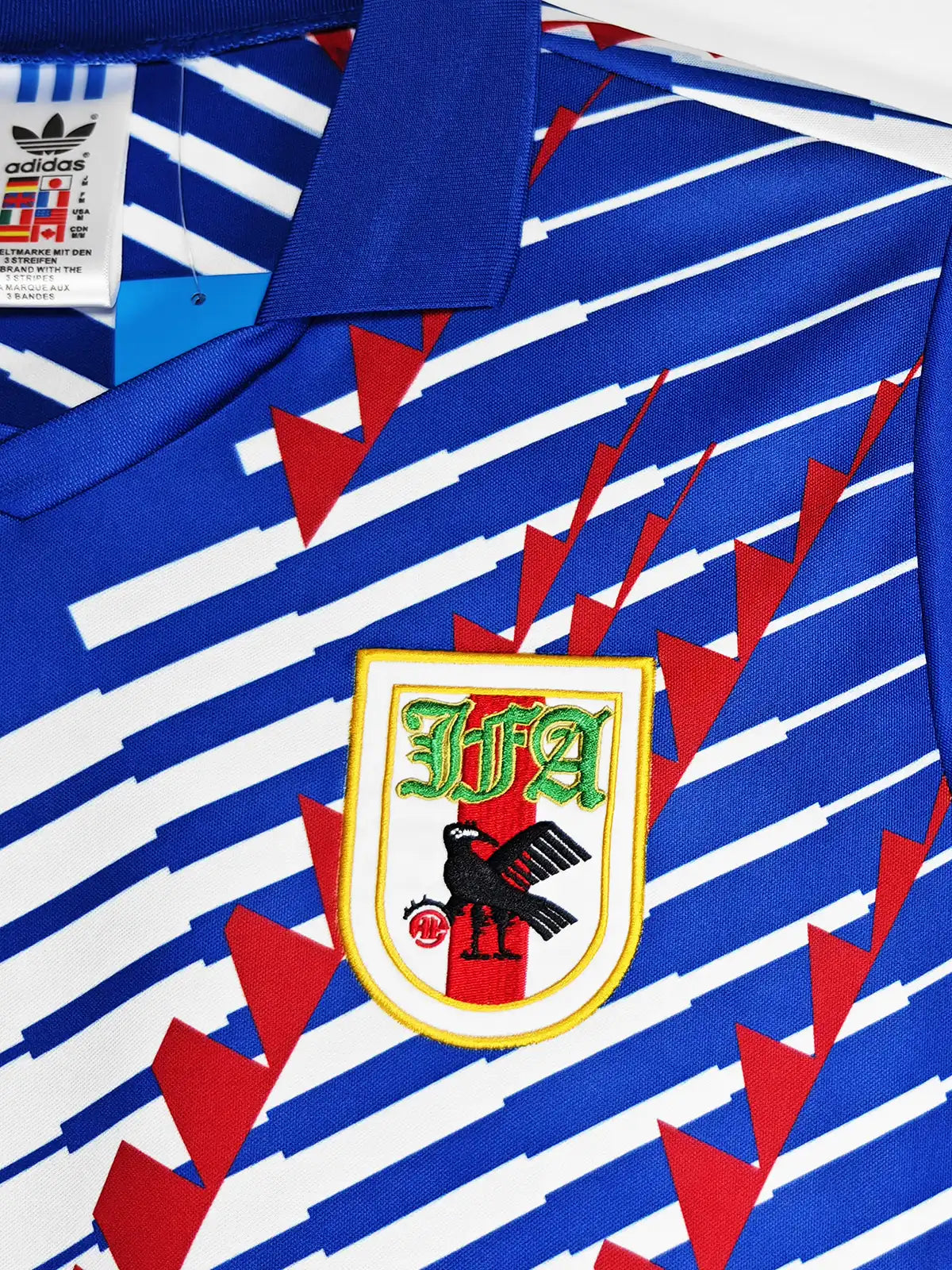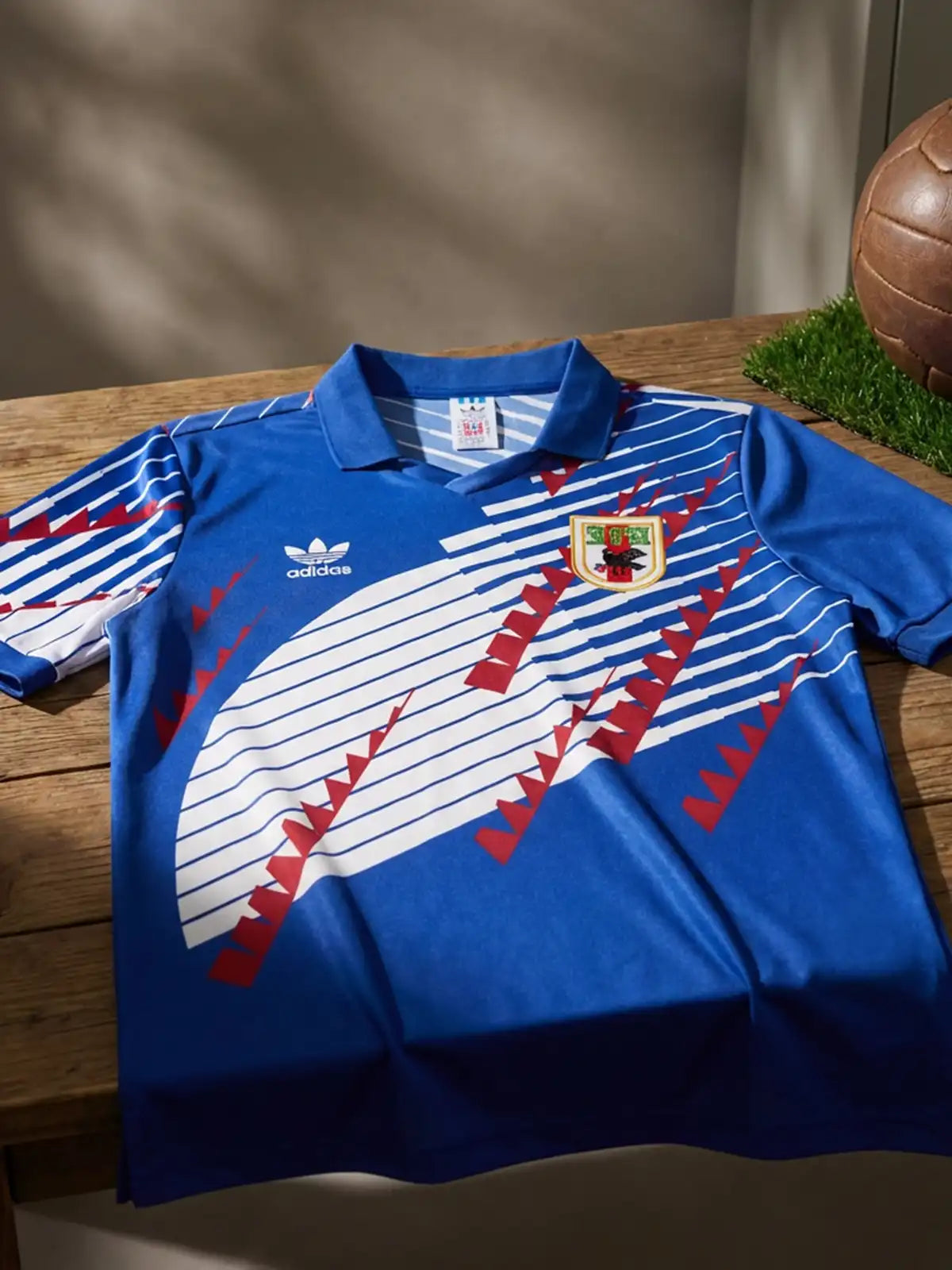 ロイヤルブルーを基調に、白の斜線と赤のジグザグモチーフを重ねたグラフィック配置。左胸にトレフォイル、右胸に日本代表エンブレムを配置し、襟付き(ポロカラー)の半袖仕様。背面は無地ベースで、肩付近に前身頃と連動する斜線パターンが入ります(画像はネーム・背番号なし)。