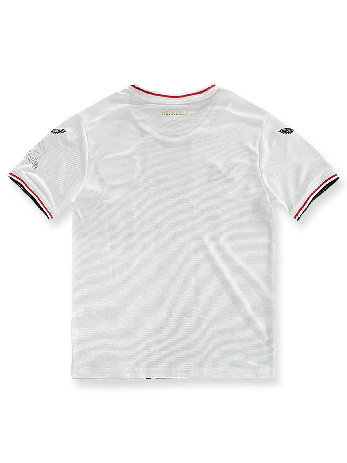 2024-25シーズンのレバークーゼンアウェイユニフォームは、白い背景に大胆な赤十字模様が施され、チームの不屈の精神と勝利への渇望を象徴しています。クラブエンブレムは高密度の刺繍技術で仕上げられ、上質な仕上がりを誇ります。軽量で通気性の高い素材を使用し、スポーツ中の快適さと動きやすさを実現。袖口と襟元の細かいディテールがデザイン全体に洗練された印象を与え、ファンやコレクターにとって理想的なアイテムです。