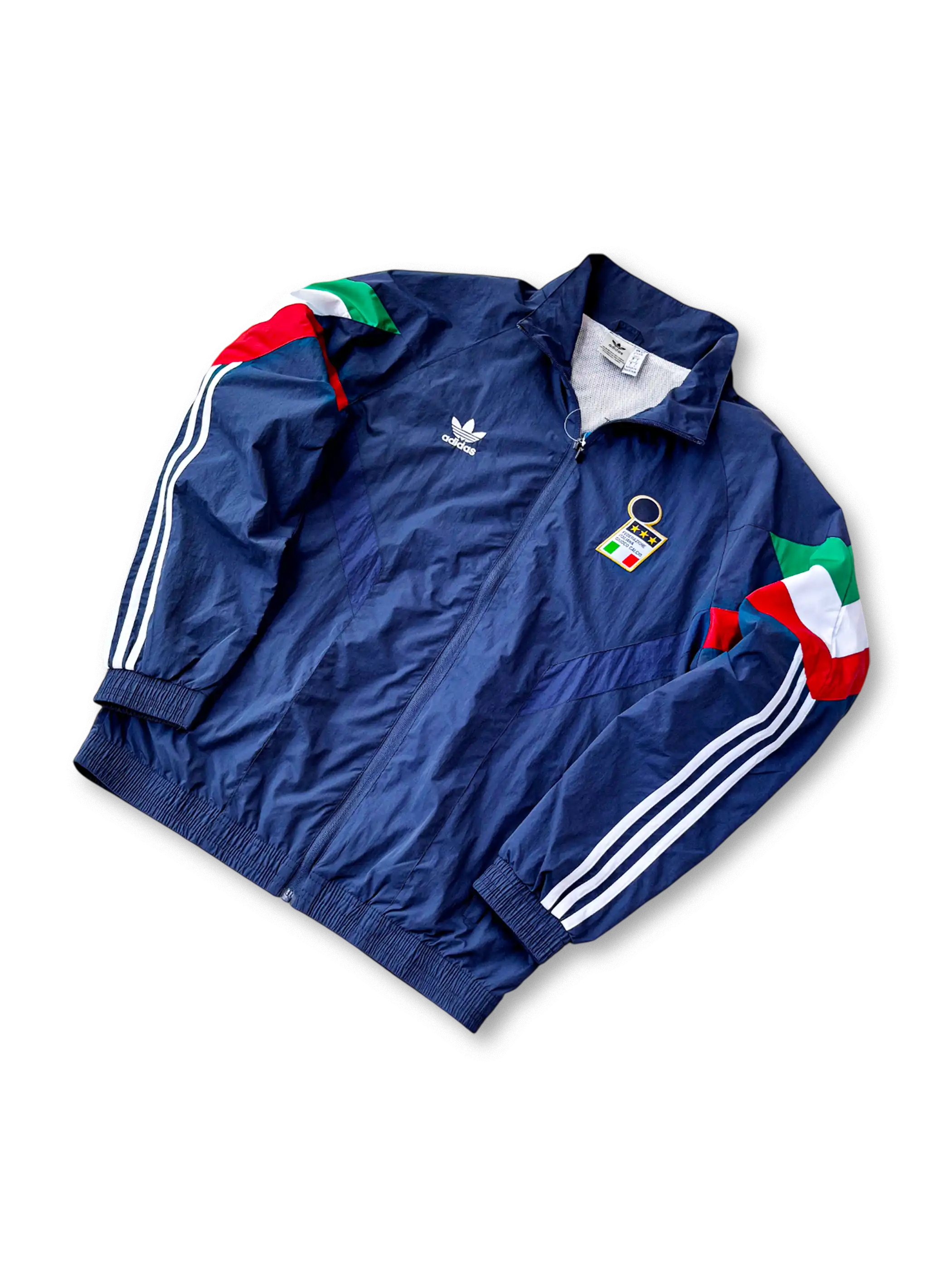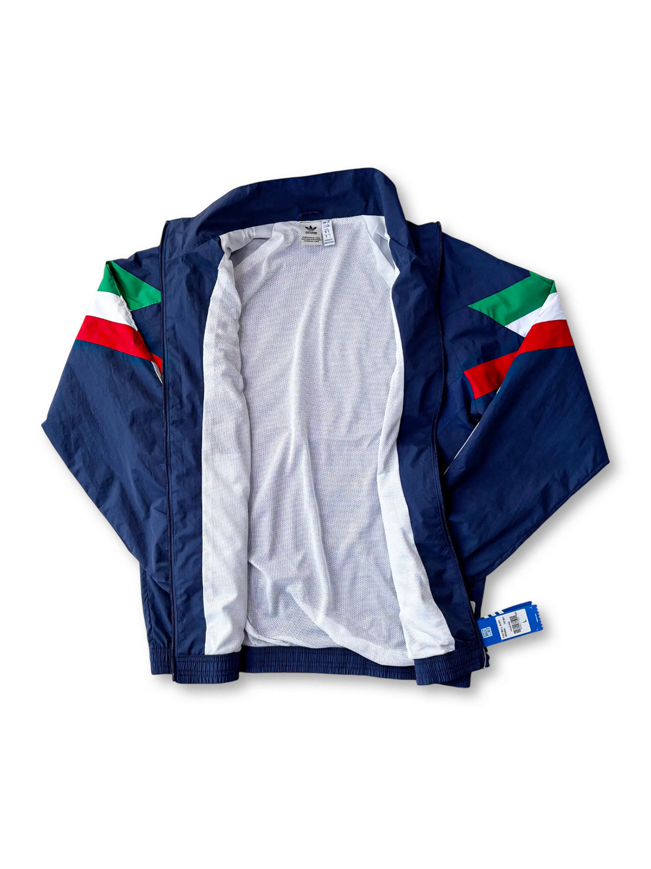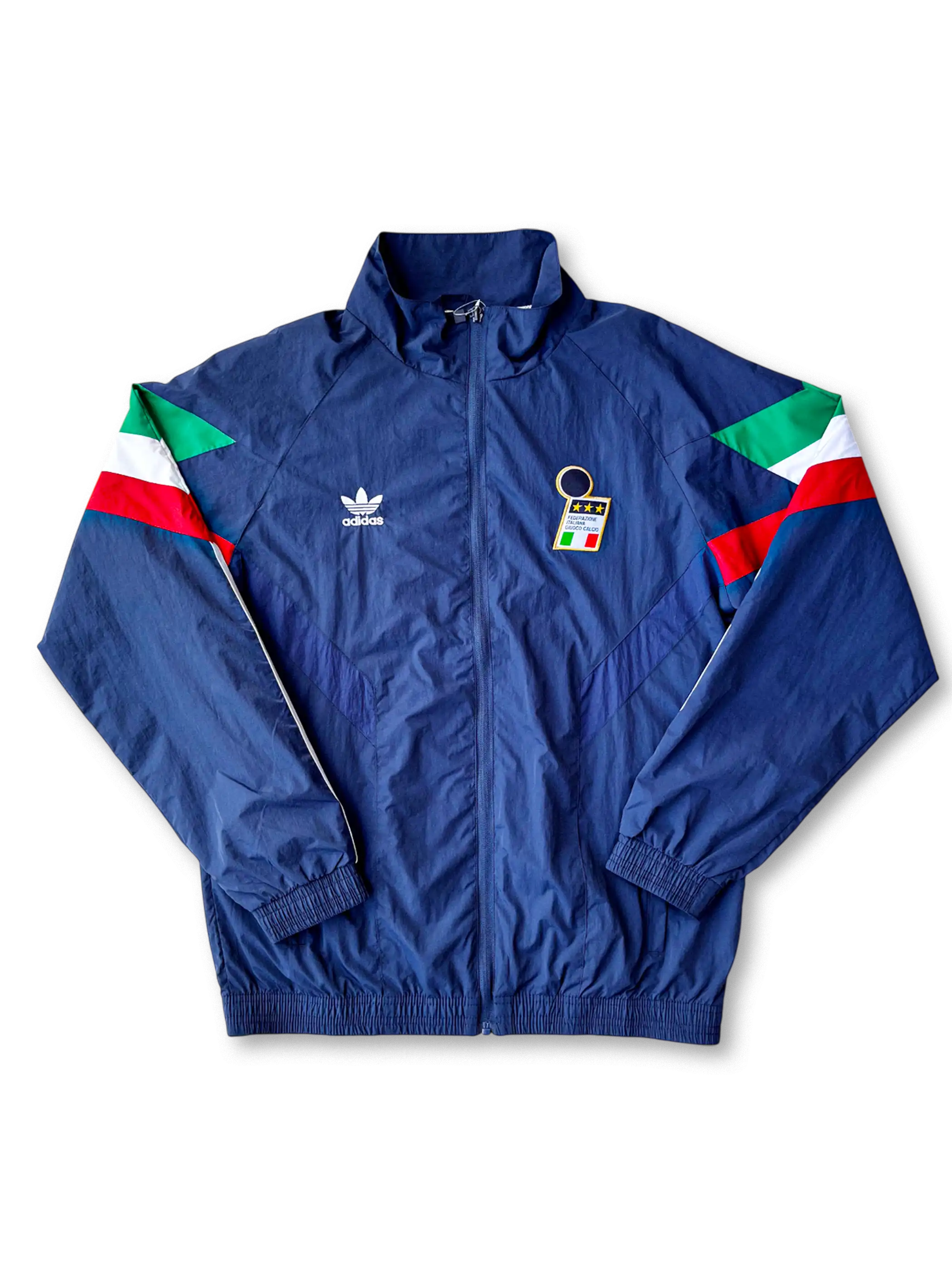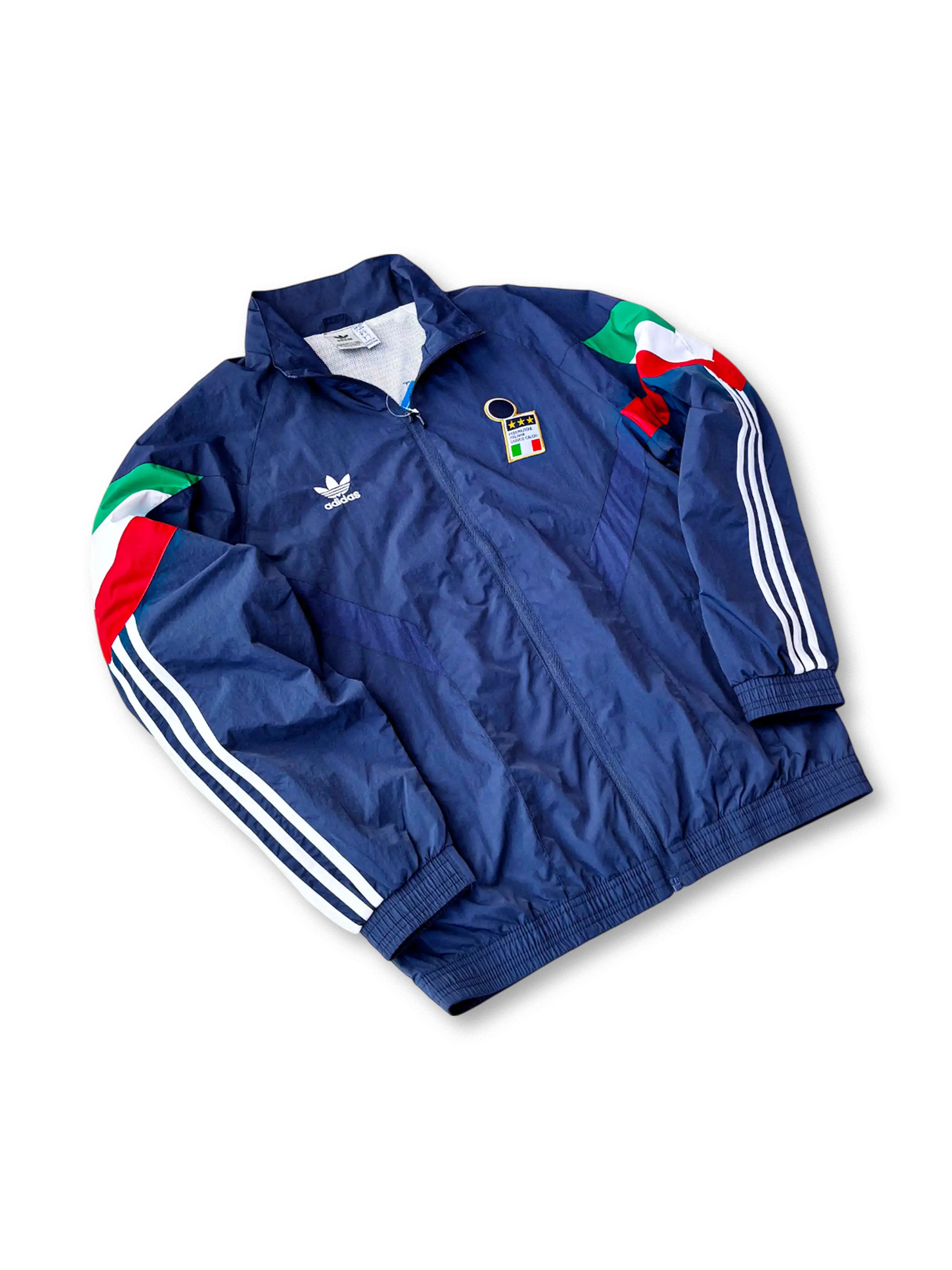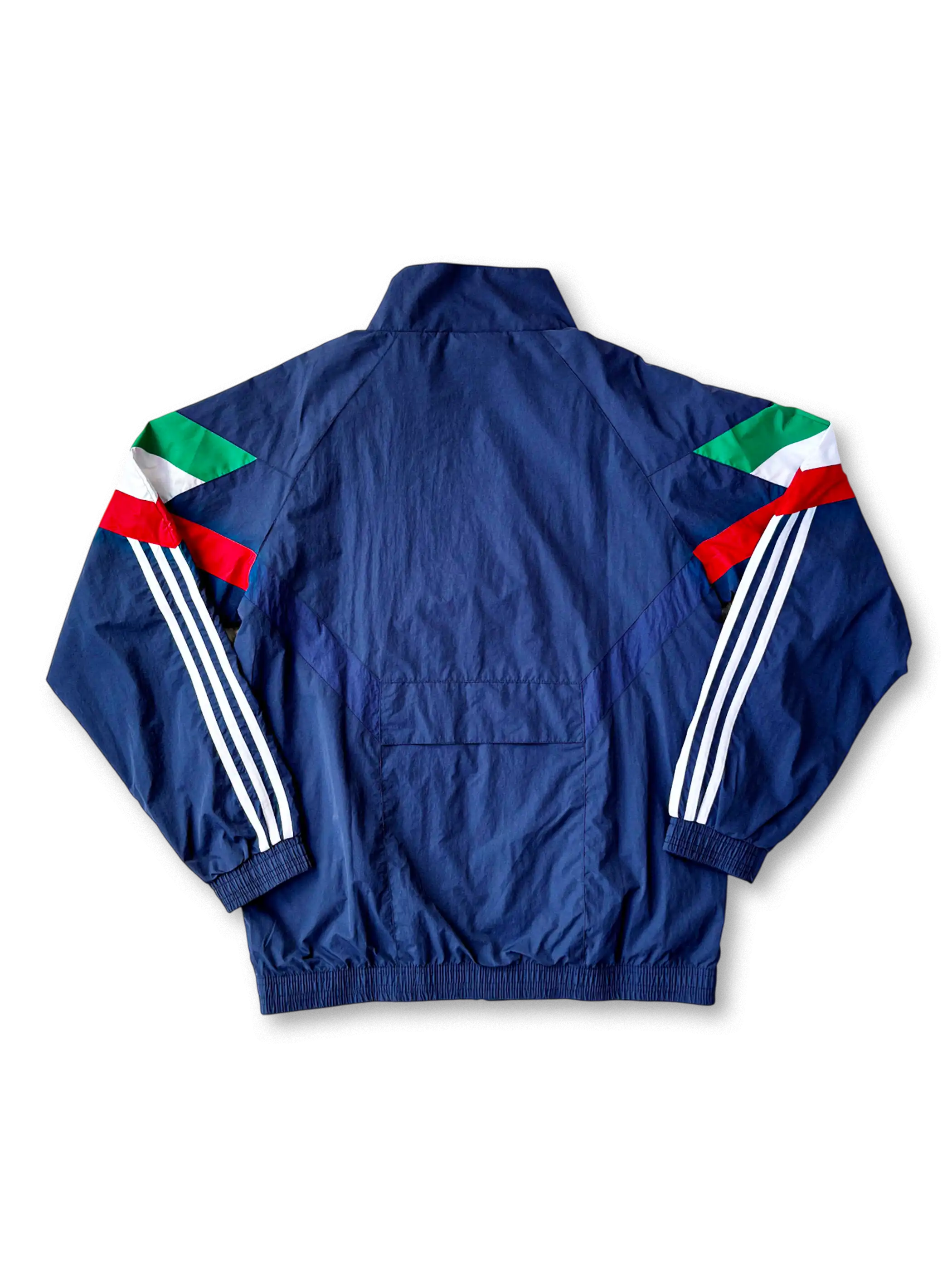 イタリア1994年のレトロなシングルレイヤーウィンドブレーカー。クラシックなブルーと国旗の三色デザインが融合し、ワールドカップ準優勝の栄光を讃える。
