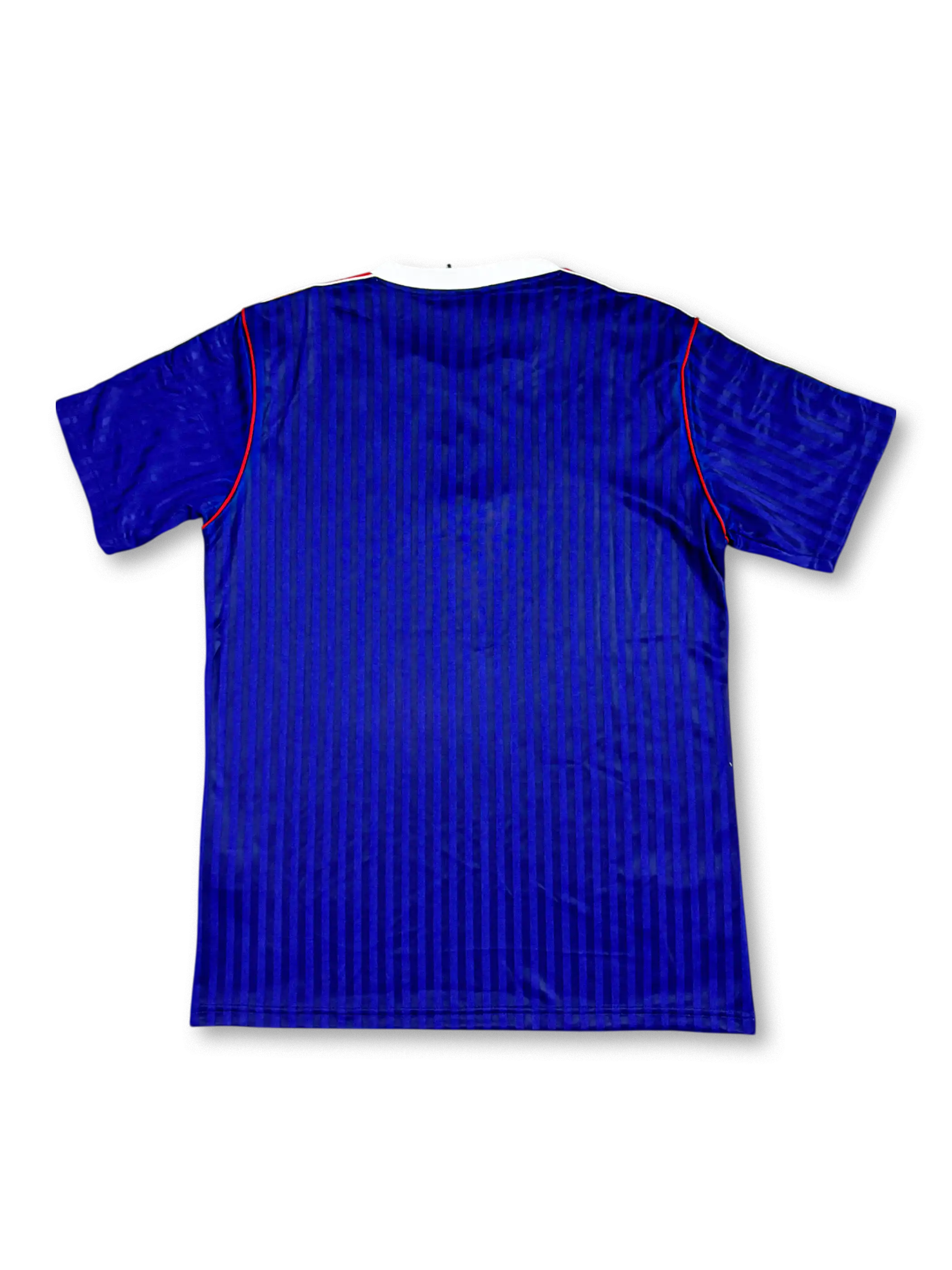 1990年代初頭のアーセナル・アウェイユニフォームに着想を得たネイビーレトロTシャツ。ボディは深いブルーにジャカード縦縞、袖には赤×白のトレフォイルスリーストライプをあしらい、肩から腕にかけてのラインがクラシカルな雰囲気を演出。胸にはゴールド縁取りのトレフォイルロゴと復刻砲台ロゴの刺繍を配置し、裾にはクラブロゴ入りラベルパッチが縫い付けられている。吸汗速乾性に優れた軽量素材を使用し、ヴィンテージファンやコレクターにとって理想的な一着。