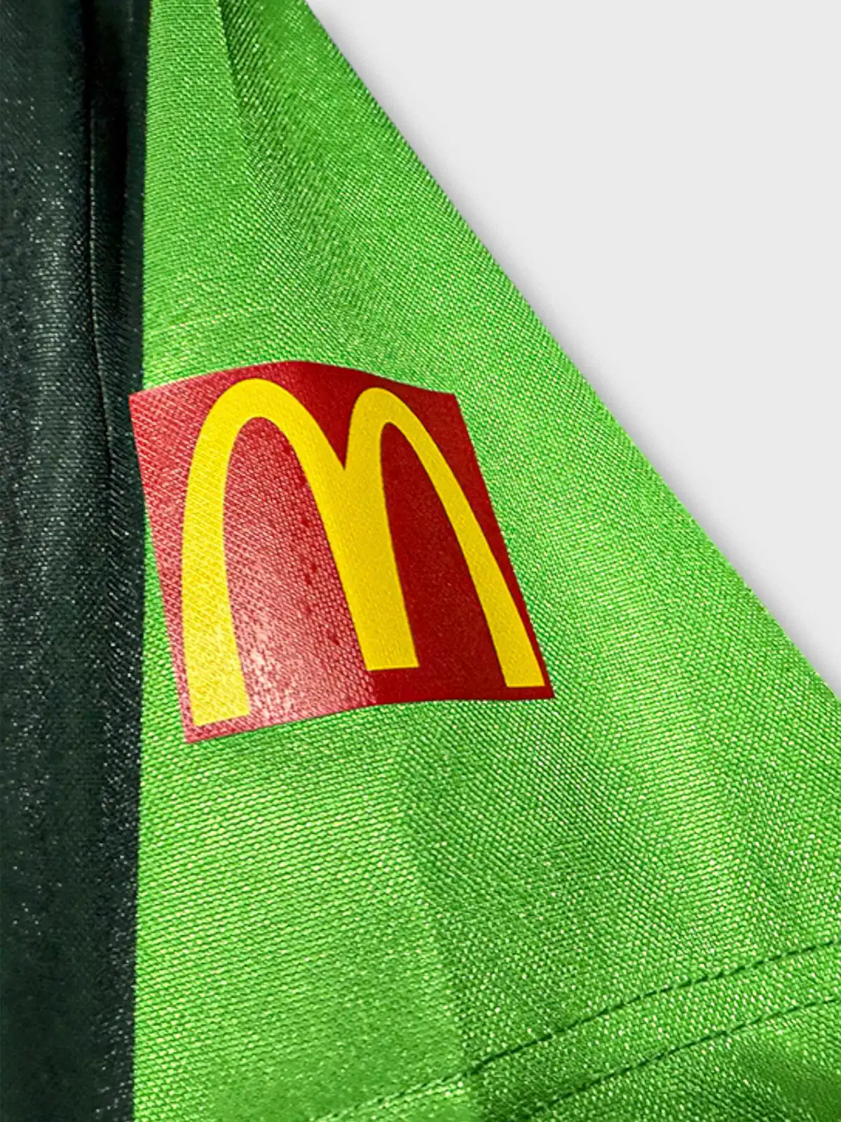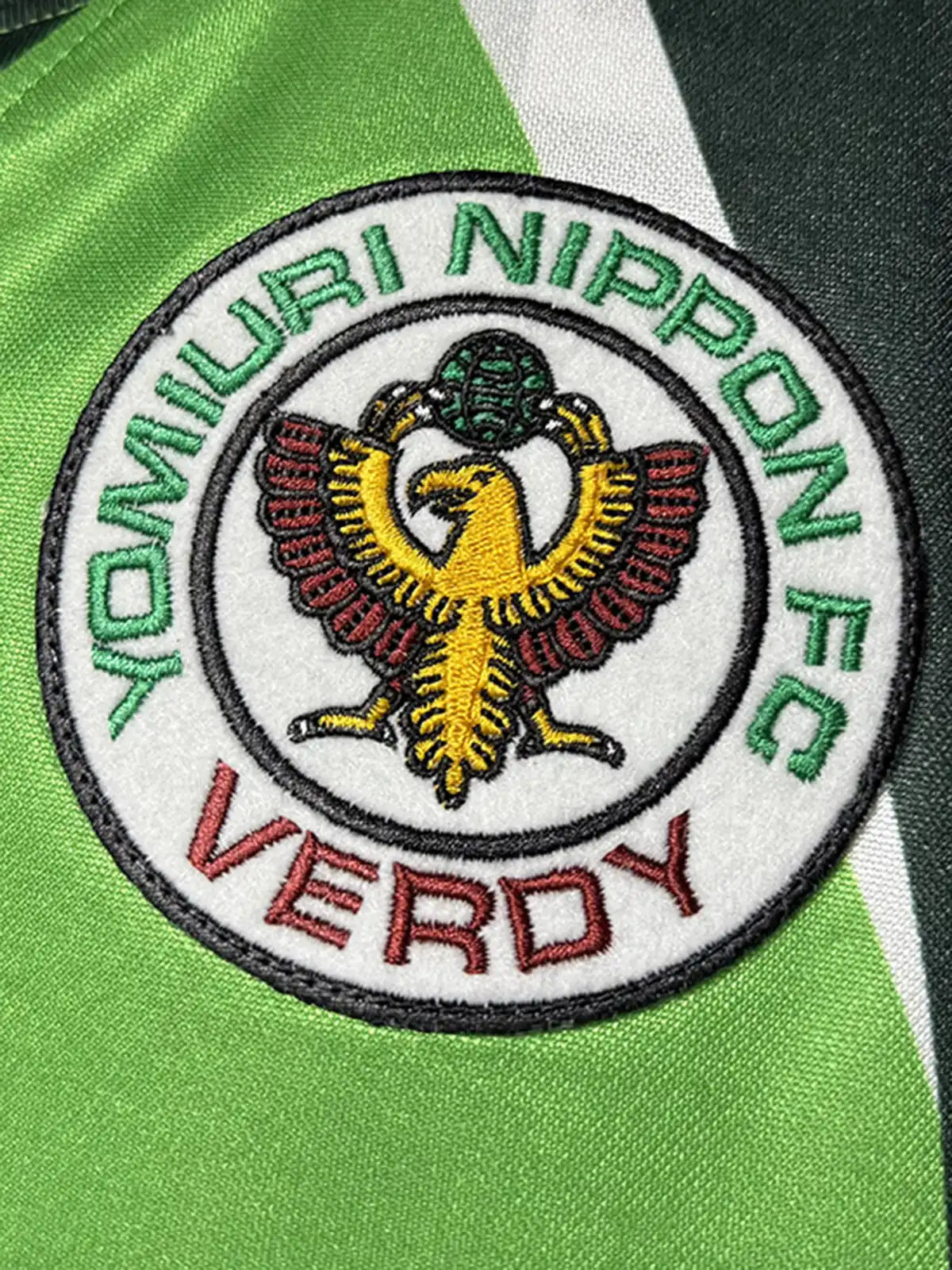 この1995年川崎ヴェルディ・ホームユニフォームは、Jリーグ全26試合で三浦知良が公式に着用し、スタジアムを沸かせた一着です。鮮やかなグリーン×ホワイトの斜めストライプに胸の「Coca-Cola」ロゴと袖の「McDonald’s」ロゴが当時のJリーグブームを象徴。Vネックは当時のプルオーバーデザインを再現し、背番号は高耐久な熱圧着仕様。吸汗速乾に優れたポリエステル素材とサイドメッシュインサートで、90年代夏のピッチでも快適性を保ちます。三浦知良の黄金期を彩る、稀少なヴィンテージコレクターズアイテムです。