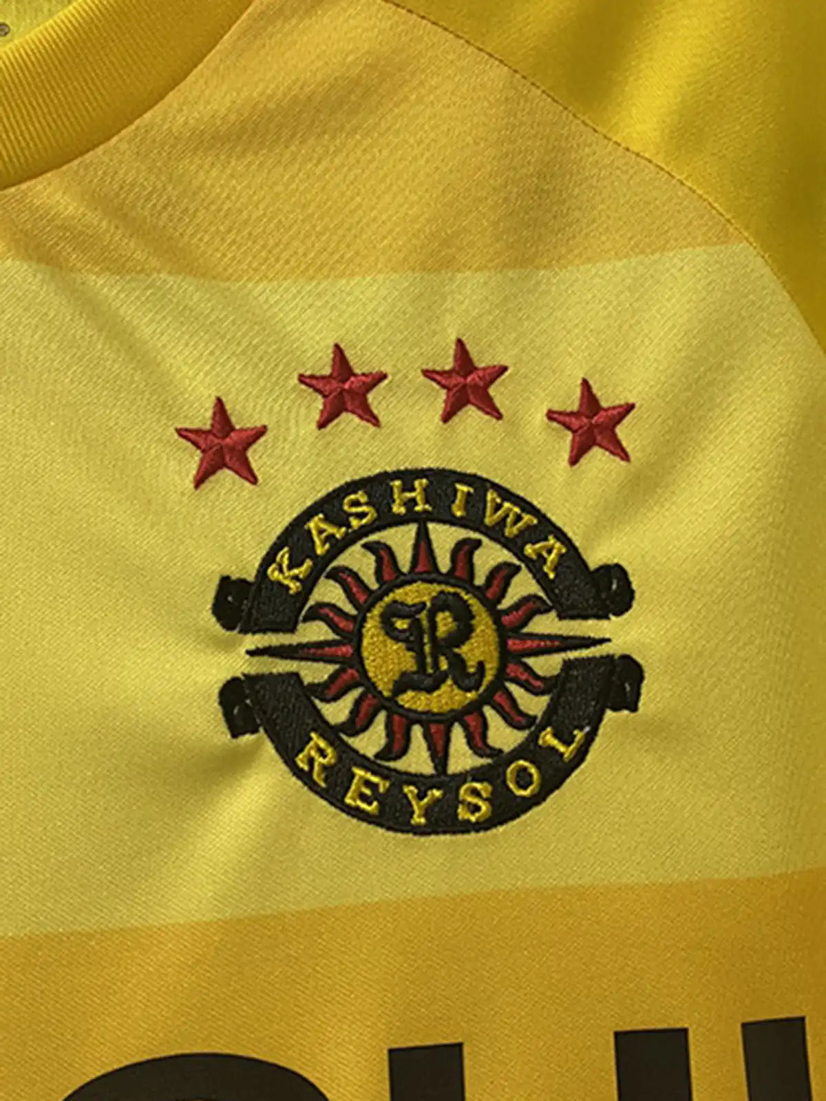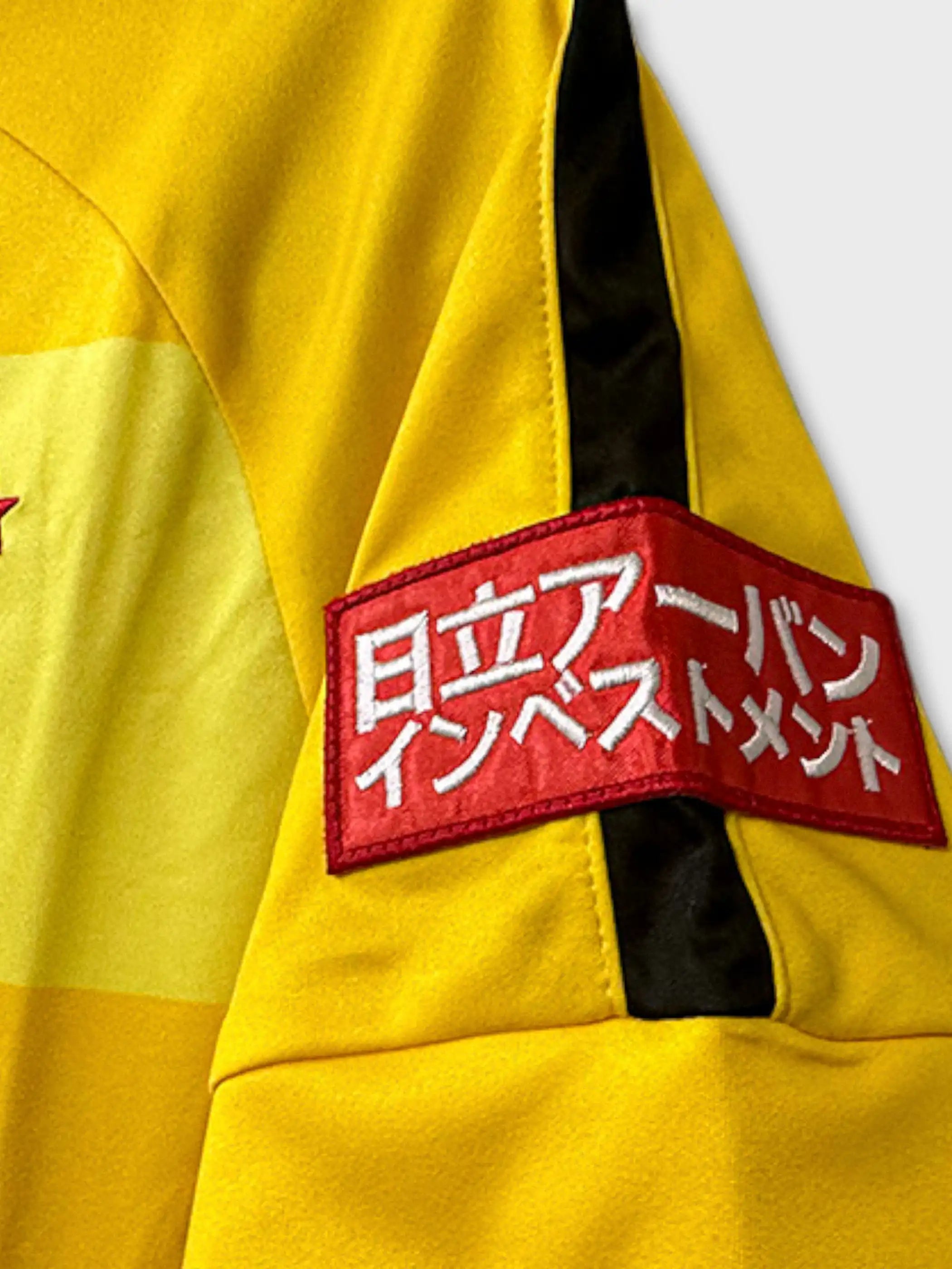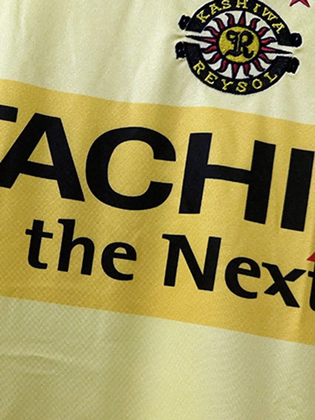 2017年の柏レイソルJ1リーグ公式戦で着用されたホームユニフォームは、クラブの象徴であるイエローを基調とし、ブラックのアクセントが全体を引き締める印象的なデザイン。胸元には「HITACHI Inspire the Next」のスポンサーロゴ、両袖と背面にも複数企業のスポンサーロゴが配置され、Jリーグらしい構成となっている。薄手ながら高密度なポリエステル生地で、吸汗速乾性に優れ、試合にも応援にも対応する実用的な一着。