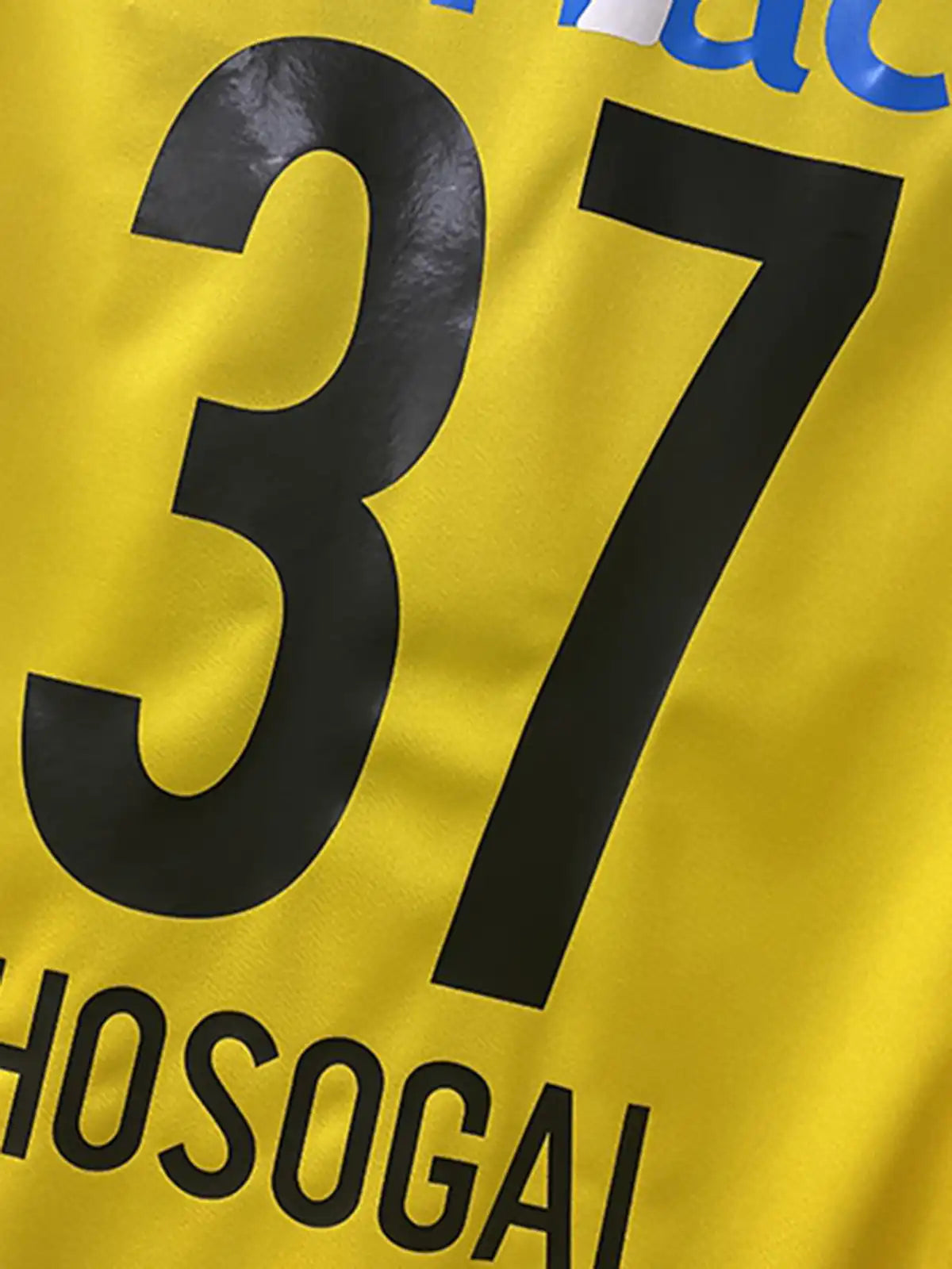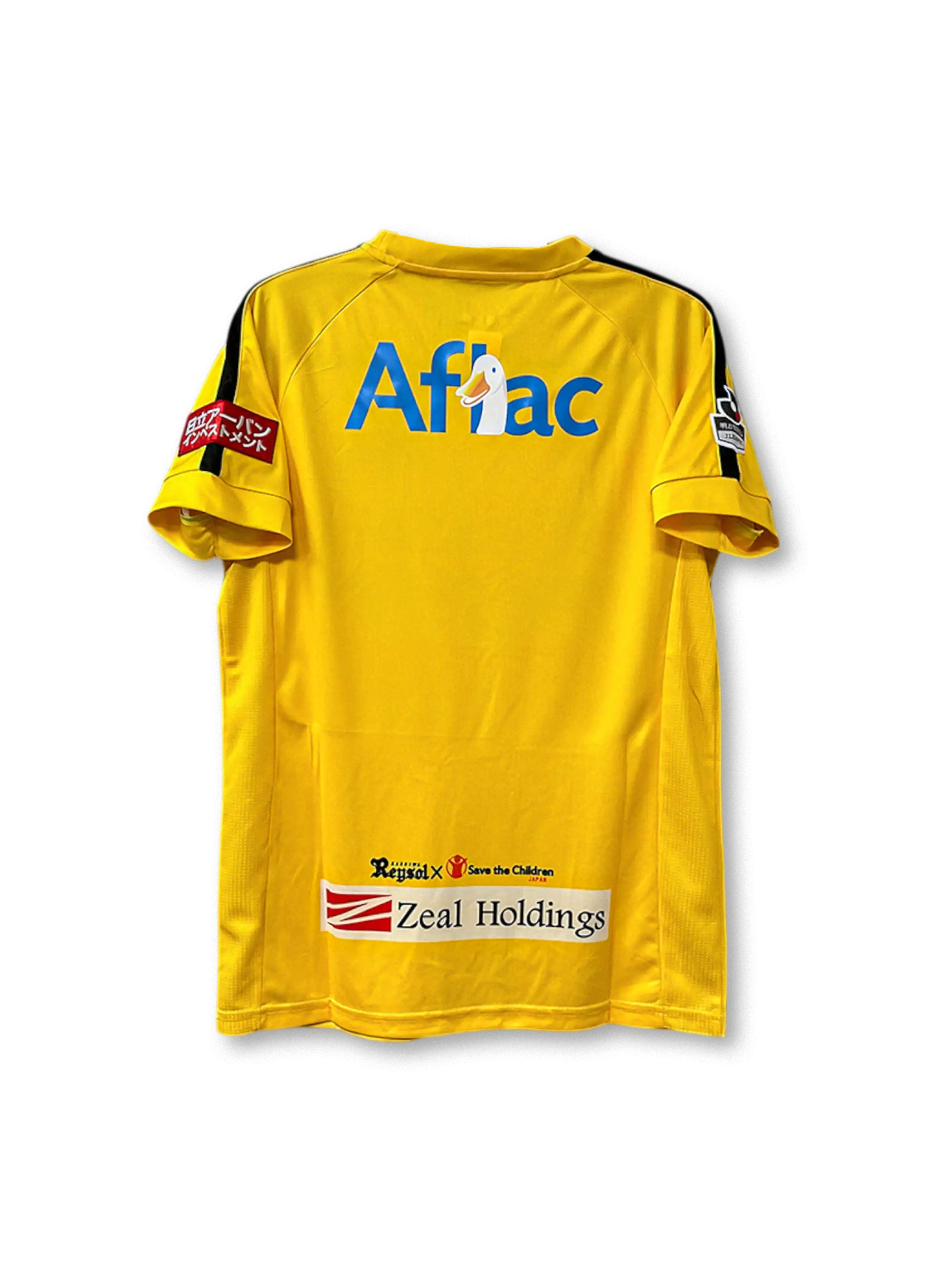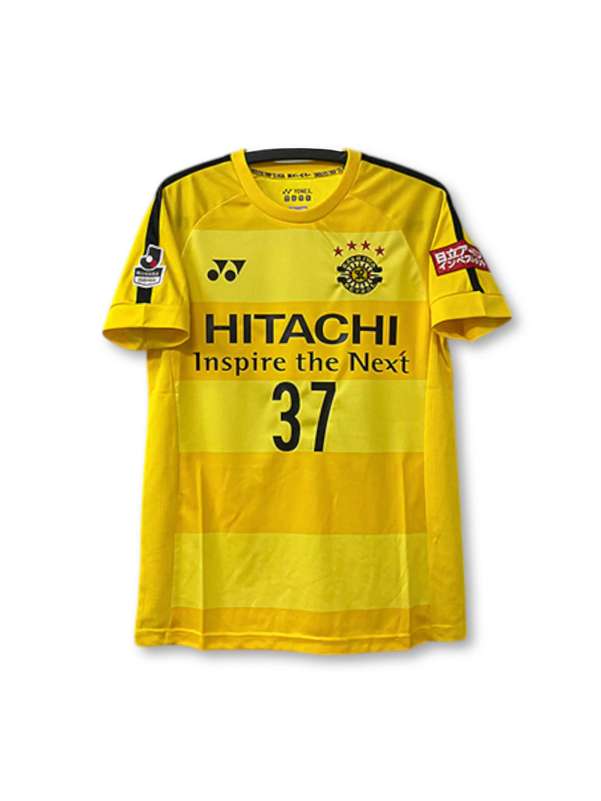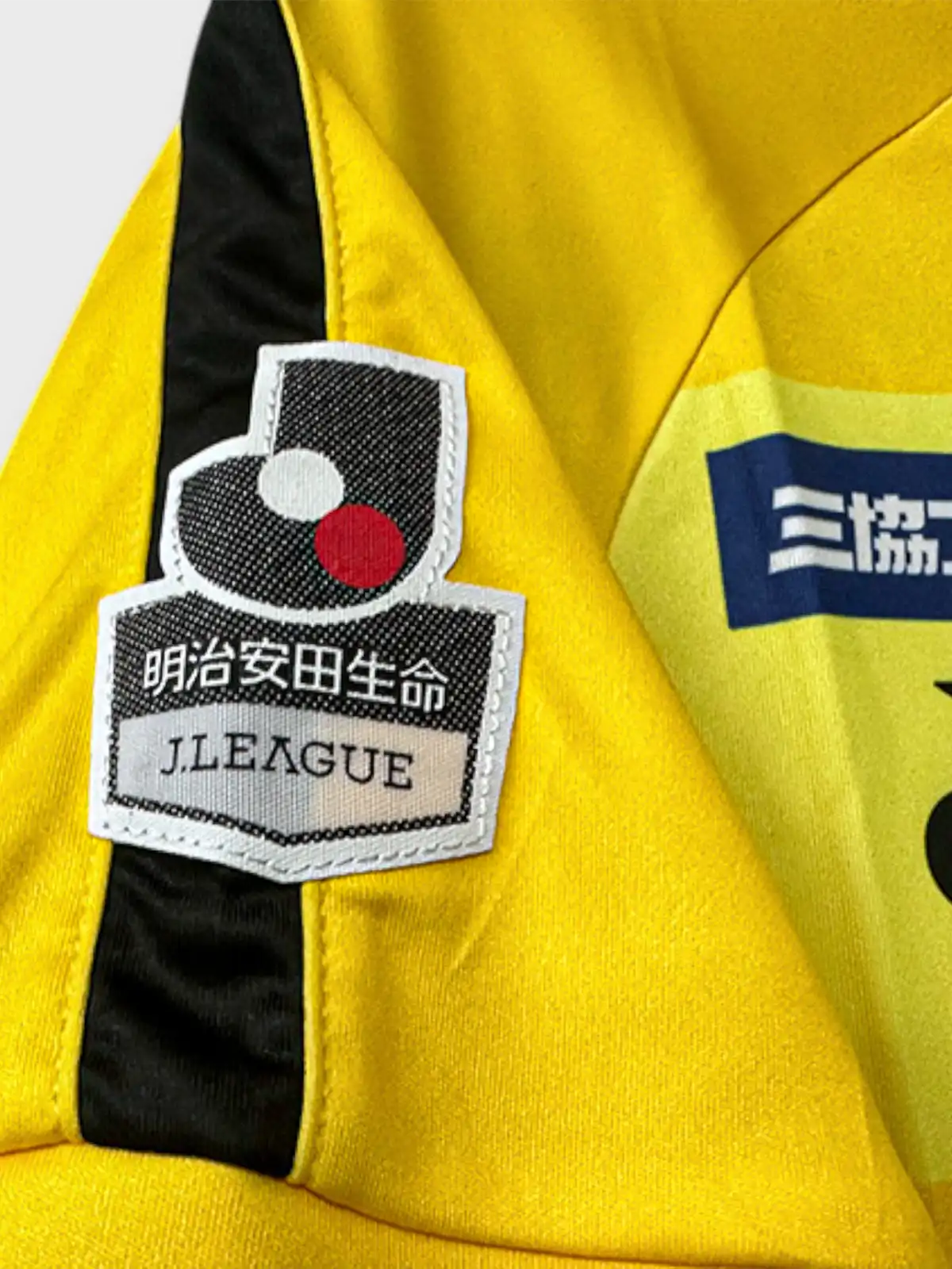 2017年の柏レイソルJ1リーグ公式戦で着用されたホームユニフォームは、クラブの象徴であるイエローを基調とし、ブラックのアクセントが全体を引き締める印象的なデザイン。胸元には「HITACHI Inspire the Next」のスポンサーロゴ、両袖と背面にも複数企業のスポンサーロゴが配置され、Jリーグらしい構成となっている。薄手ながら高密度なポリエステル生地で、吸汗速乾性に優れ、試合にも応援にも対応する実用的な一着。