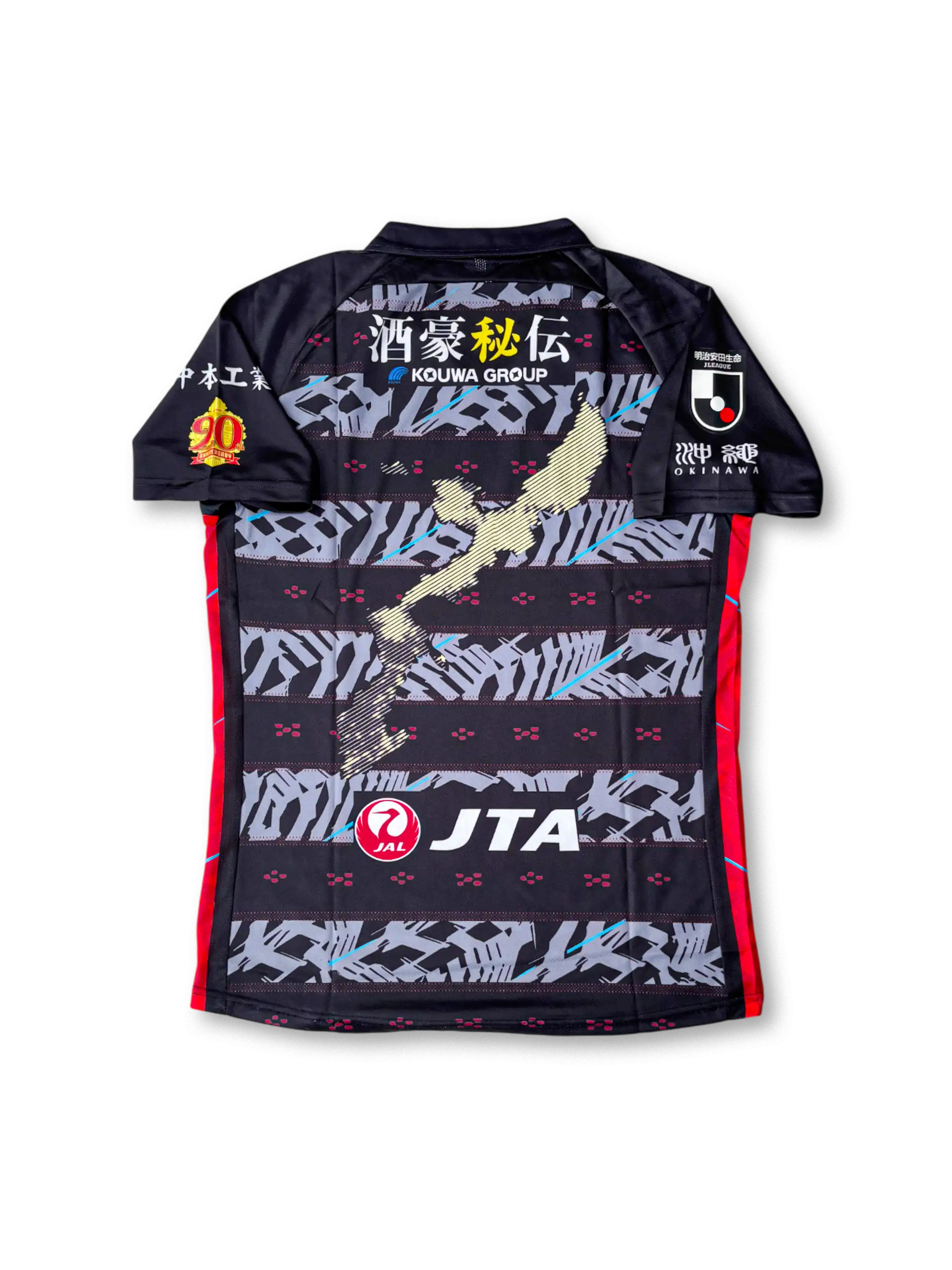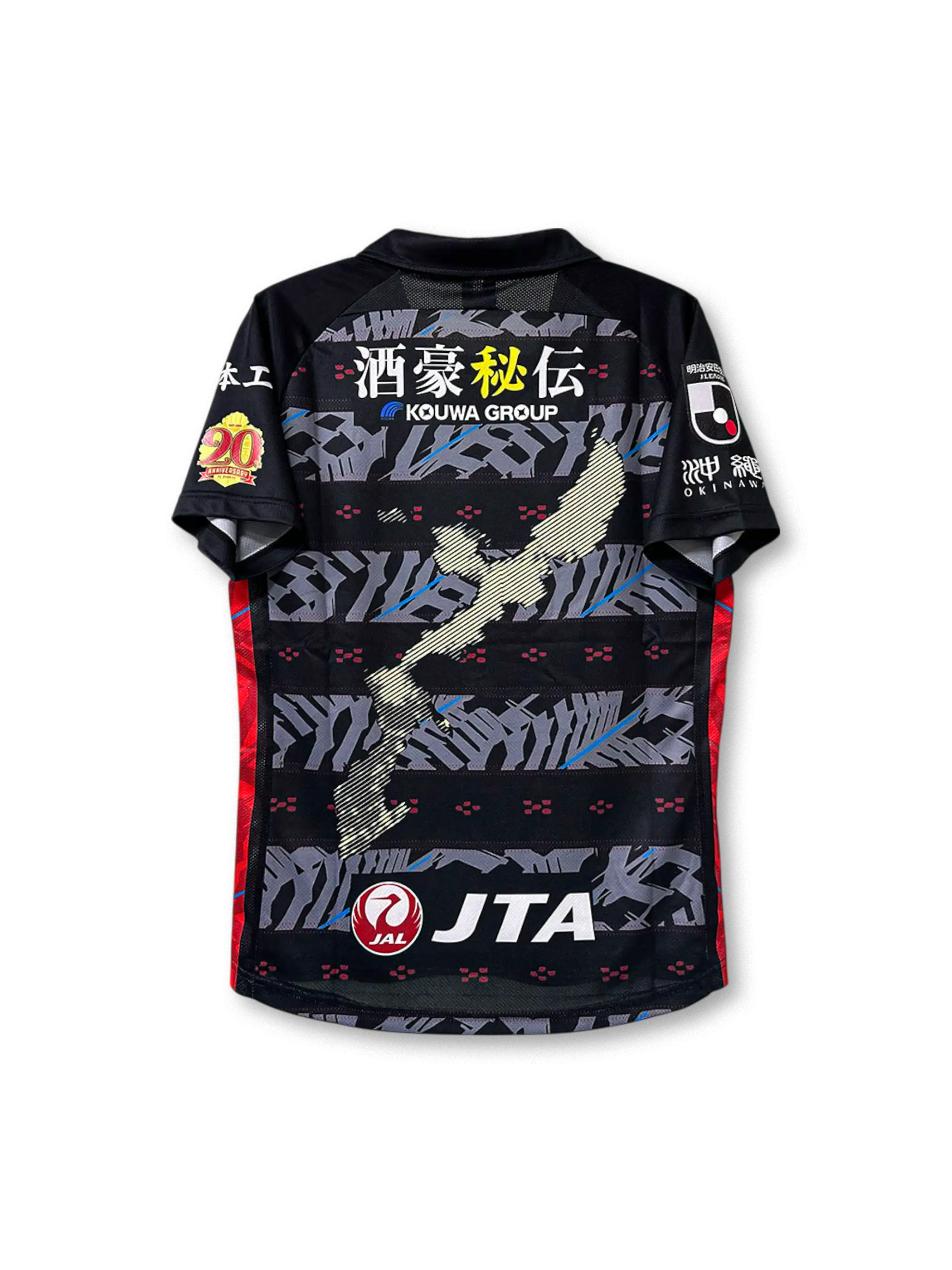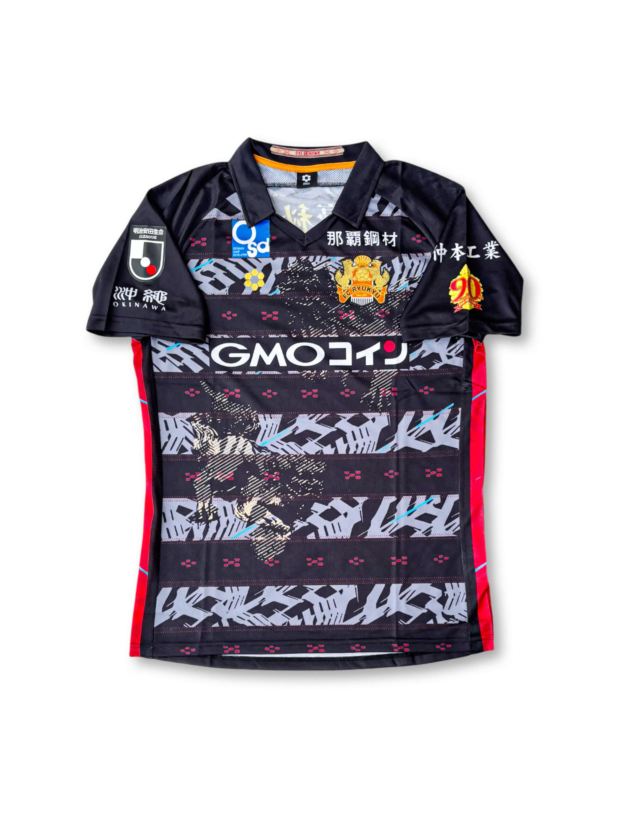 FC琉球のクラブ創設20周年を記念して制作された2023年特別仕様ユニフォーム。ホームは深紅を基調とし、沖縄伝統の紅型や首里城の意匠を反映した幾何学模様が昇華プリントで表現され、右袖には「20周年記念」ワッペンが刺繍されている。アウェイモデルはブラックをベースに、ゴールドの装飾と伝統的なモチーフが融合。どちらもGMOコインを中心とした複数スポンサーを配置し、軽量で吸汗速乾に優れた高機能ポリエステル素材を採用した選手仕様。