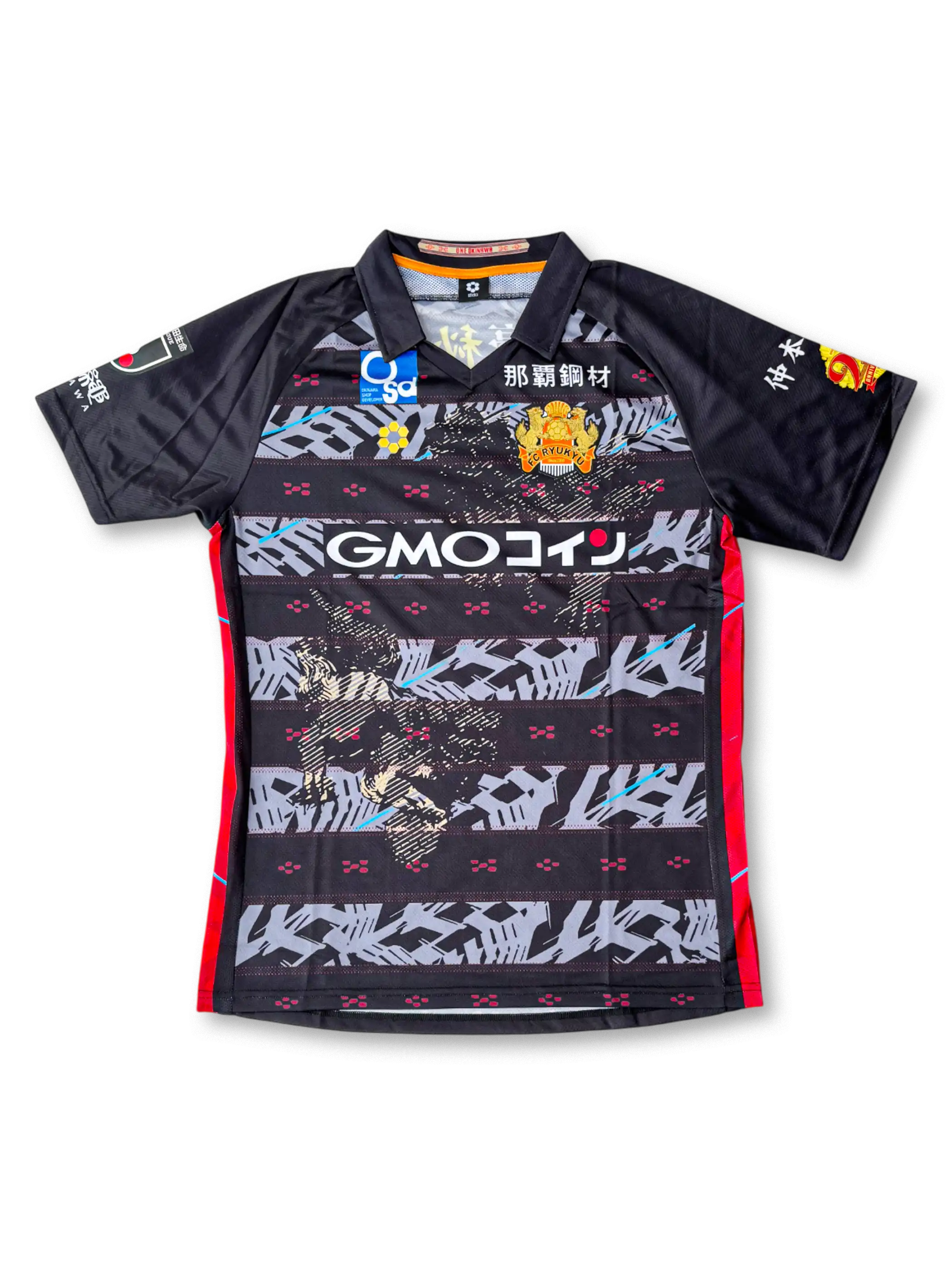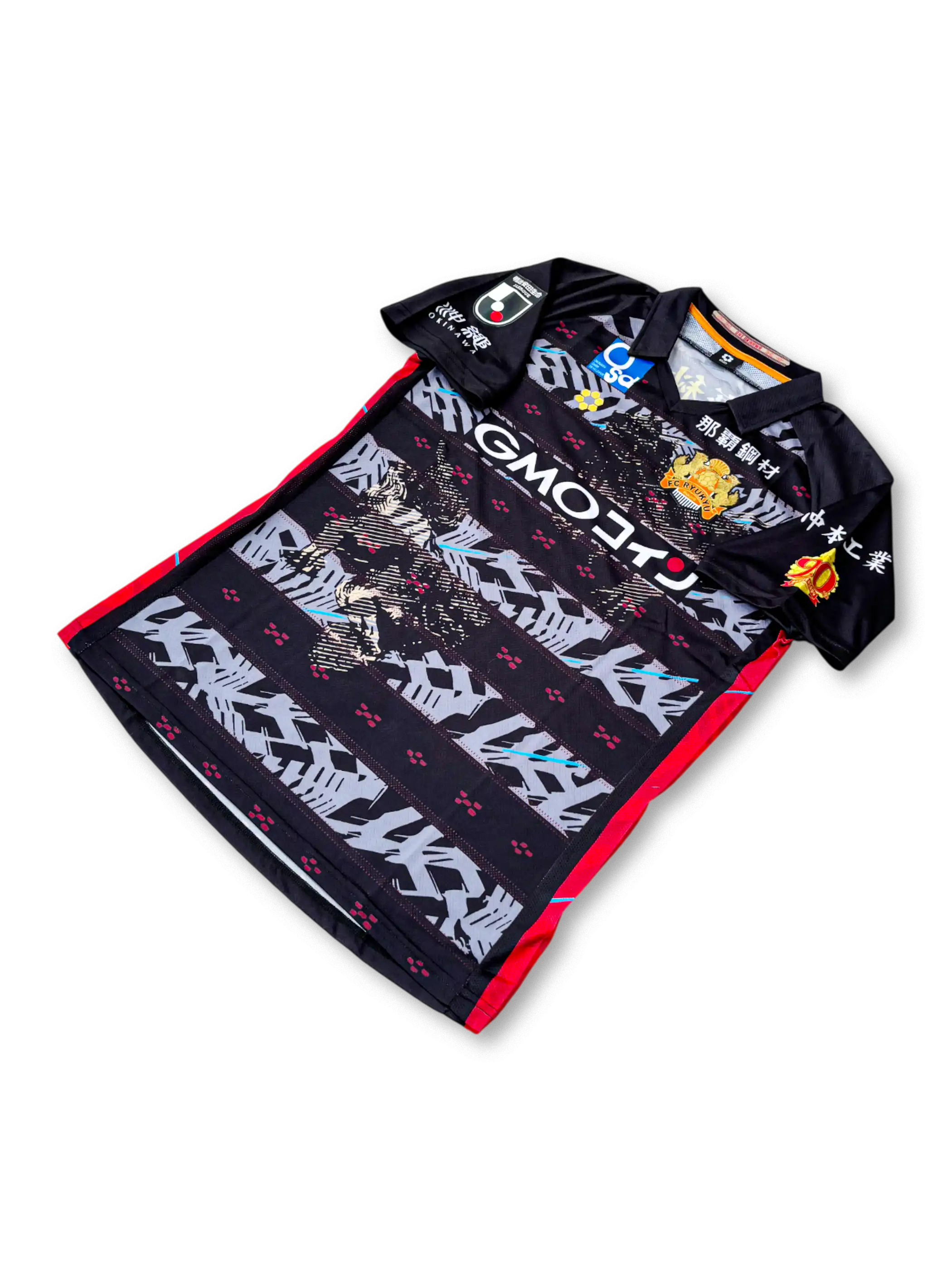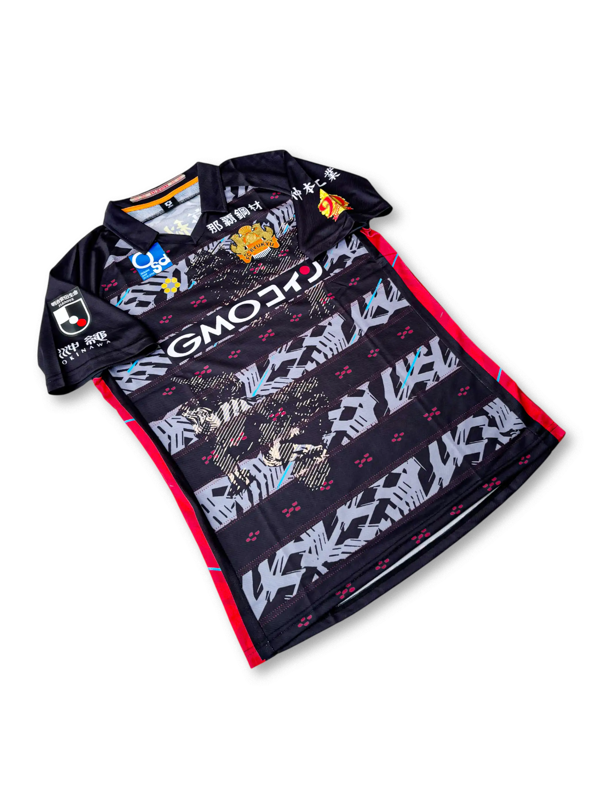 FC琉球のクラブ創設20周年を記念して制作された2023年特別仕様ユニフォーム。ホームは深紅を基調とし、沖縄伝統の紅型や首里城の意匠を反映した幾何学模様が昇華プリントで表現され、右袖には「20周年記念」ワッペンが刺繍されている。アウェイモデルはブラックをベースに、ゴールドの装飾と伝統的なモチーフが融合。どちらもGMOコインを中心とした複数スポンサーを配置し、軽量で吸汗速乾に優れた高機能ポリエステル素材を採用した選手仕様。