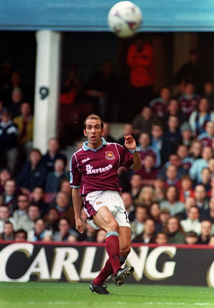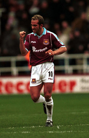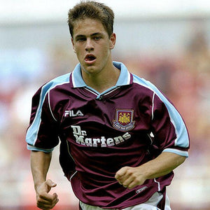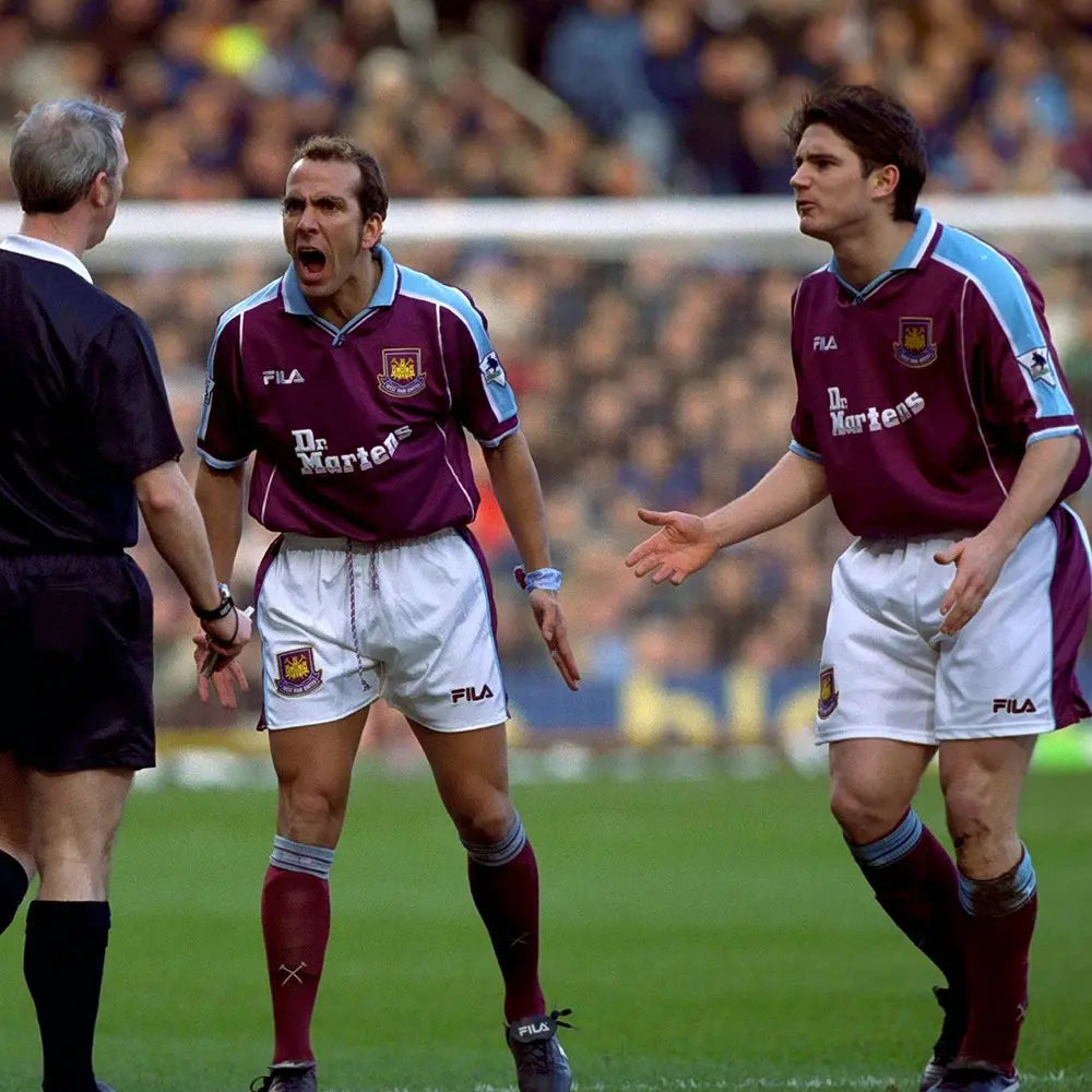当時のアイコニックなマルーンとライトブルーの配色、Dr. Martensロゴ入り胸スポンサー、折り返し襟デザインを忠実に再現。軽量ポリエステル素材とパネル切り替えによる通気性で、スタジアムの熱気にも耐えうる快適性を実現。