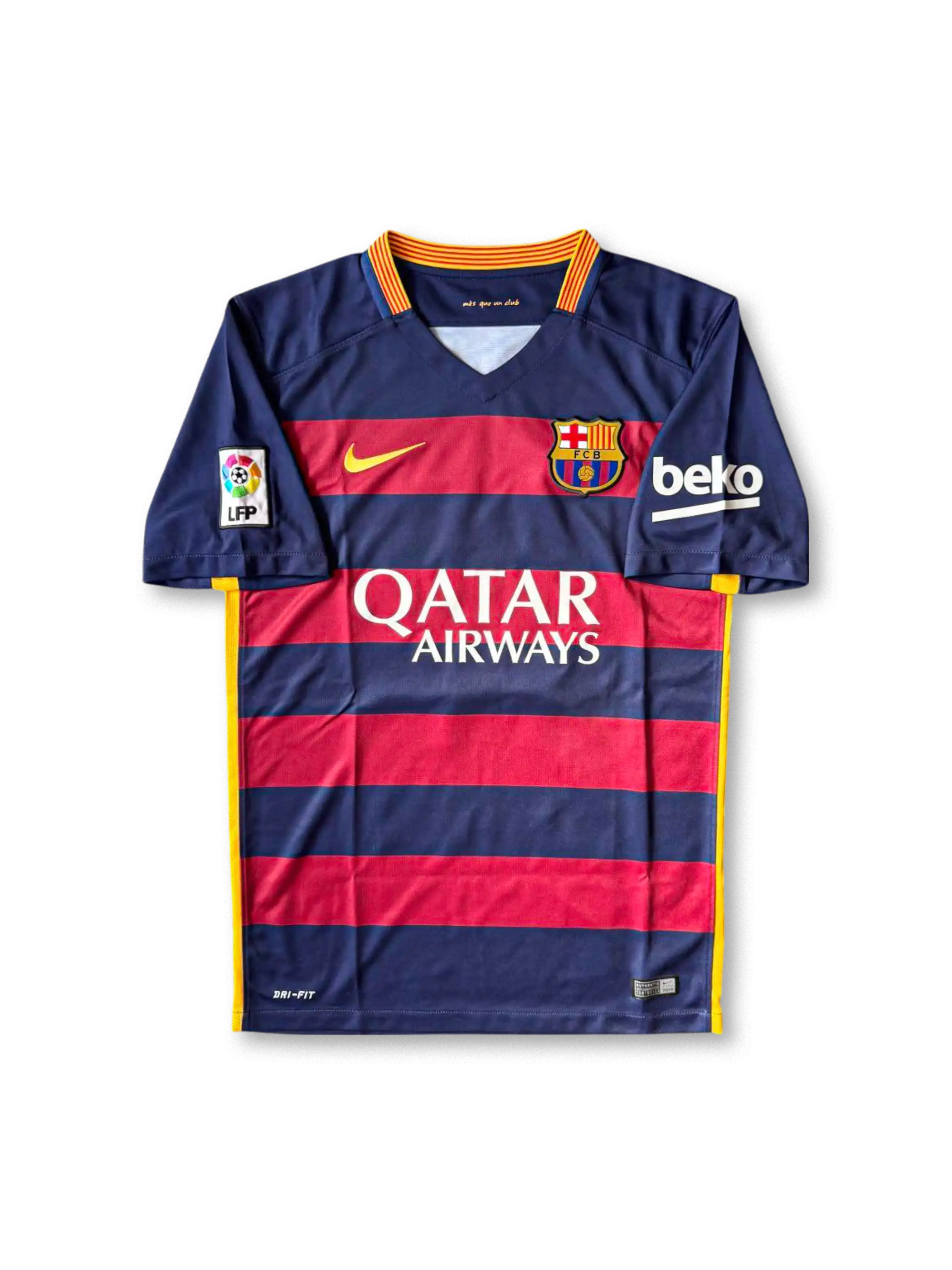 クラシックな縦縞のカタルーニャカラーにQatar AirwaysロゴとUNICEFバッジを配し、Nike Dri-FITポリエステル素材が抜群の通気性とフィット感を実現。公式刺繍エンブレムとオフィシャル背番号プリントが当時の仕様を忠実に再現しています。