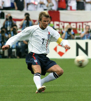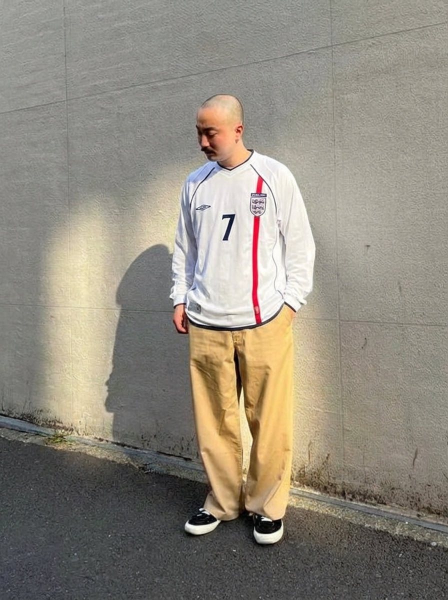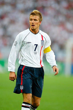 ピュアホワイトのベース生地に胸部右側にセントジョージクロスを想起させる縦レッドストライプ、全身にネイビーのパイピングラインを配した2002年大会専用デザインを採用。長袖仕様でVネックカラー内側にネイビー×レッドトリム、袖口にネイビーリブと左裾にUmbroラバータグを装備。左胸にUmbroダイヤモンドロゴ、右胸に三獅子(スリーライオンズ)ENGLANDエンブレム、胸部中央にネイビー大型#7フロッキングプリントを配した日韓W杯正規品。