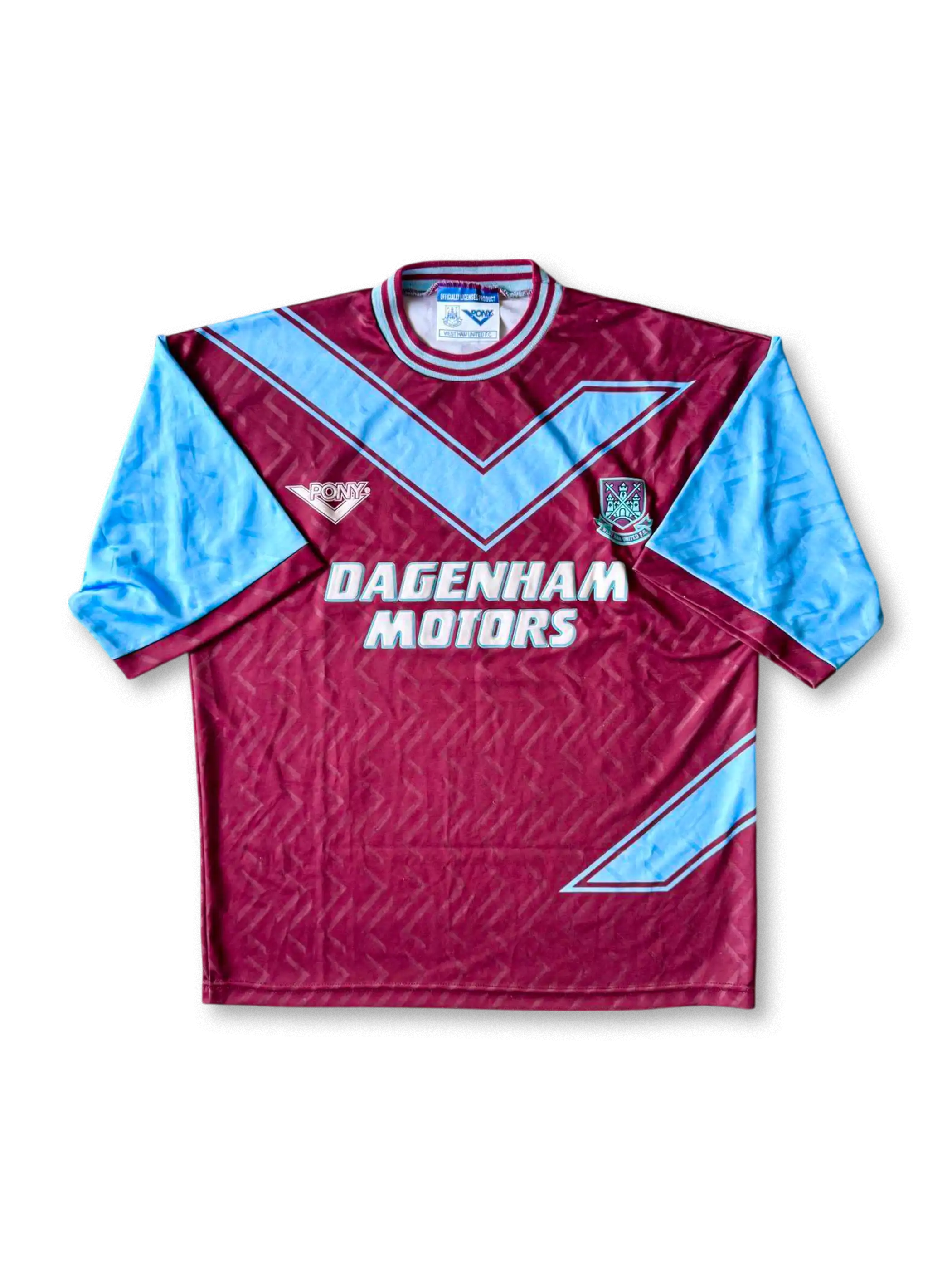 1993–95シーズンのウェストハム・ユナイテッドホームユニフォームは、クラレットとスチールブルーのクラシックカラーを基調に、胸元のDAGENHAM MOTORSロゴが印象的。高品質なポリエステル素材とアディダス製のスリーストライプが肩に配され、快適な着心地を実現。90年代プレミアリーグ黎明期のサッカースタイルと伝統を体現し、コレクターズアイテムとしても高い評価を得ています。