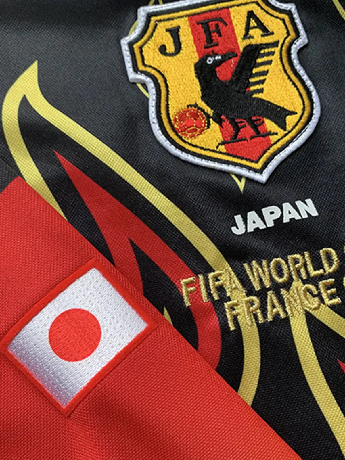 「ビンテージサッカージャージ」「レトロ日本代表キット」「クラシックサッカーシャツ」のキーワードを備えた、1998年日本代表ホームGK川口能活20番ユニフォーム(グリーン)は、刺繍エンブレム、炎柄プリント、透湿速乾素材を融合させたコレクターズピース。
