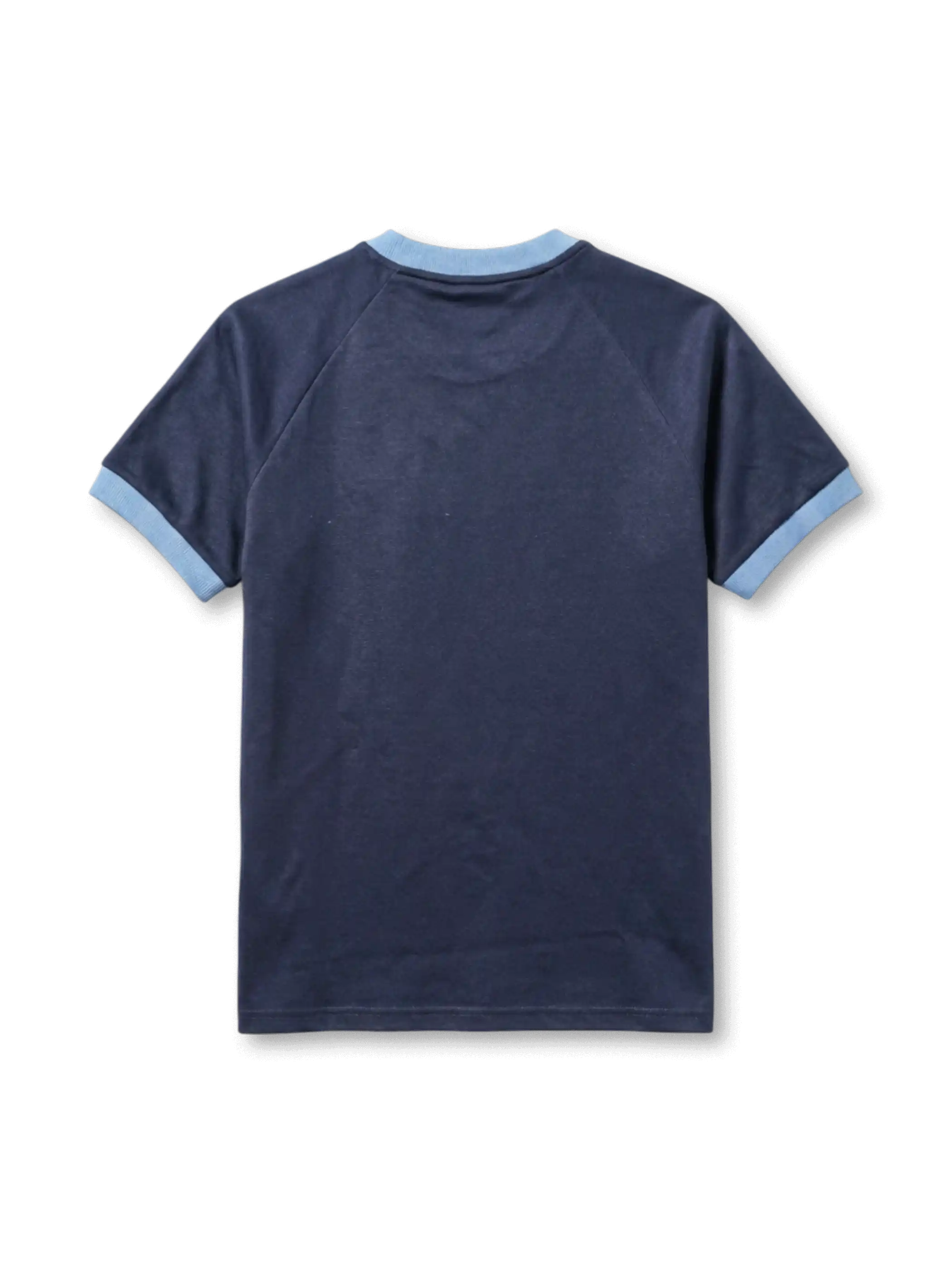 ベースカラーはダークネイビー(ネイビーブルー)。クルーネック型カラーはスカイブルーのリブ仕様で、袖口も同色リブトリム。両肩から袖口にかけてスカイブルーの3本ストライプが全長配置されたラグラン袖構成となっており、1970-80年代のadidas製アルゼンチン代表ウェアのデザイン言語をコットン混素材で復刻した構成となっている。カラー内側にはゴールドの太陽紋章(Sol de Mayo)装飾ラベルを装着。