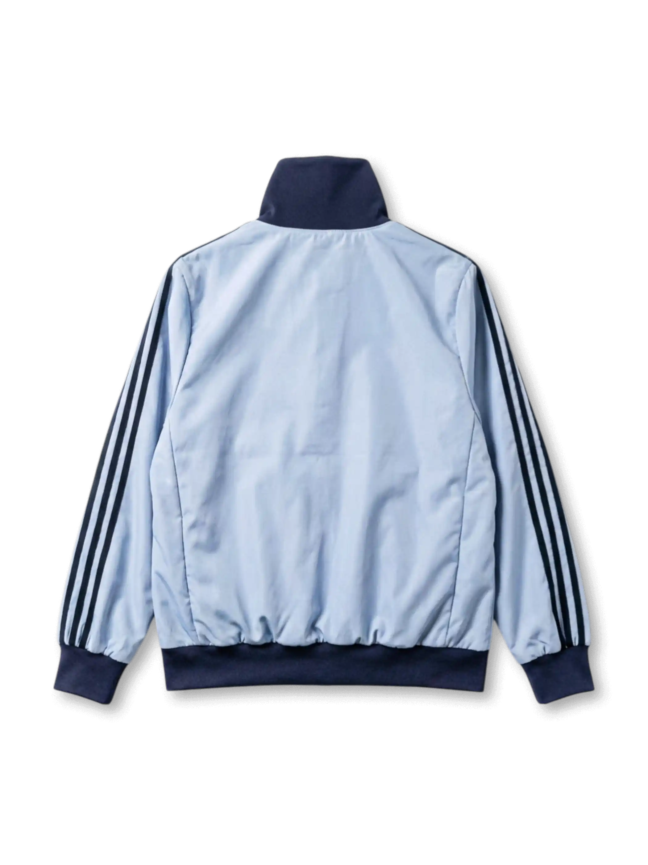 スカイブルーサテンベースにネイビーの3本ストライプ・リブカラー・裾リブ、adidasトレフォイル・AFAヴィンテージ筆記体エンブレムを配したadidas Originals復刻トラックジャケット。