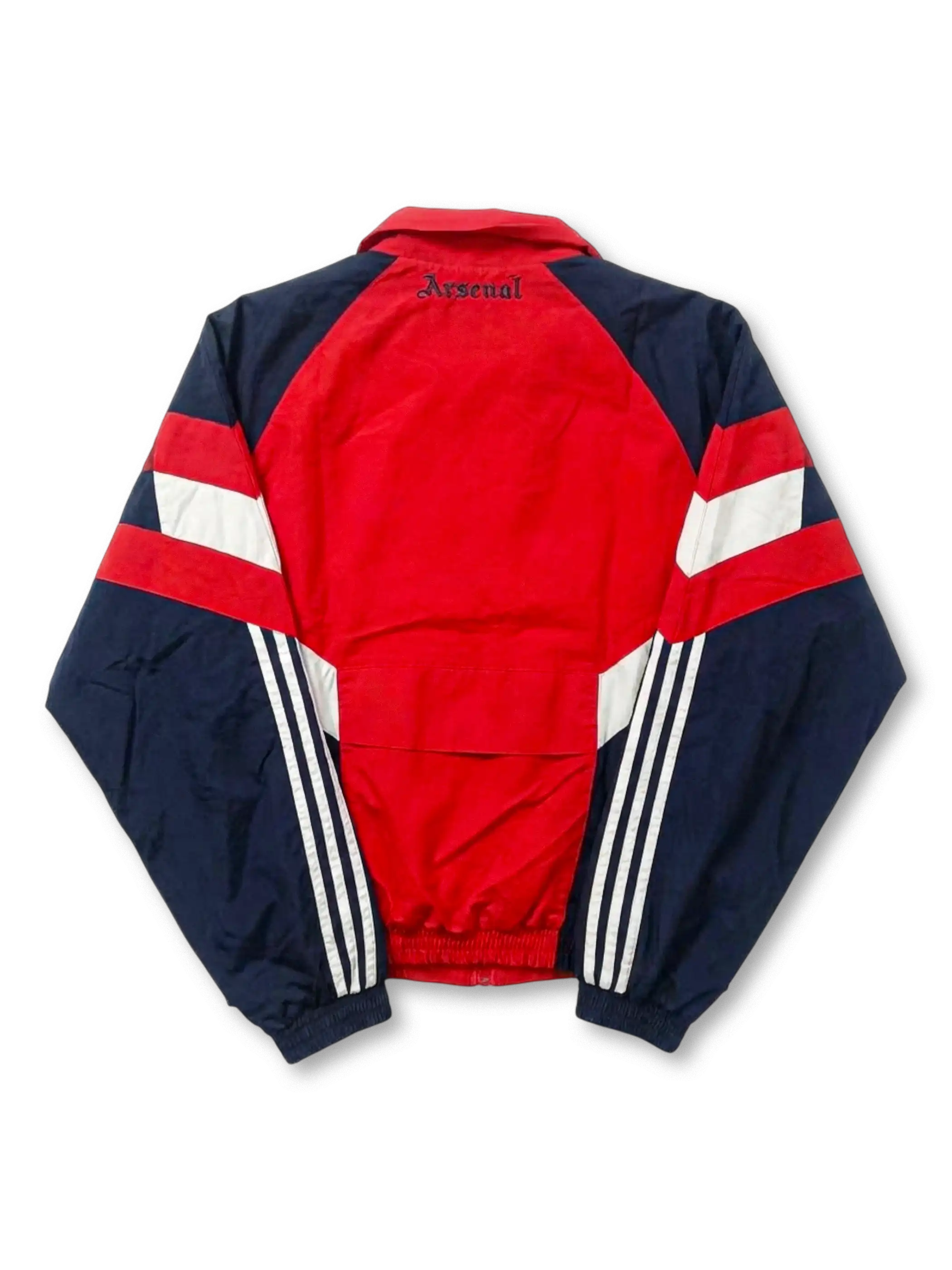 フロントに大胆なレッドパネルを配し、ネイビーのスリーブとホワイトの切り替えで構成されたクラシックデザイン。胸元にはadidasトレフォイルロゴとアーセナルのクラブエンブレムを刺繍で配置し、軽量なナイロン素材とゆとりのあるシルエットにより、当時のトレーニングウェアらしい実用性を備えている。