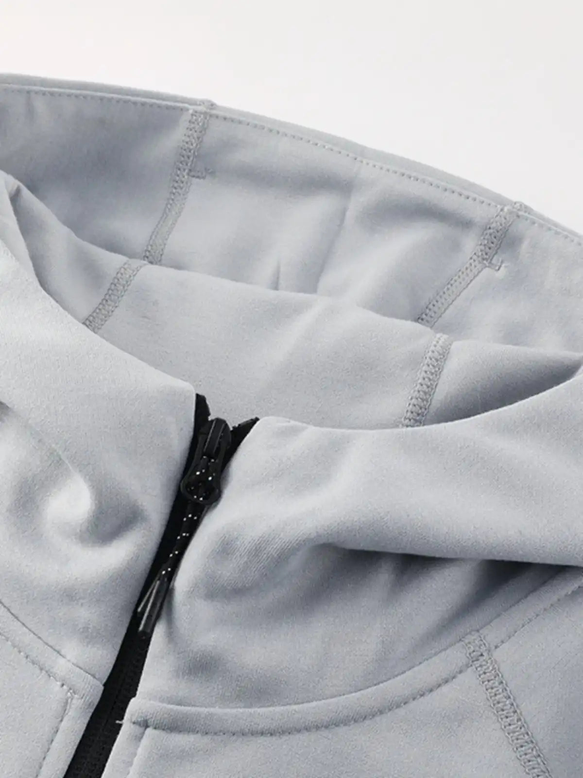 柔らかなライトグレーカラーに、同系色のクラブエンブレムとNikeスウッシュを配置。フロントとパンツには止水風ジップポケットを備え、実用性を重視した設計。フーデッド仕様と立体的なパネル構成により、トレーニングから日常使いまで対応する。
